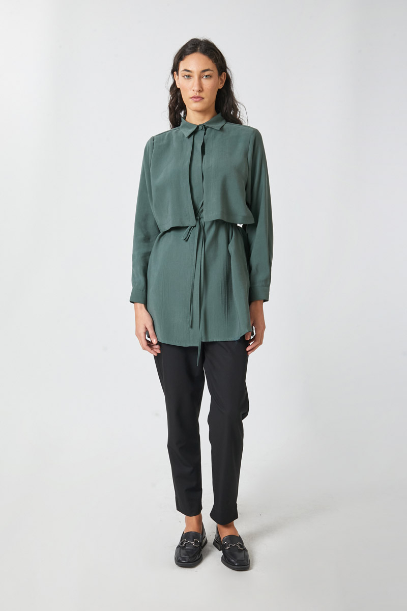 Rüzgarlıklı Tensel Gömlek Zümrüt. Gömlek yakadır, önden düğmeli ve rüzgarlık detaylıdır, biye kuşaklıdır, bilekleri manşetlidir. Günlük kullanım ve özel günlerinizde tercih edebilirsiniz.