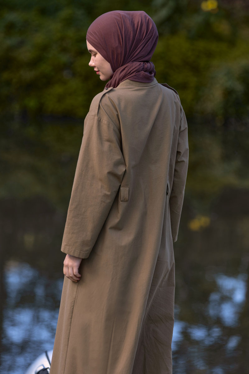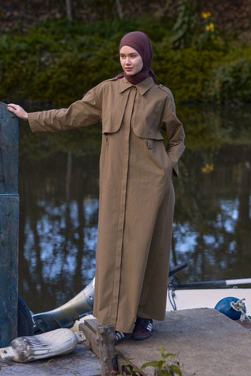 Rüzgarlıklı Trenç Elbise Kahverengi, zamansız trençkot siluetini elbise formuyla buluşturarak klasik ve modern çizgiyi bir arada sunar. Üst kısmındaki rüzgarlık detayı ve omuz apoletleri tasarıma dinamik bir hava katarken, bel kısmındaki kuşak detayı vücut formunu zarifçe vurgular. Uzun formu ve hafif dökümlü yapısı sayesinde mevsim geçişlerinde hem konforlu hem de şık bir kullanım sunar. Günlük şehir stilinden özel davet kombinlerine kadar geniş bir kullanım alanına sahiptir.