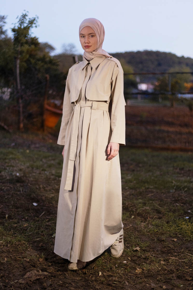 Rüzgarlıklı Trenç Elbise Taş, zamansız trençkot siluetini elbise formuyla buluşturarak klasik ve modern çizgiyi bir arada sunar. Üst kısmındaki rüzgarlık detayı ve omuz apoletleri tasarıma dinamik bir hava katarken, bel kısmındaki kuşak detayı vücut formunu zarifçe vurgular. Uzun formu ve hafif dökümlü yapısı sayesinde mevsim geçişlerinde hem konforlu hem de şık bir kullanım sunar. Günlük şehir stilinden özel davet kombinlerine kadar geniş bir kullanım alanına sahiptir.