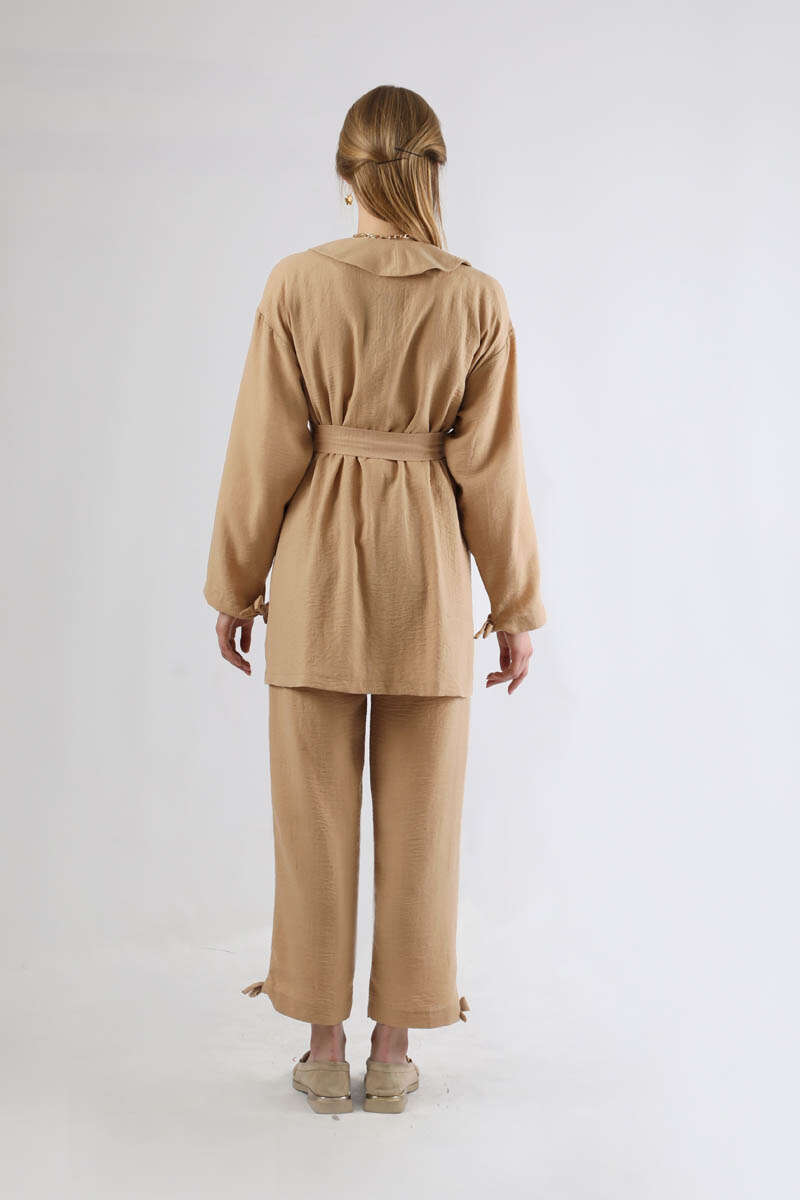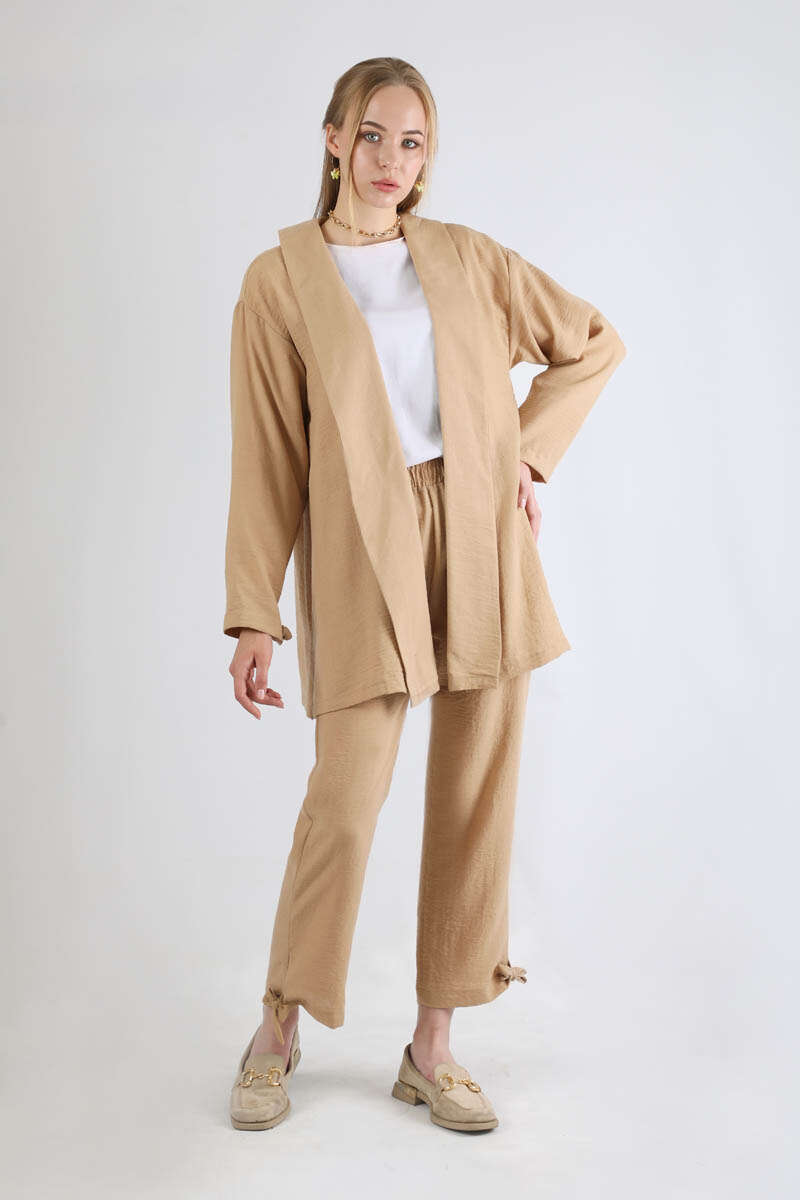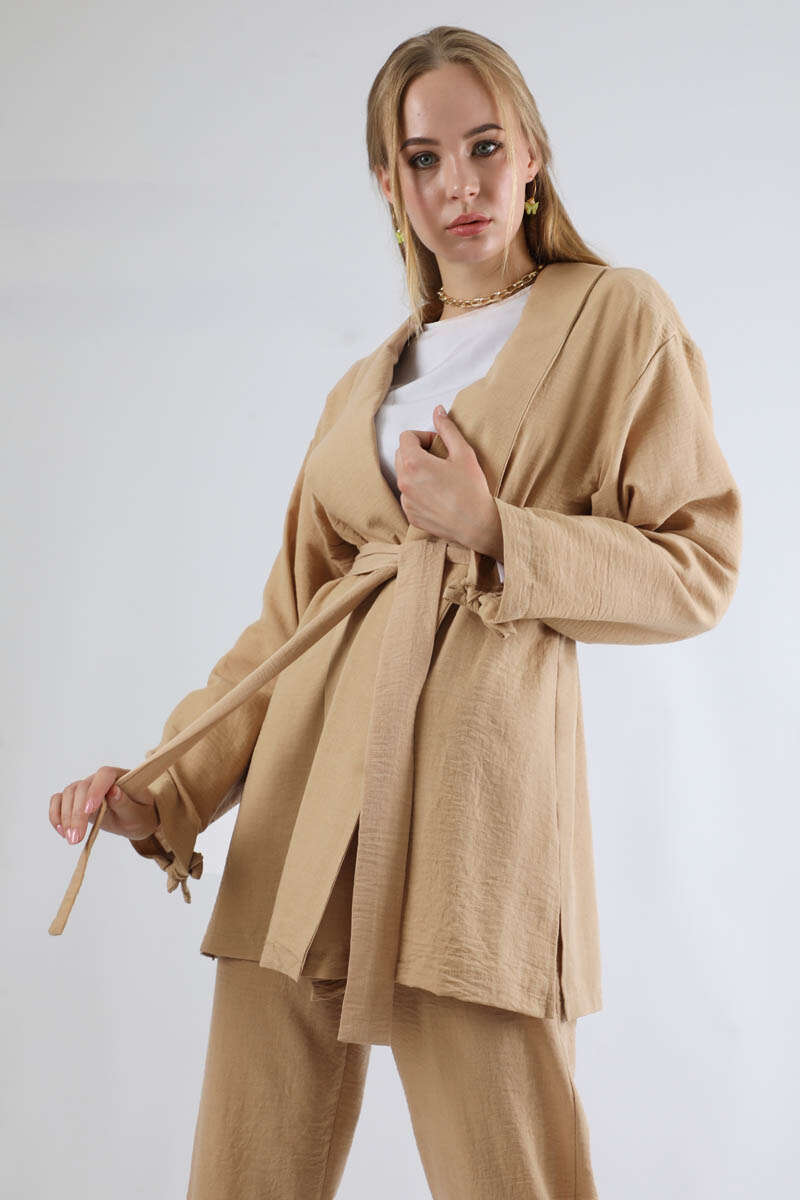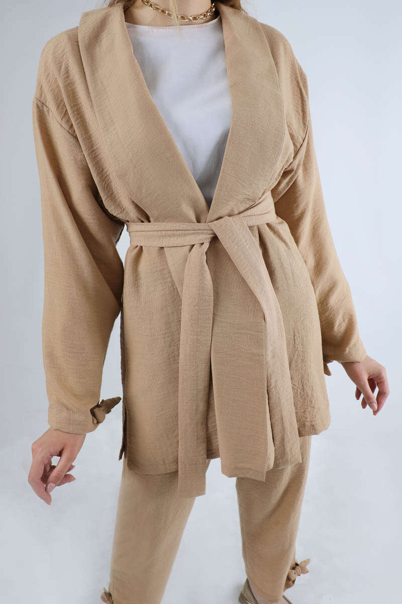 Şal Yaka Kimono Takım Bej. Paçası ve kol ağzı bağcıklıdır. Kimono yandan yırtmaçlıdır, şal yakalıdır. Pantolon beli lastiklidir. Pantolon ceplidir. Kuşaklıdır. Günlük kullanım ve Özel günlerinizde tercih edebilirsiniz.