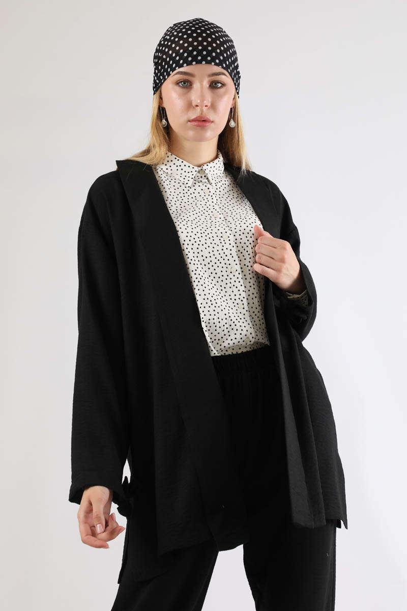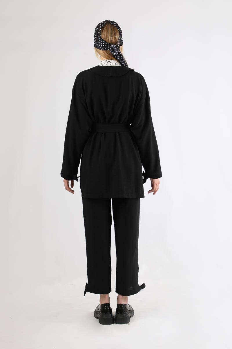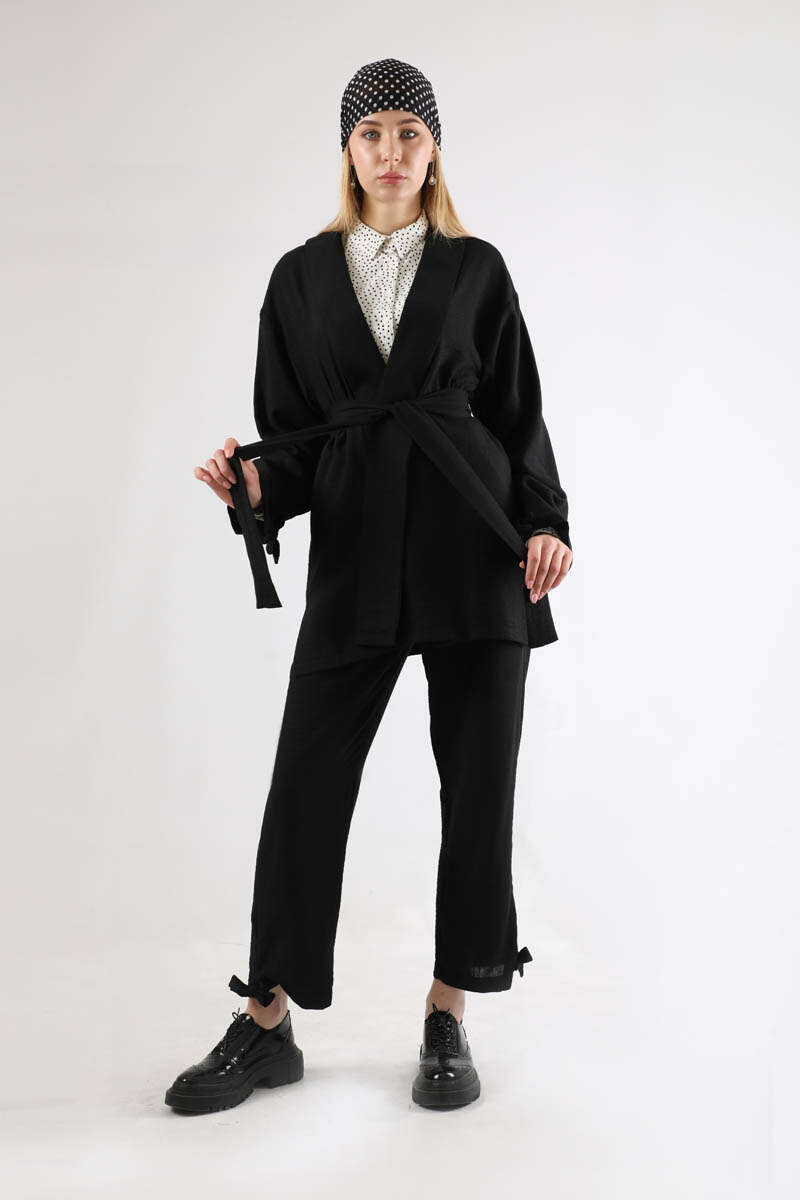 Şal Yaka Kimono Takım Siyah. Paçası ve kol ağzı bağcıklıdır. Kimono yandan yırtmaçlıdır, şal yakalıdır. Pantolon beli lastiklidir. Pantolon ceplidir. Kuşaklıdır. Günlük kullanım ve Özel günlerinizde tercih edebilirsiniz.