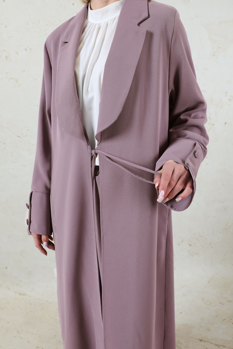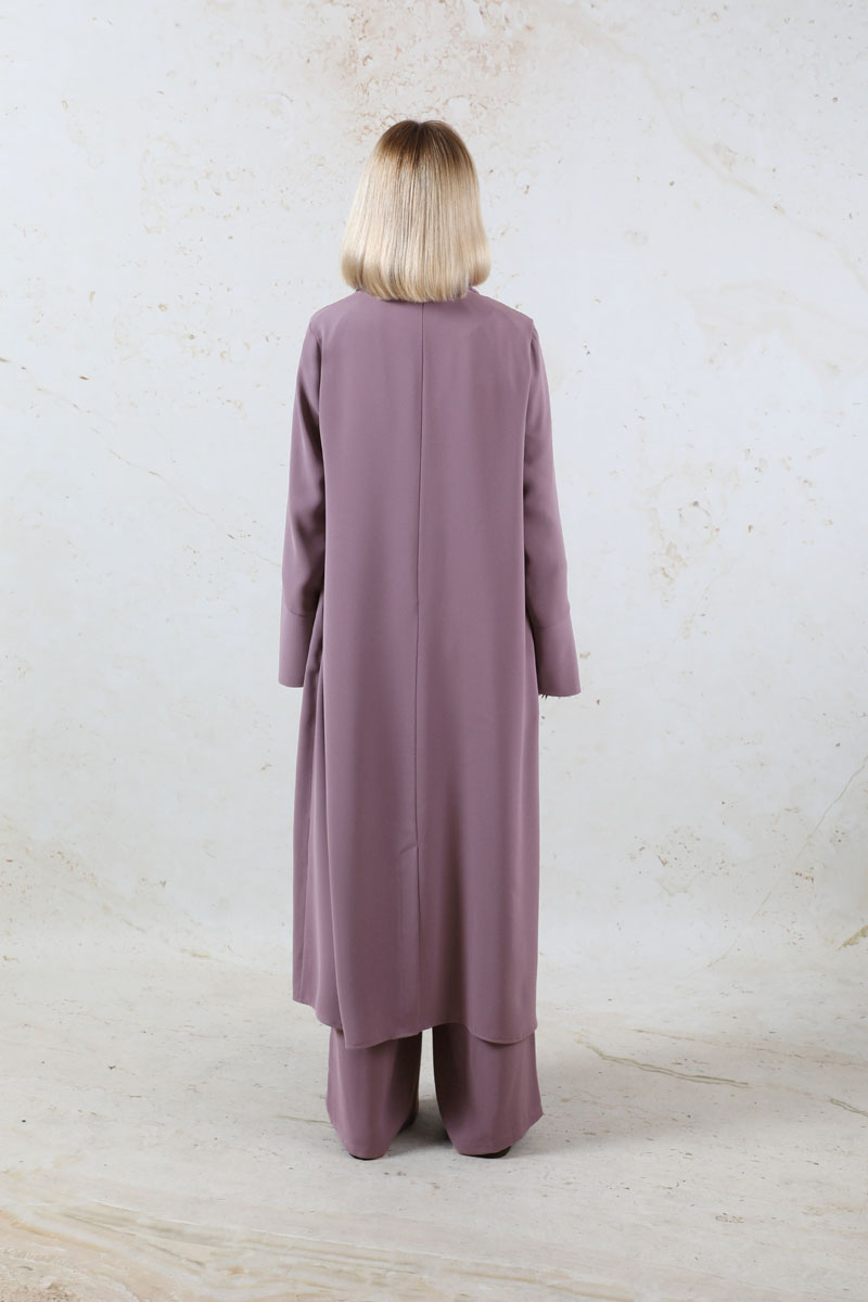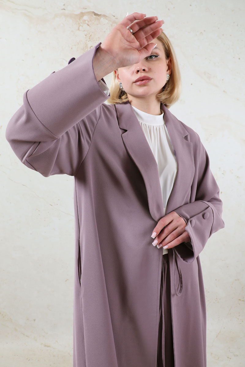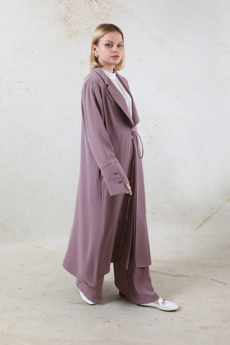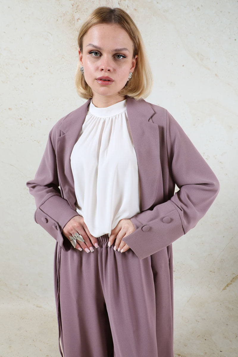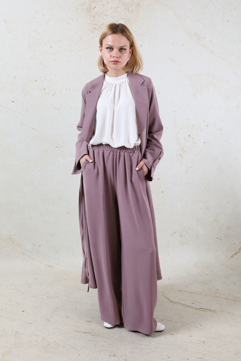 Şal Yaka Krep Takım Lila. Önden bağlama detaylı, şal yaka, manşetleri asimetrik ve kalındır. Pantolon beli lastikli, yandan ceplidir. İkili takım olarak satılmaktadır. Günlük kullanıma uygundur.