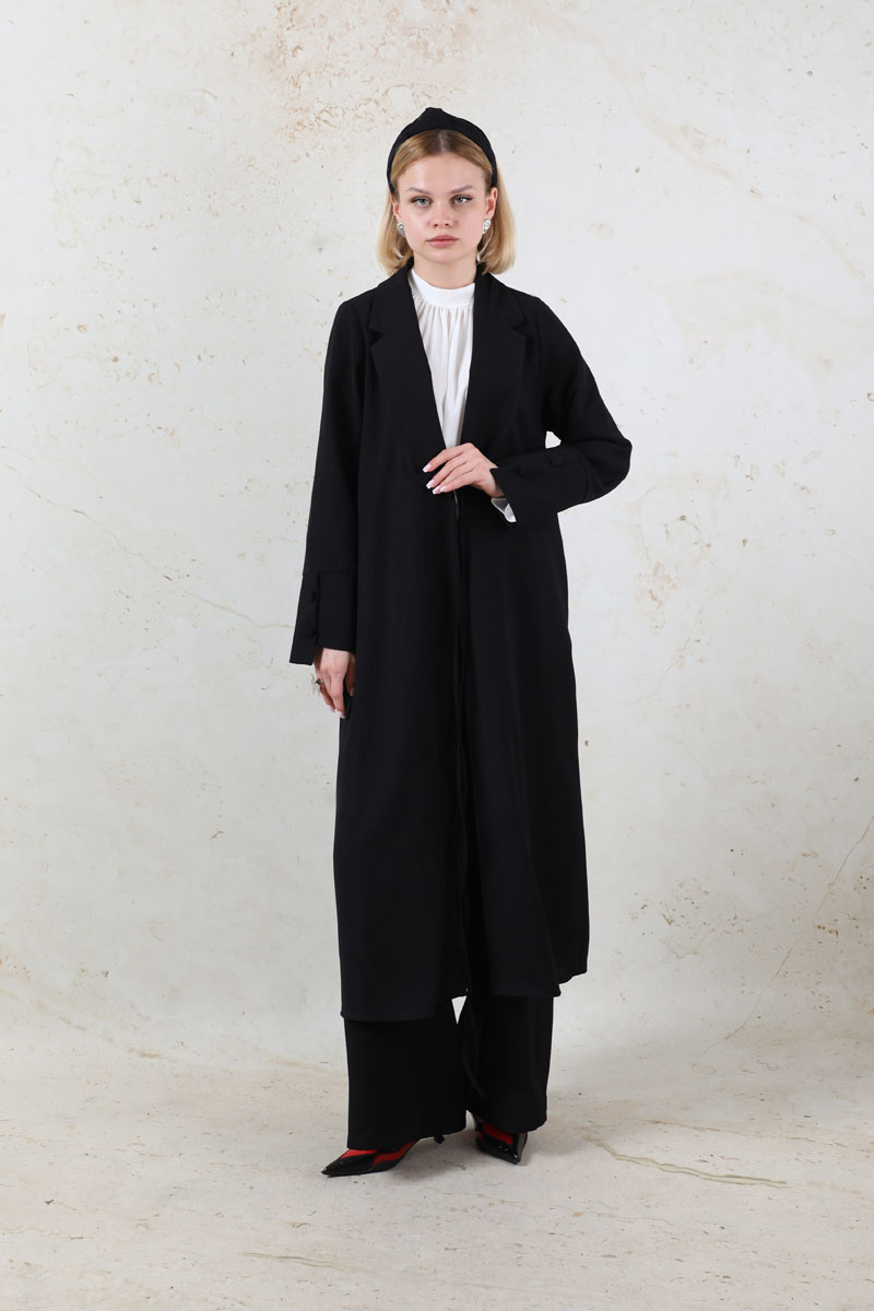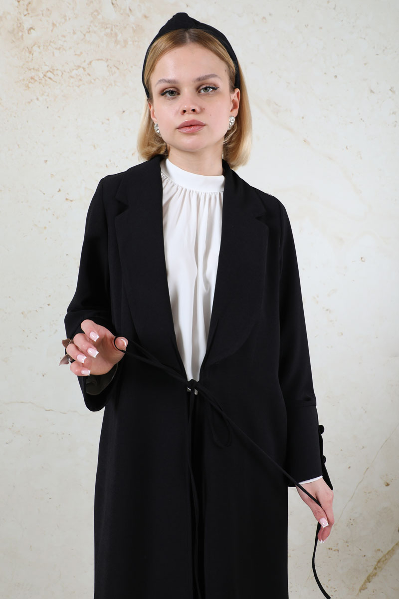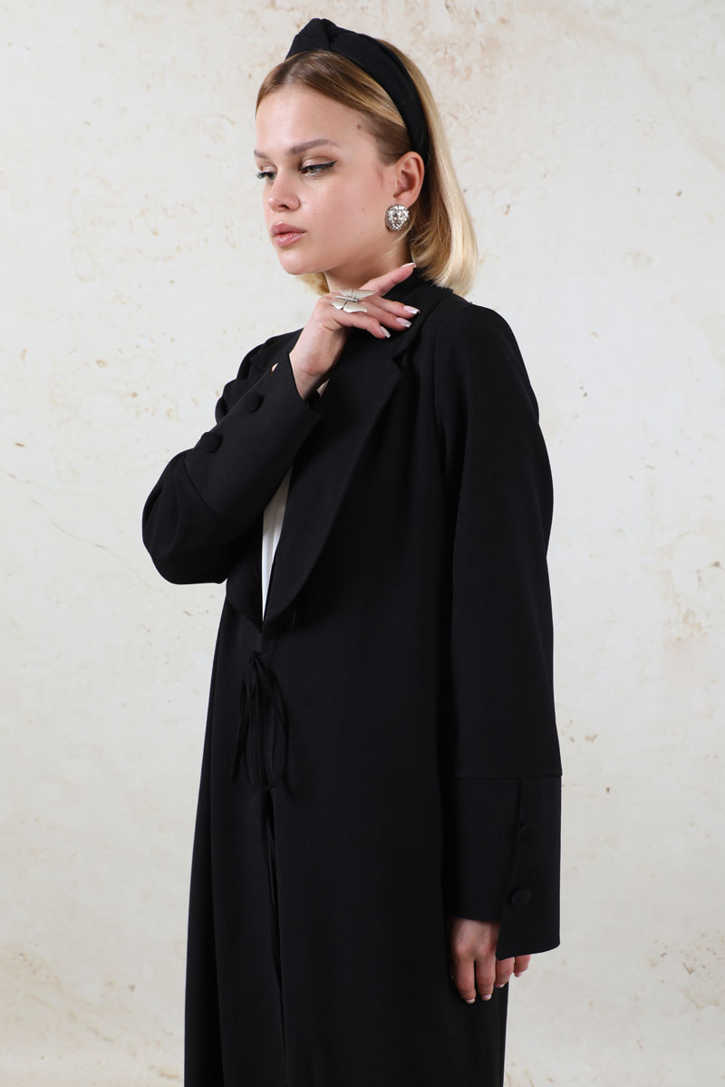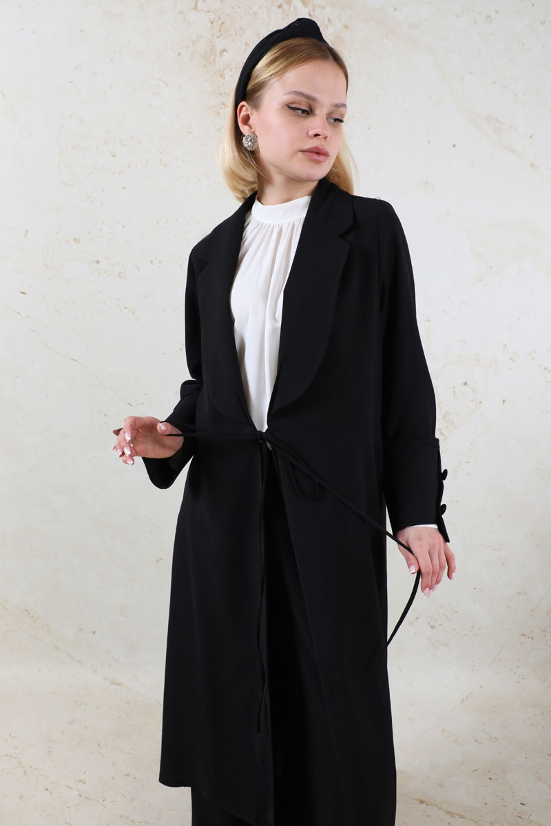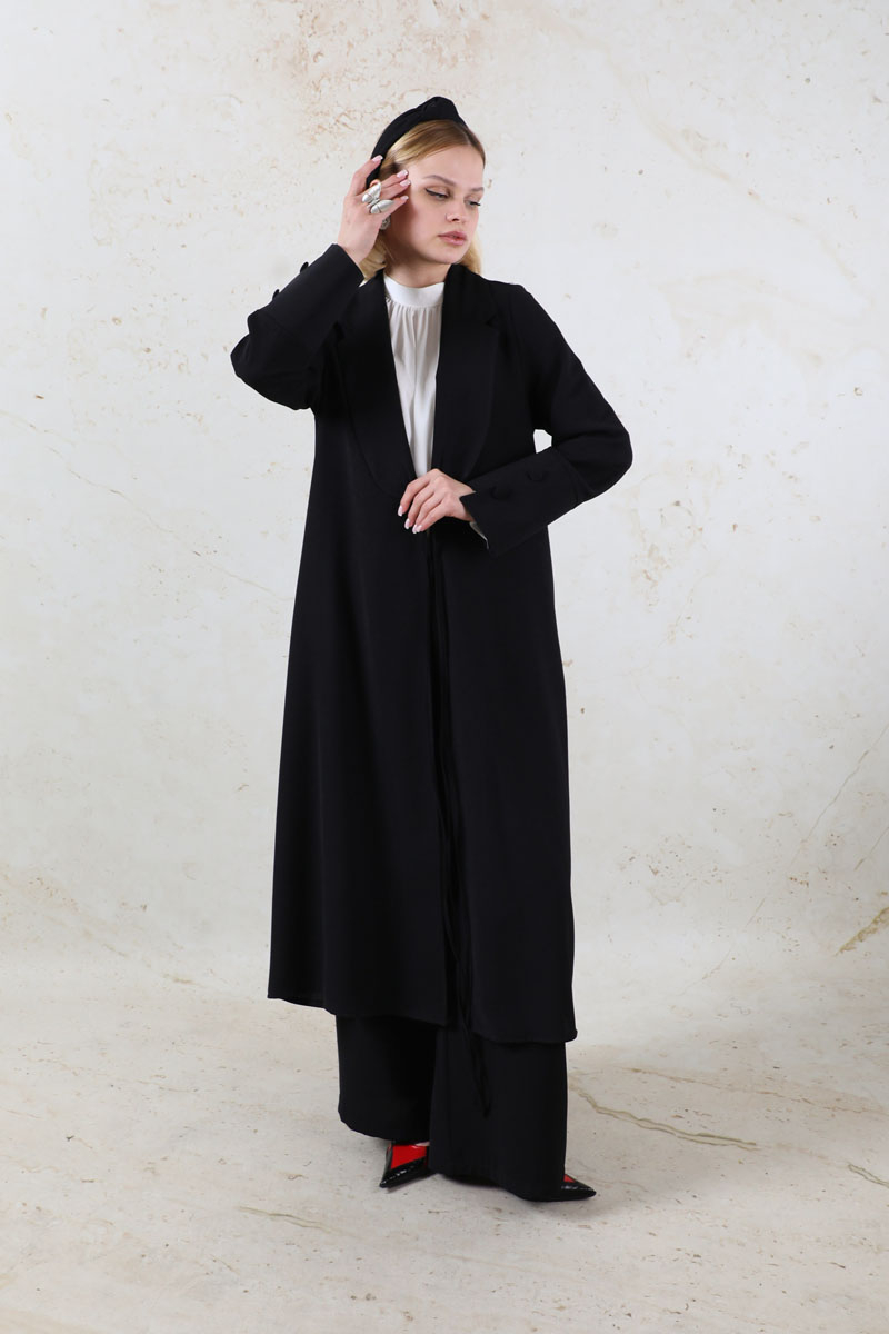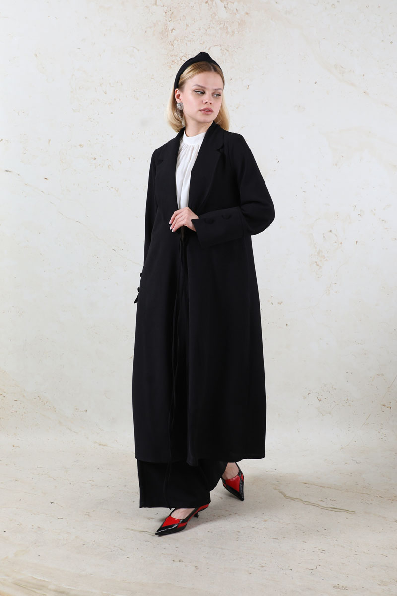 Şal Yaka Krep Takım Siyah. Önden bağlama detaylı, şal yaka, manşetleri asimetrik ve kalındır. Pantolon beli lastikli, yandan ceplidir. İkili takım olarak satılmaktadır. Günlük kullanıma uygundur.