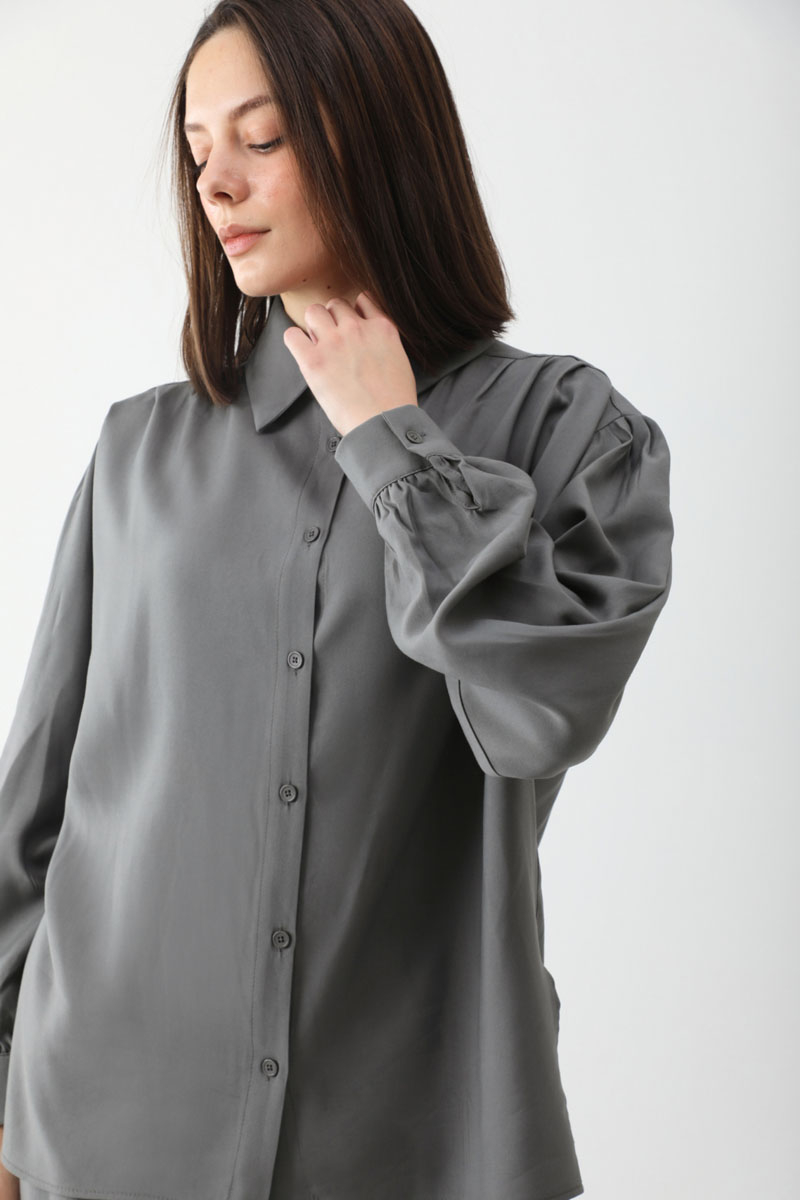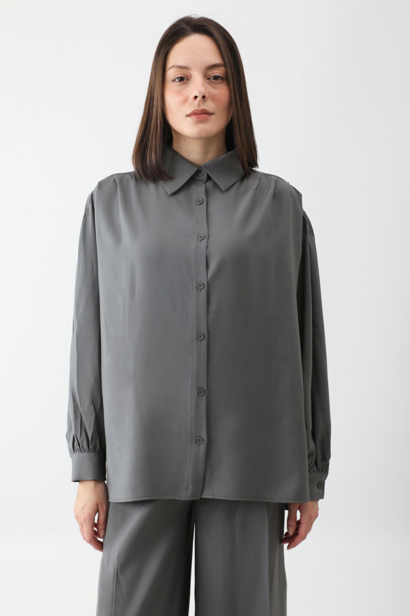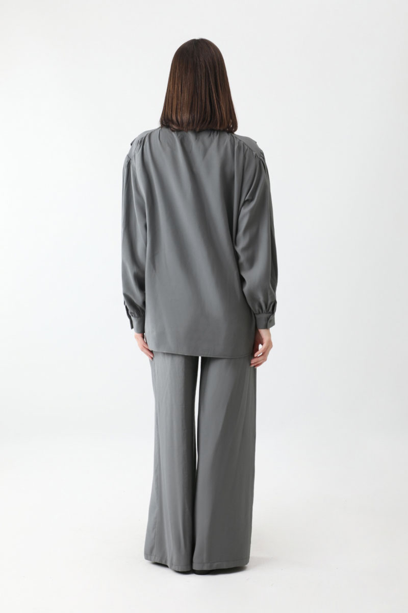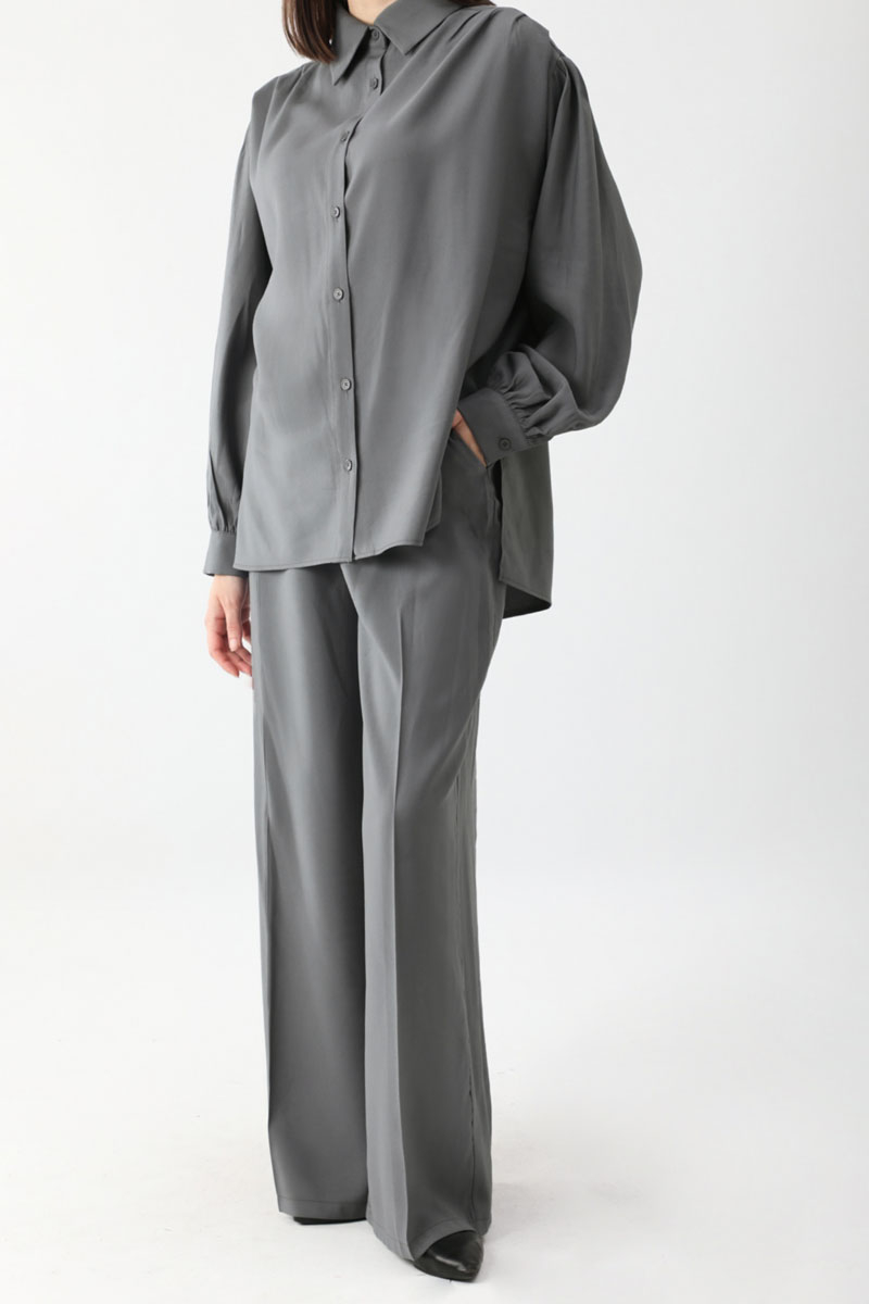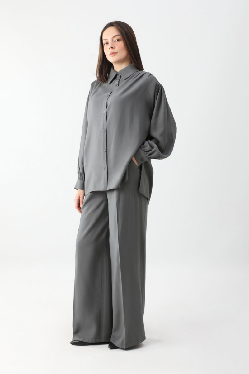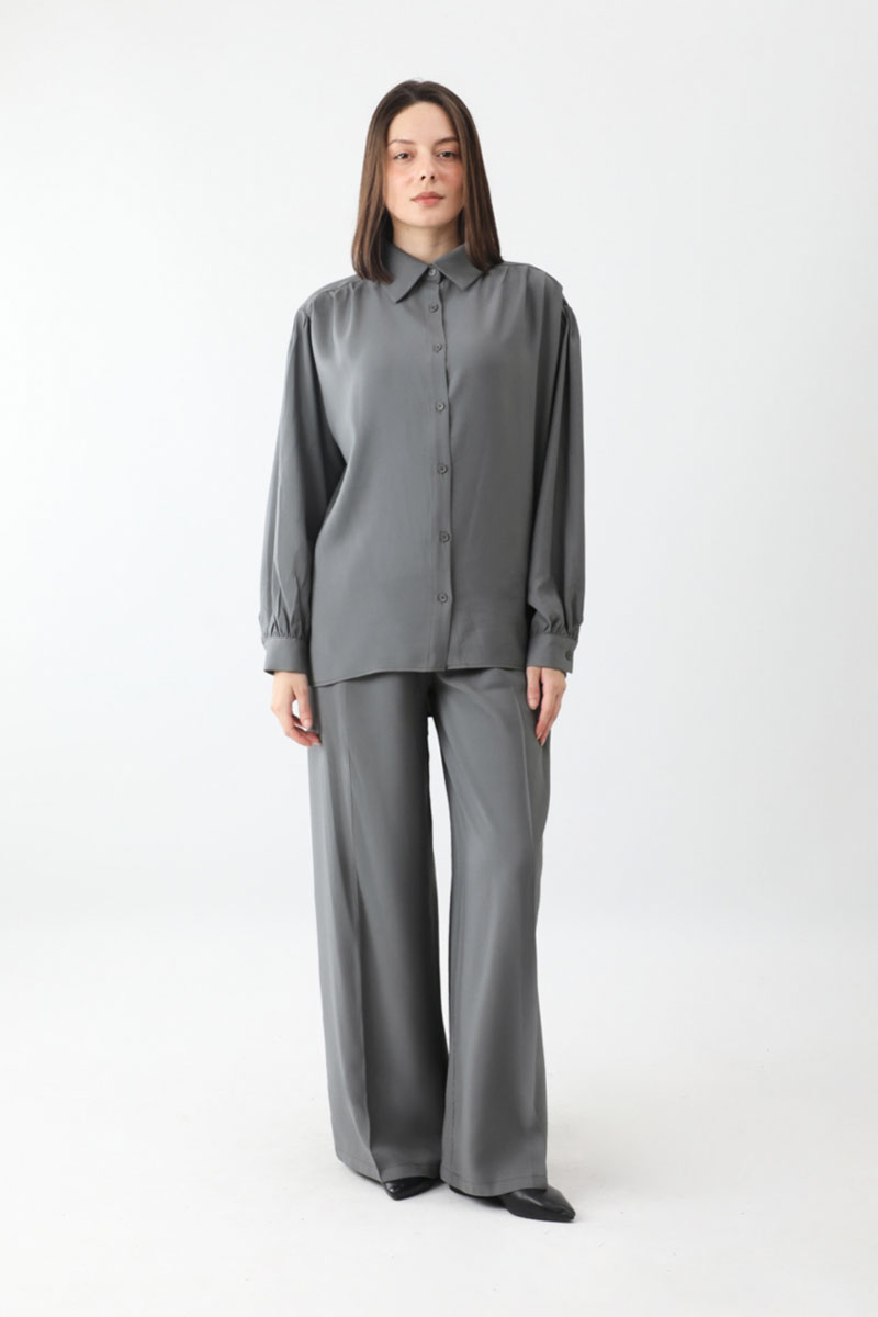 Salaş Pantolonlu Takım Füme. Gömlek yakadır, önden düğmelidir, düşük omuzludur, omuz ve manşetlerinde pile detaylıdır, yandan yırtmaçlıdır, Pantolon arka belden lastiklidir, önden pilelidir, yandan ceplidir, düğmeli ve fermuarlıdır. Günlük kullanım ve özel günlerinizde tercih edebilirsiniz.