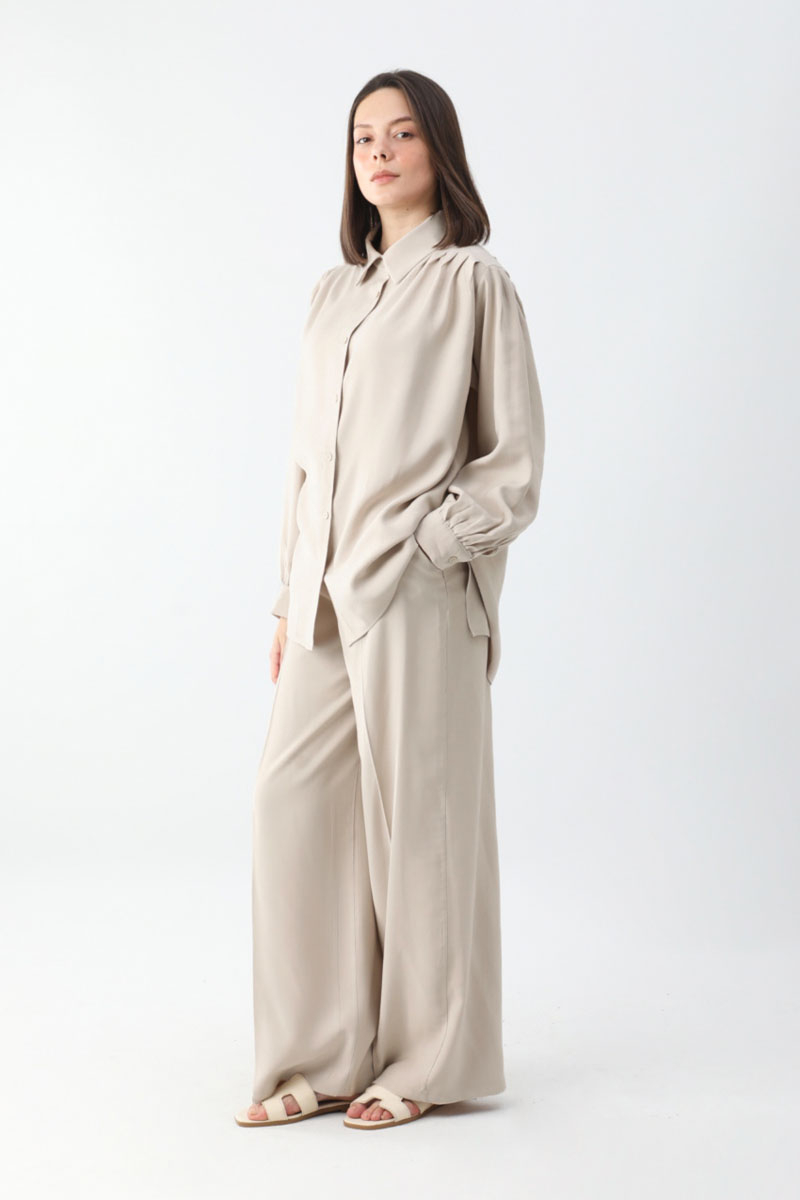 Salaş Pantolonlu Takım Taş. Gömlek yakadır, önden düğmelidir, düşük omuzludur, omuz ve manşetlerinde pile detaylıdır, yandan yırtmaçlıdır, Pantolon arka belden lastiklidir, önden pilelidir, yandan ceplidir, düğmeli ve fermuarlıdır. Günlük kullanım ve özel günlerinizde tercih edebilirsiniz.