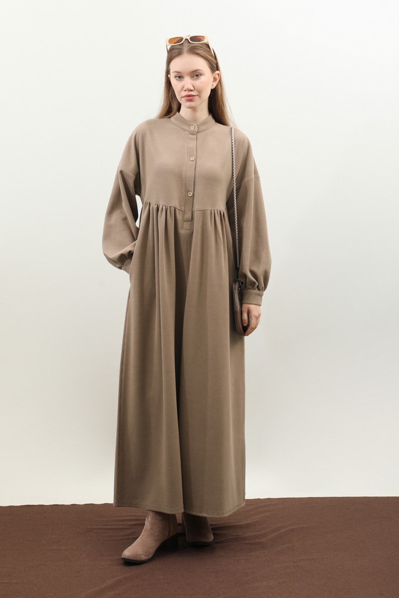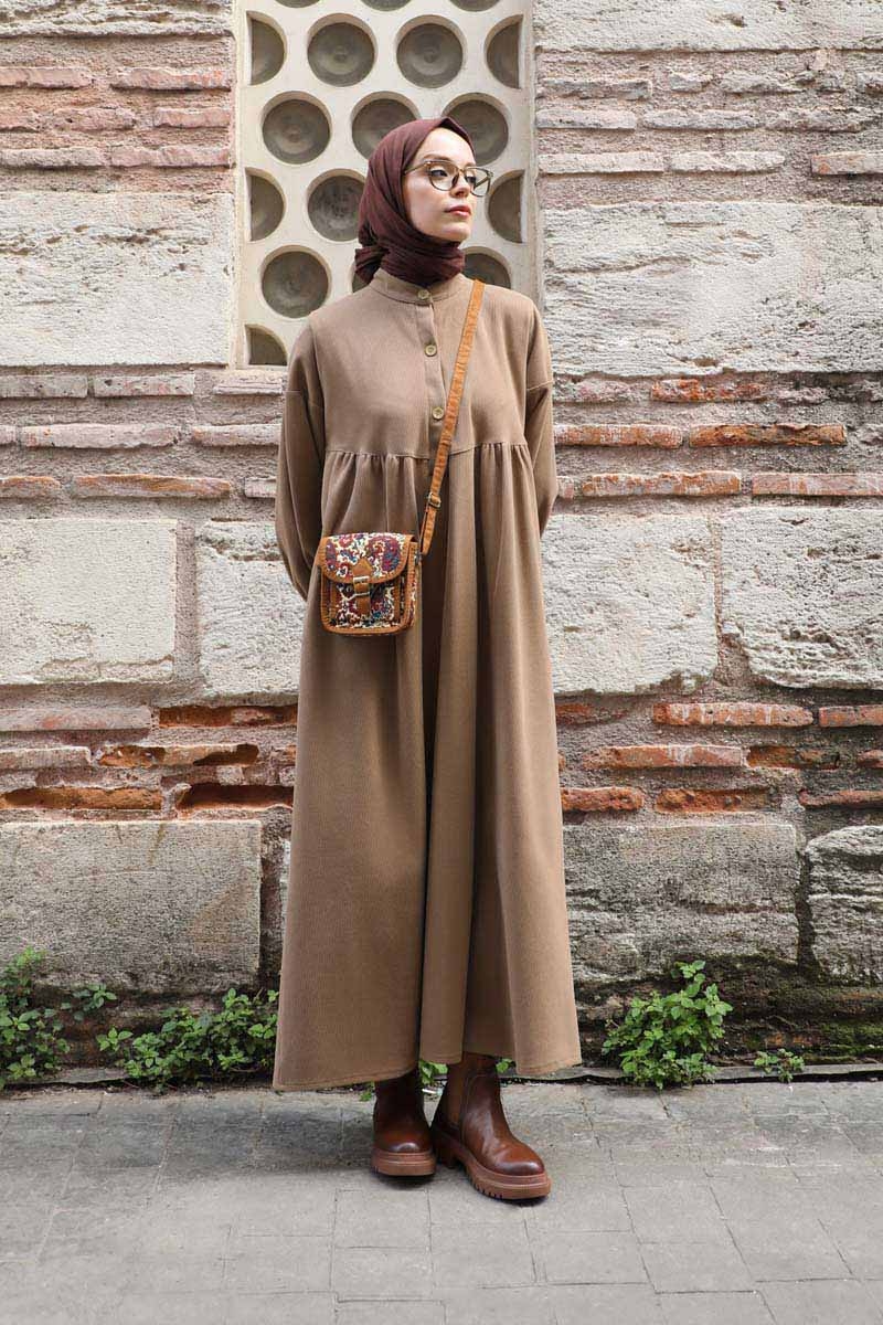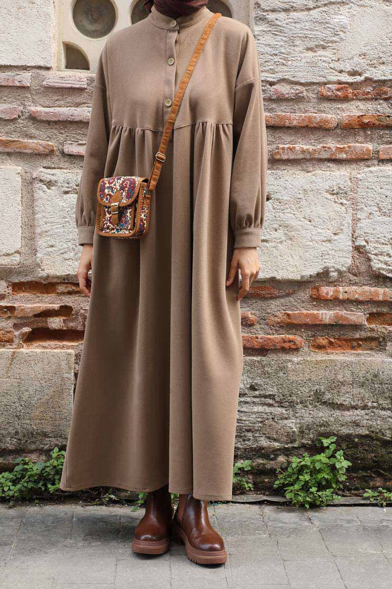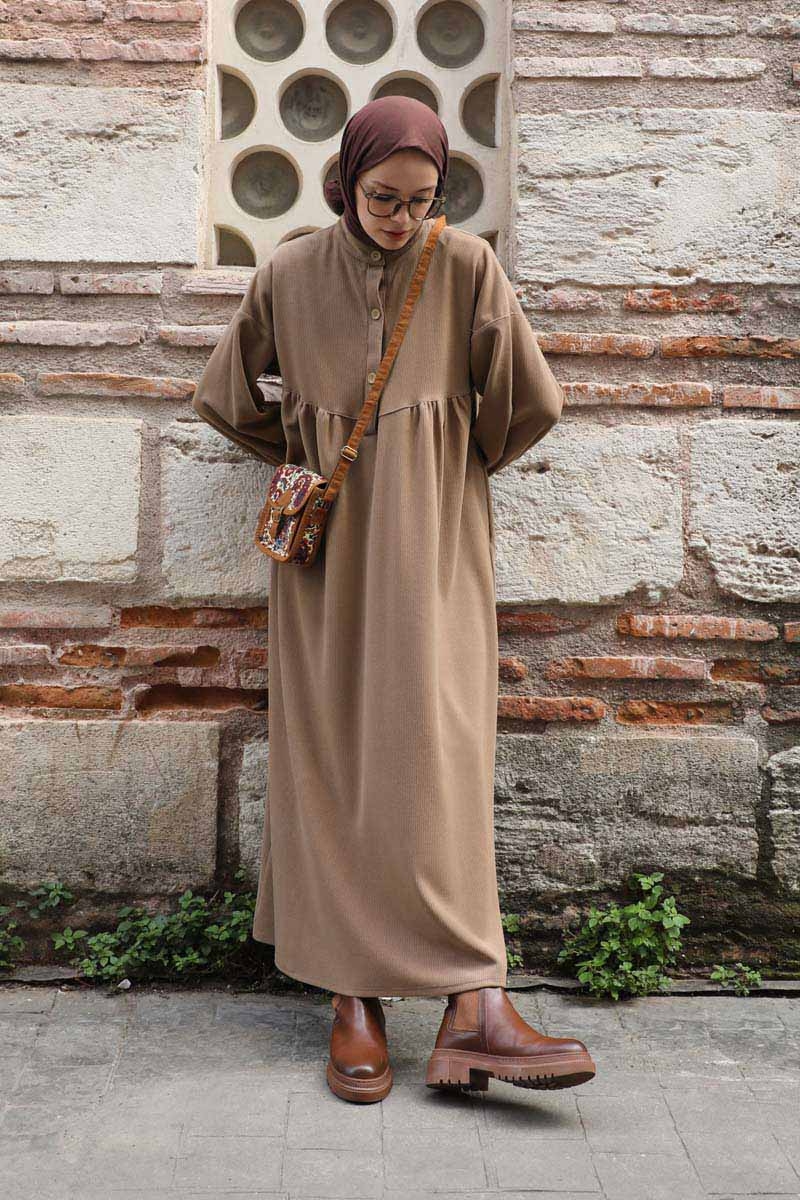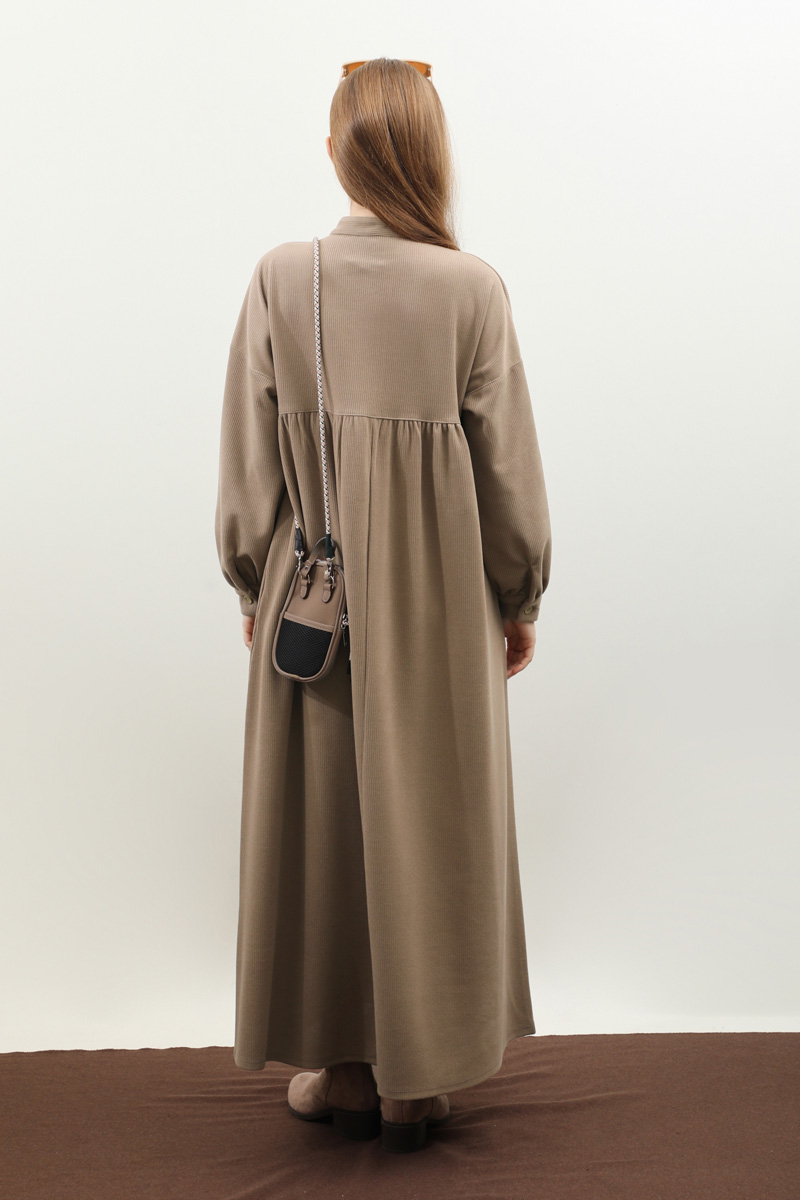 Salaş Triko Elbise Koyu Vizon. Hakim yakadır, önden düğmeli, düşük omuz, roba detaylı, manşeti düğmeli, yandan gizli cepli, kuşaksız, astarsızdır. Günlük kullanım için uygundur.