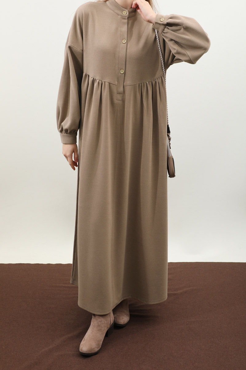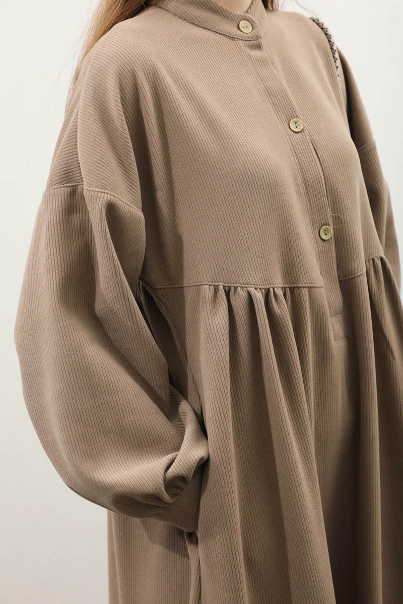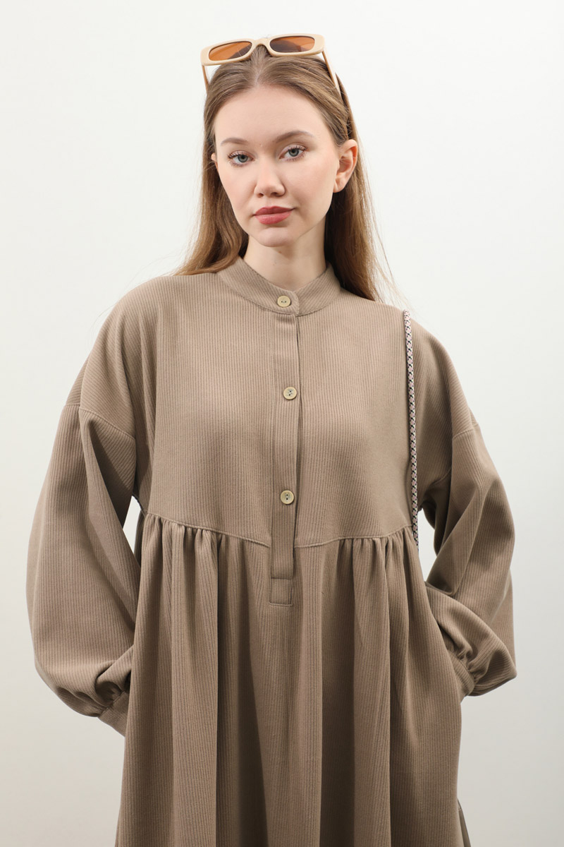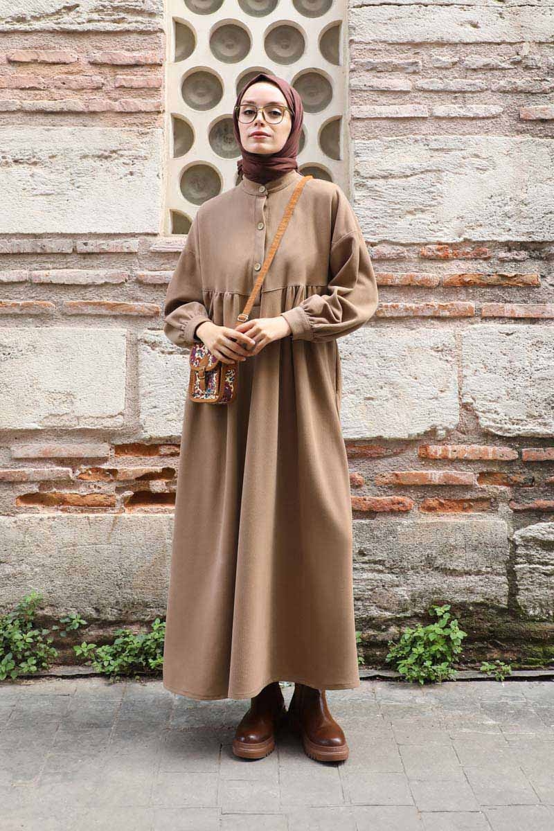Salaş Triko Elbise Koyu Vizon. Hakim yakadır, önden düğmeli, düşük omuz, roba detaylı, manşeti düğmeli, yandan gizli cepli, kuşaksız, astarsızdır. Günlük kullanım için uygundur.