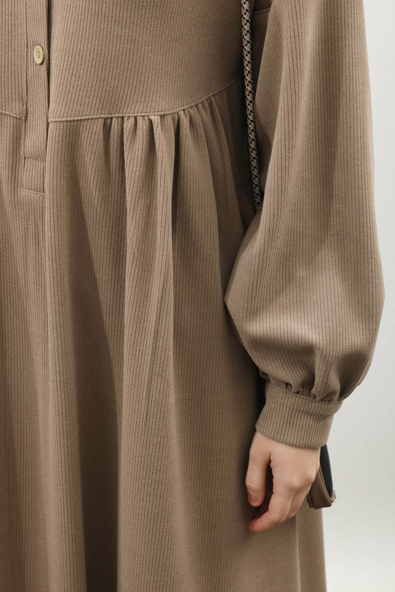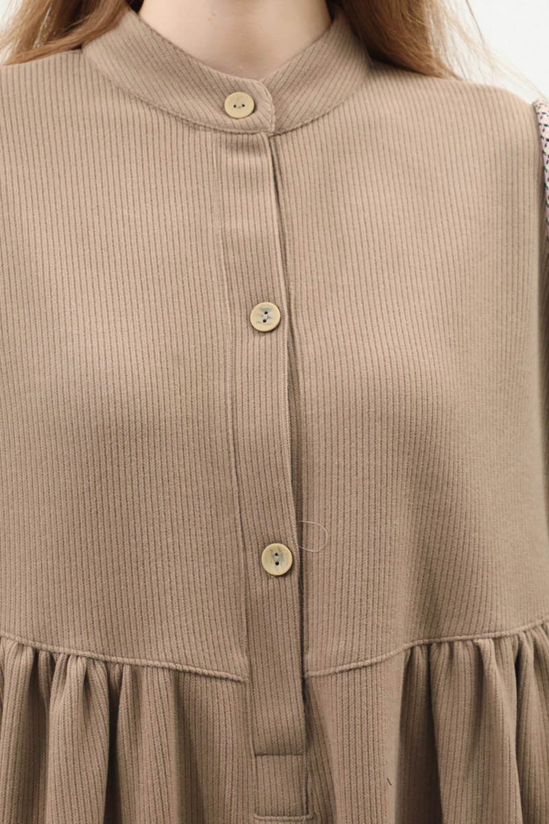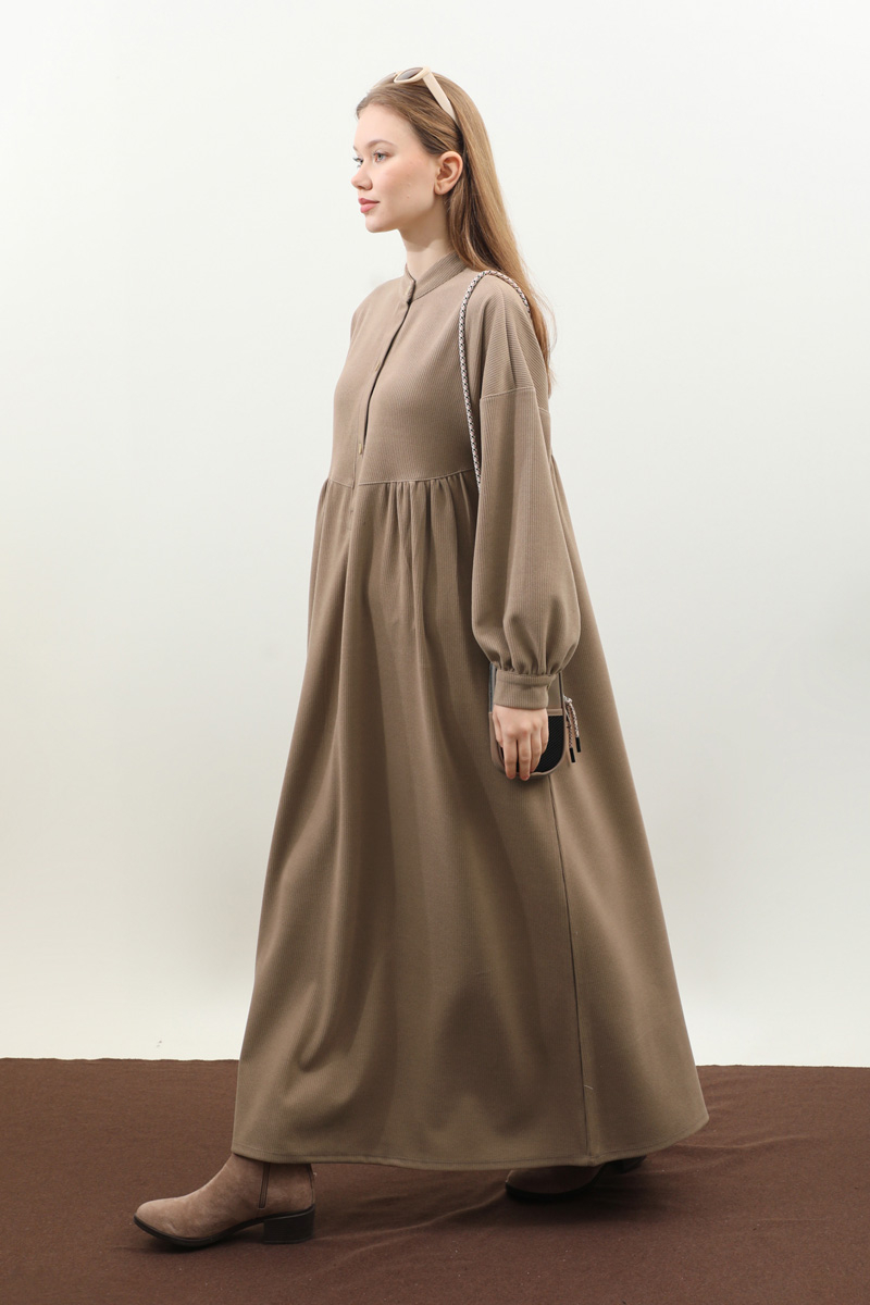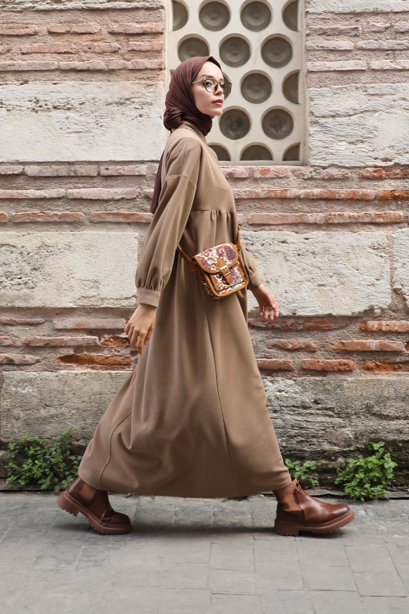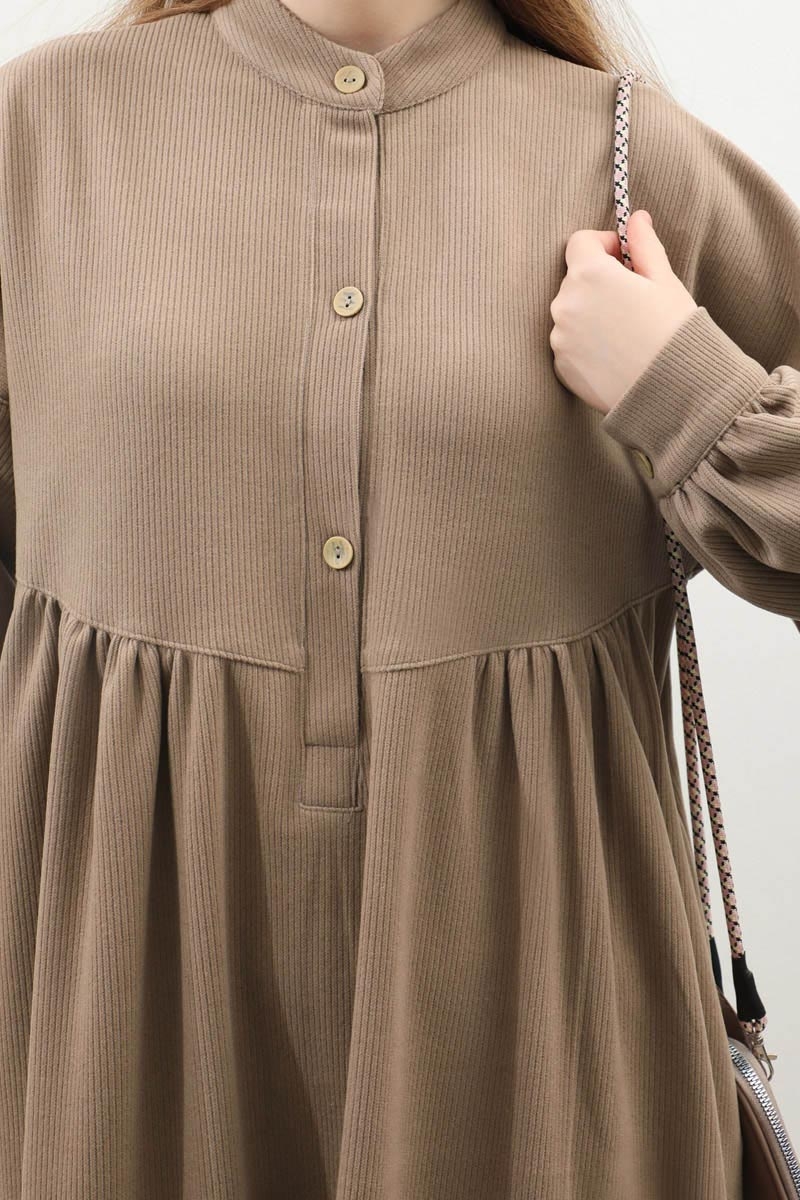 Salaş Triko Elbise Koyu Vizon. Hakim yakadır, önden düğmeli, düşük omuz, roba detaylı, manşeti düğmeli, yandan gizli cepli, kuşaksız, astarsızdır. Günlük kullanım için uygundur.