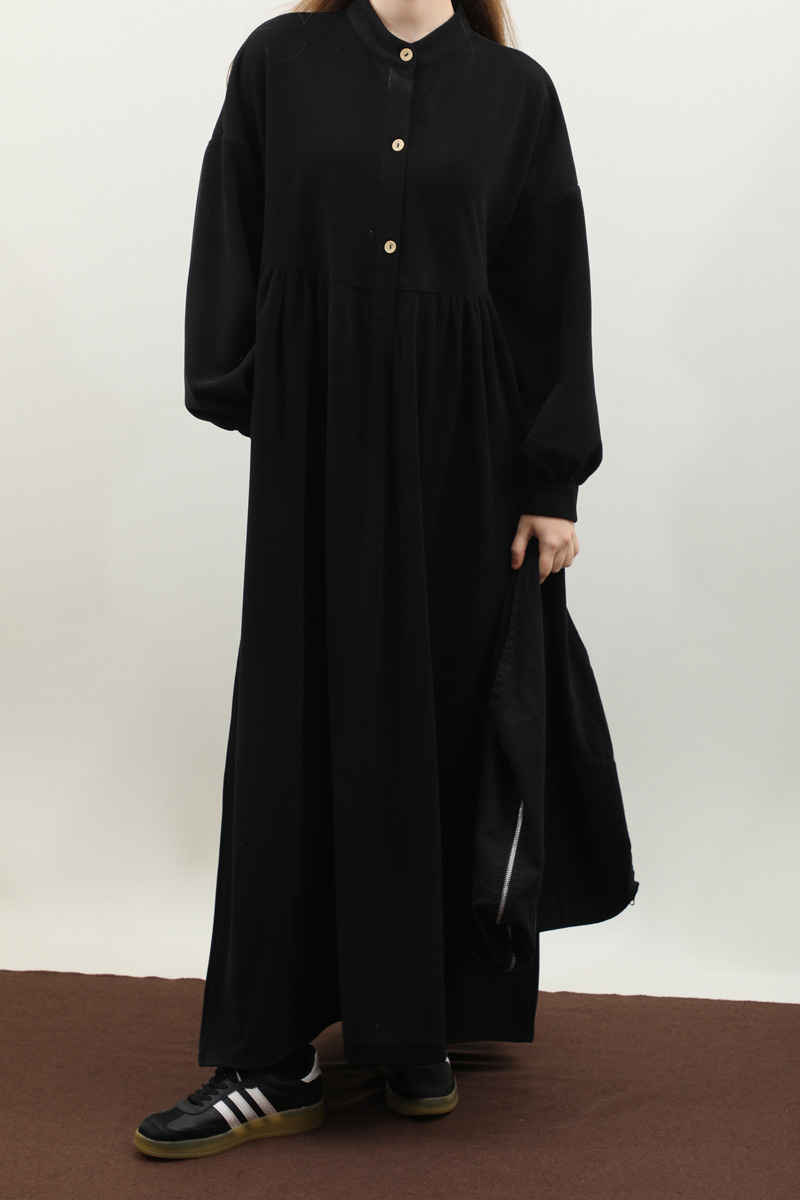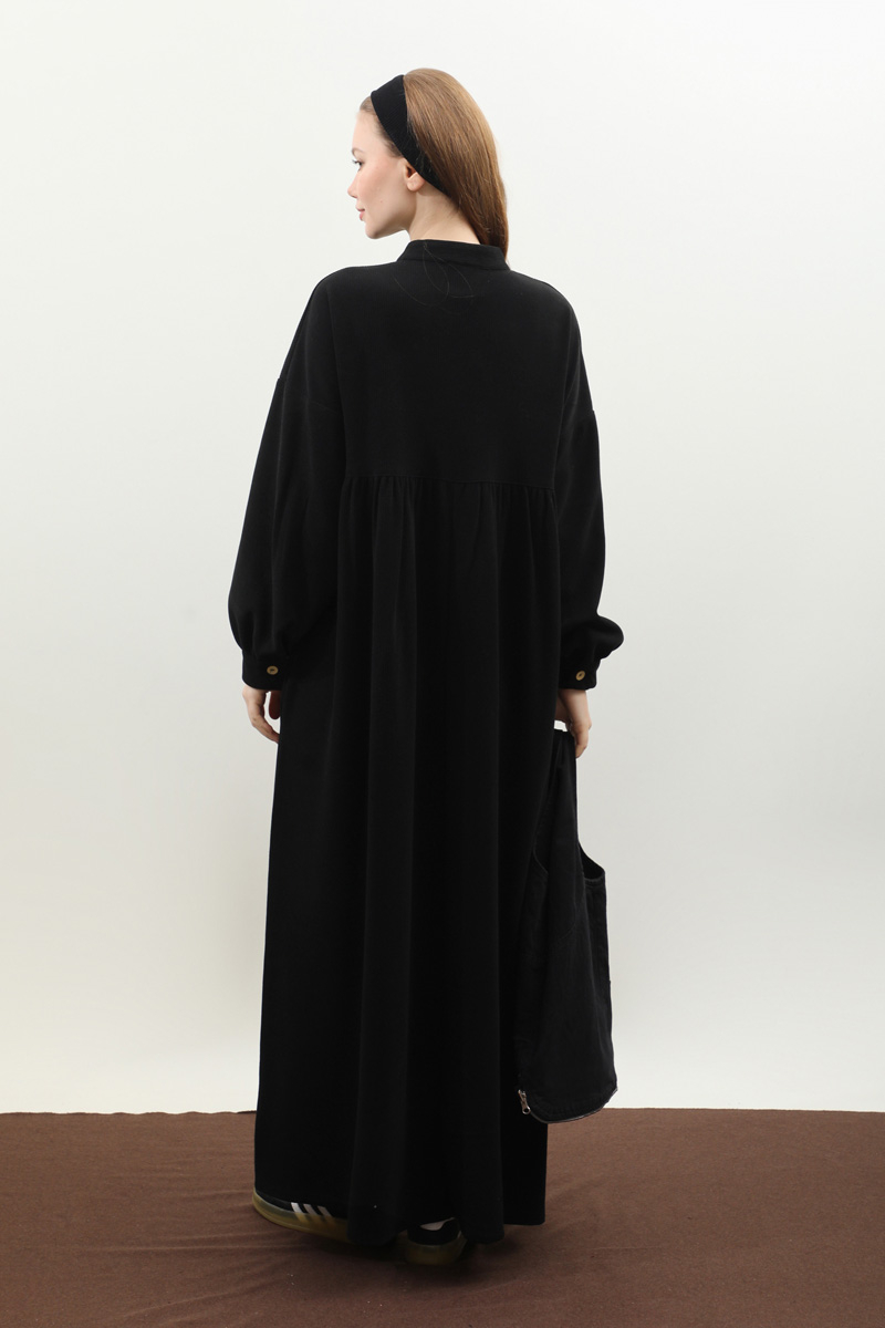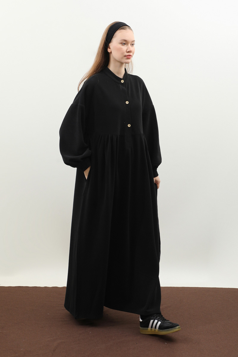Salaş Triko Elbise Siyah. Hakim yakadır, önden düğmeli, düşük omuz, roba detaylı, manşeti düğmeli, yandan gizli cepli, kuşaksız, astarsızdır. Günlük kullanım için uygundur.