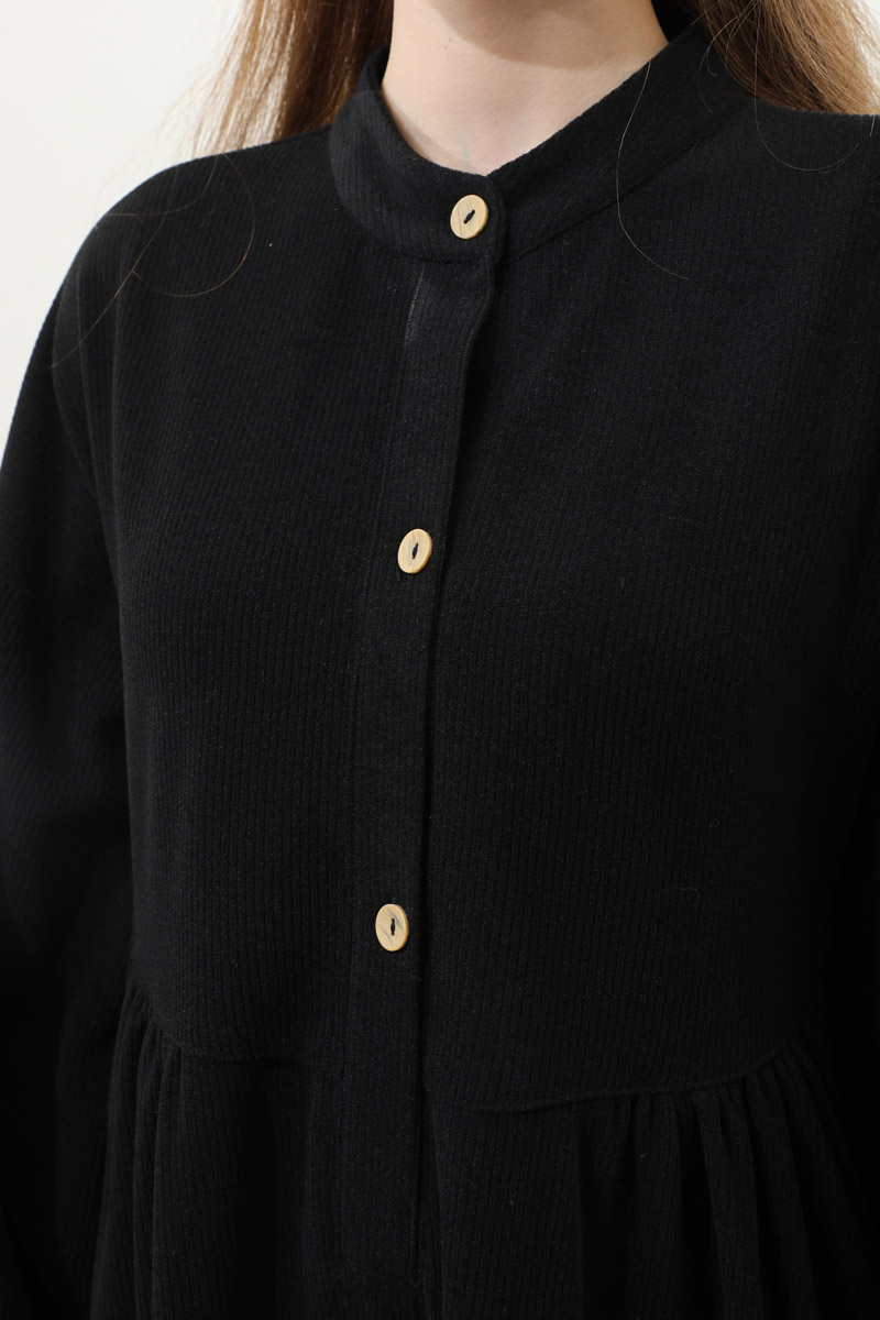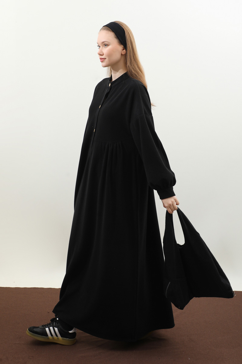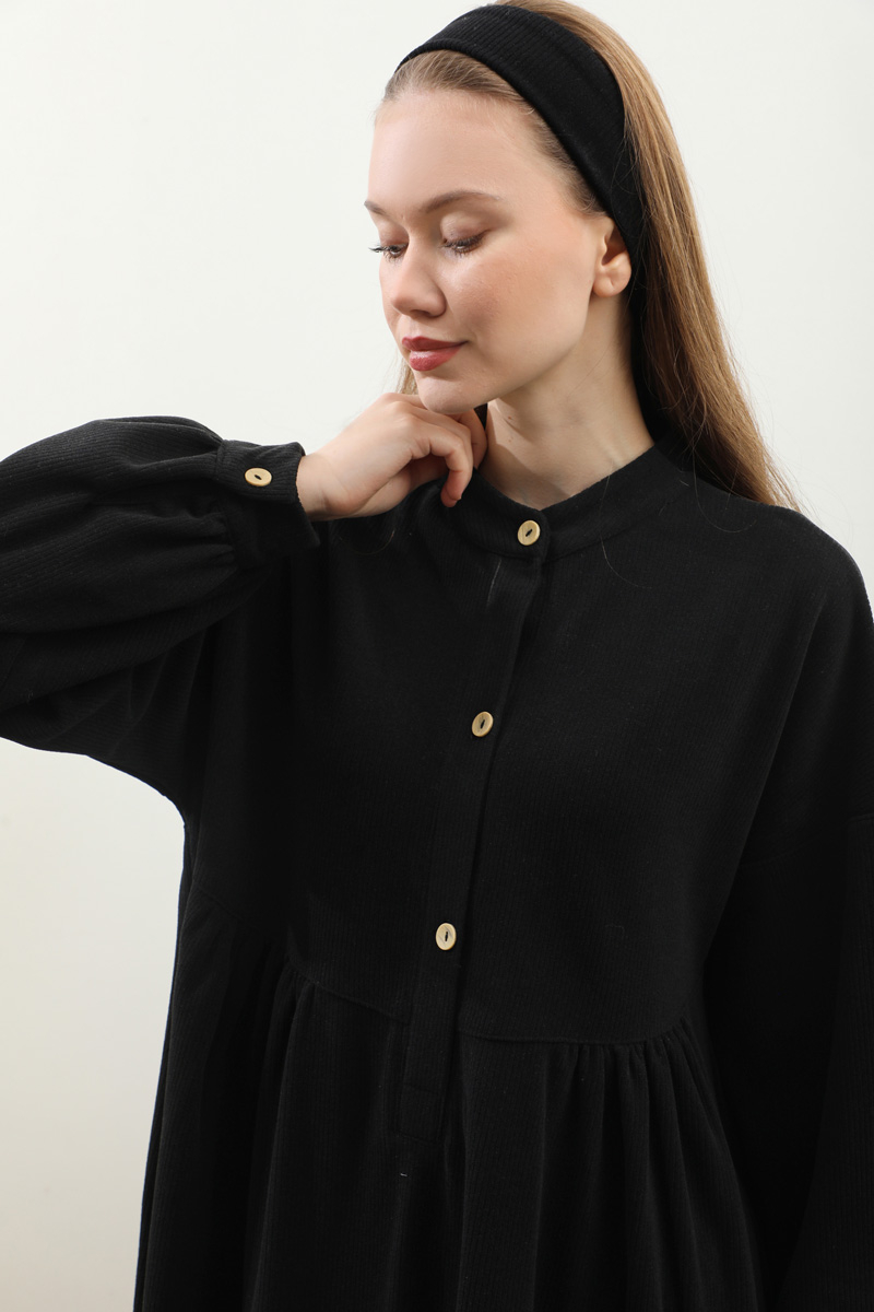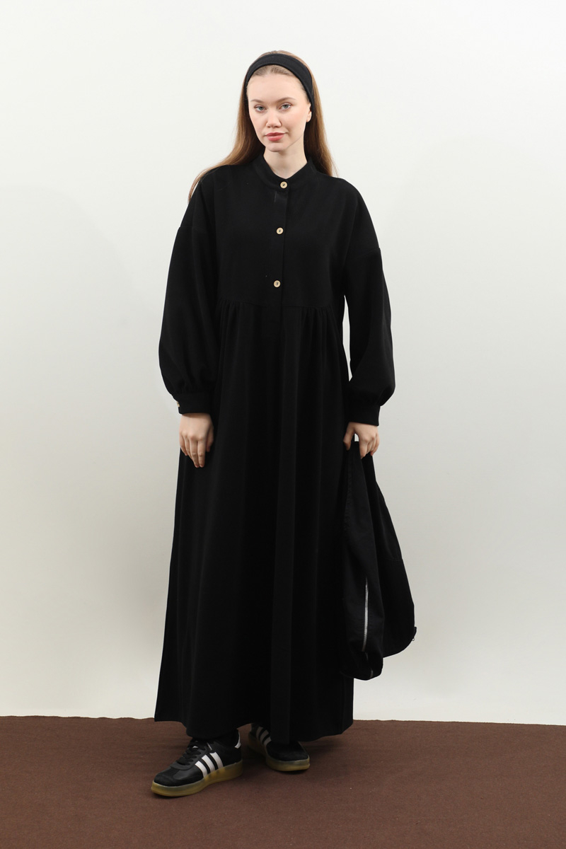 Salaş Triko Elbise Siyah. Hakim yakadır, önden düğmeli, düşük omuz, roba detaylı, manşeti düğmeli, yandan gizli cepli, kuşaksız, astarsızdır. Günlük kullanım için uygundur.