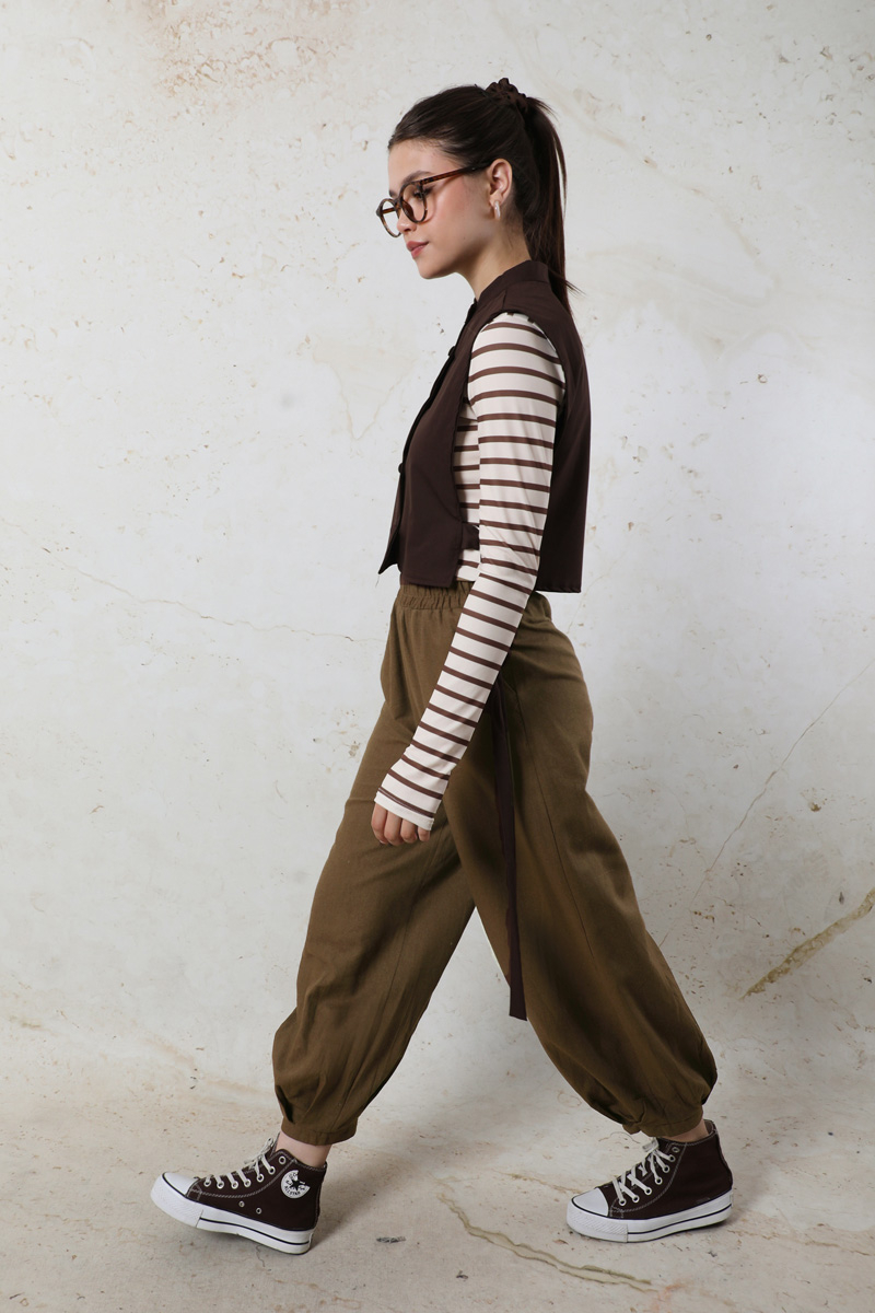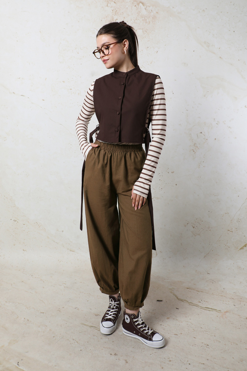 Şalvar Pantolon Kahverengi. Pantolon bel lastikli, paçası manşet detaylı ve büzgülüdür. Yandan cepldir.