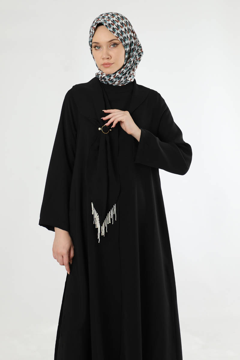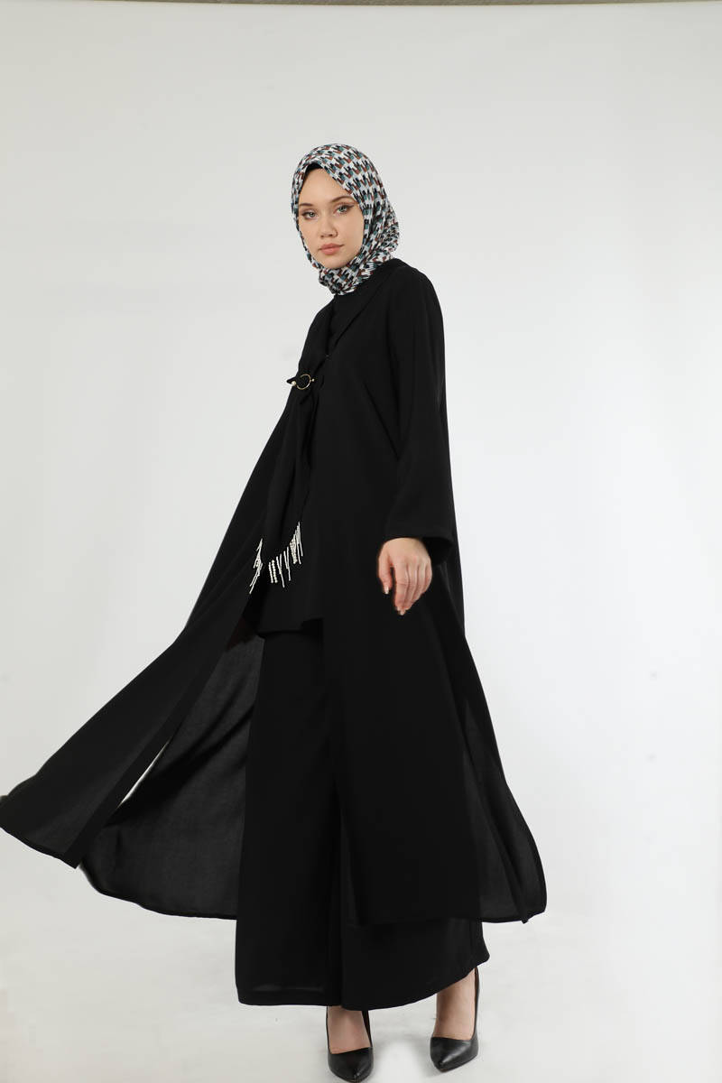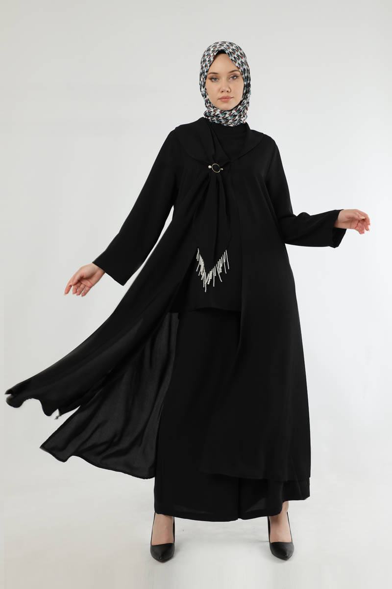 Scarf Abaya Suit Black. Abaya with slit detail. The waist of the trousers is elastic. The trousers are loose. Shawl collar. There are beads and buckle details on the collar. Sold as a set of three. You can choose it for your daily use and special occasions.