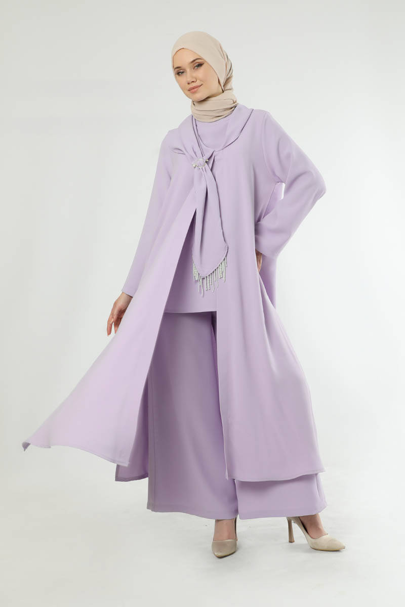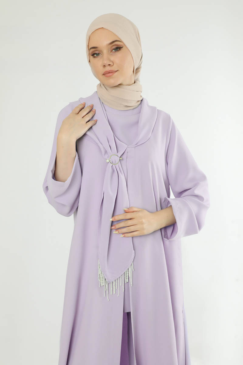 Scarf Abaya Suit Lilac. Abaya with slit detail. The waist of the trousers is elastic. The trousers are loose. Shawl collar. There are beads and buckle details on the collar. Sold as a set of three. You can choose it for your daily use and special occasions.