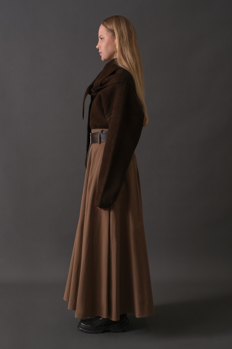 Scarf Detail Knit Sweater Brown pairs modern minimal design with everyday comfort and cozy layered looks for colder days. Its soft texture and relaxed, wide fit offer comfortable wear, while the attached scarf detail adds a distinctive and refined touch to the design. It can be easily styled with skirts or jeans.