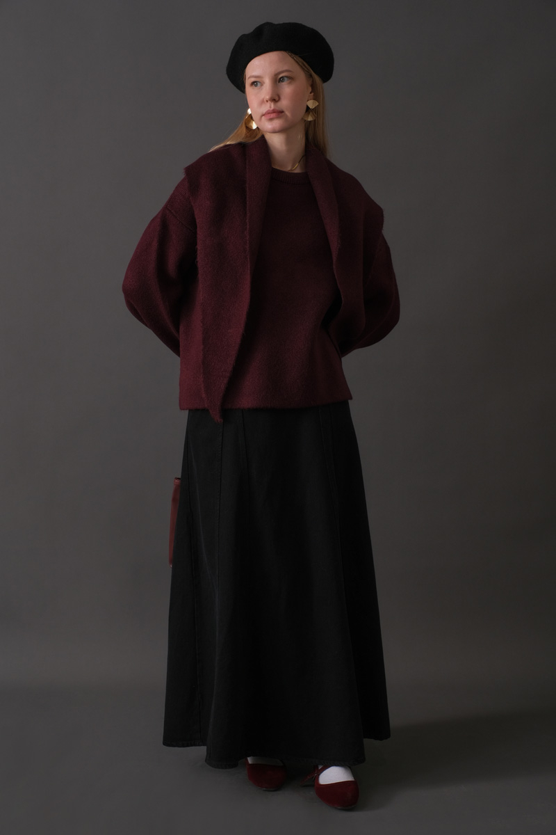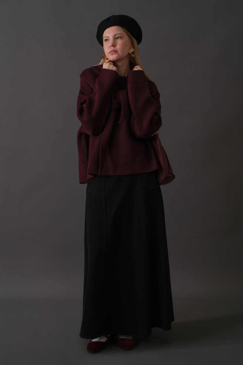 Scarf Detail Knit Sweater Burgundy pairs modern minimal design with everyday comfort and cozy layered looks for colder days. Its soft texture and relaxed, wide fit offer comfortable wear, while the attached scarf detail adds a distinctive and refined touch to the design. It can be easily styled with skirts or jeans.