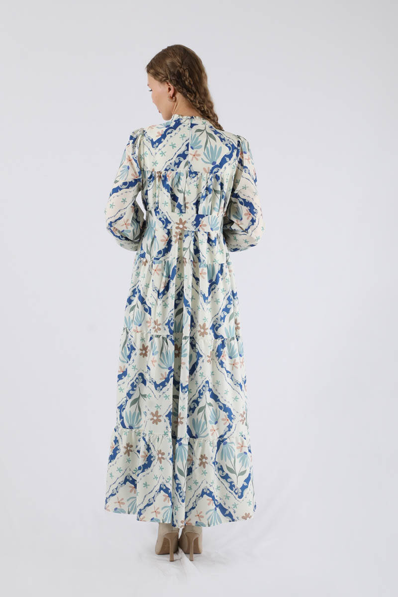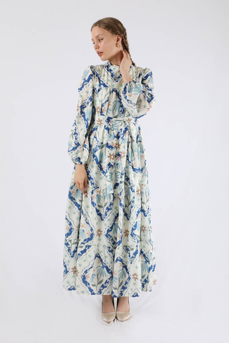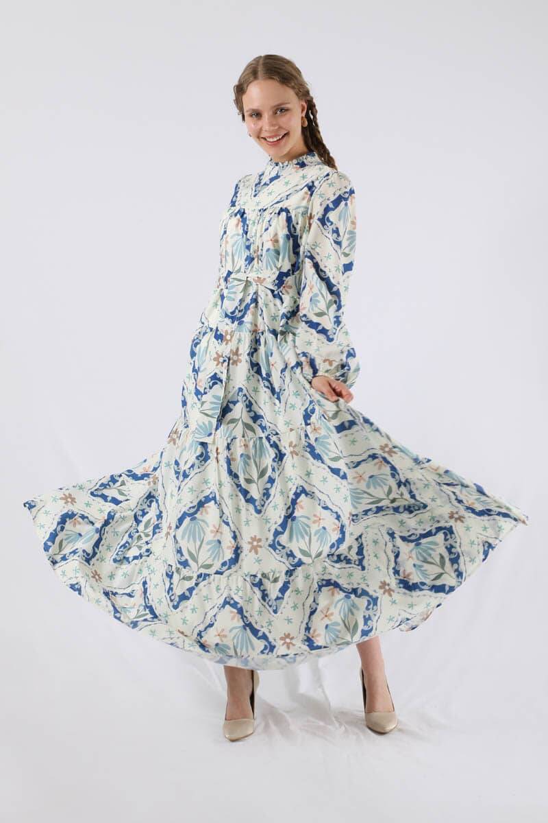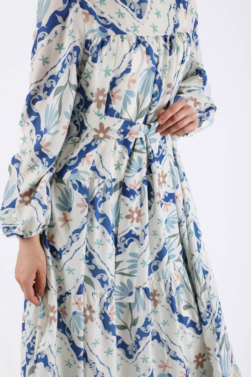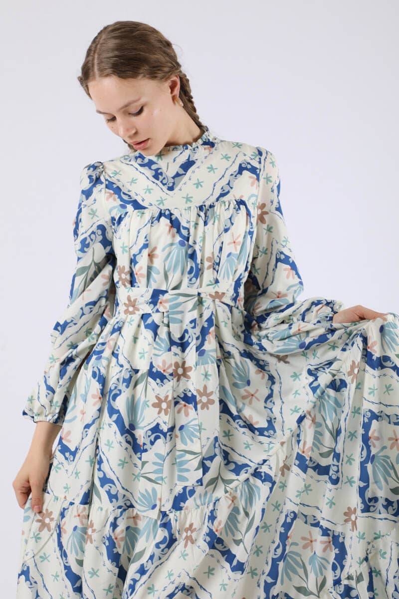 Scarf Dress Blue. Ruffle collar, Lined. Thanks to its printed fabric feature, it is one of the favorite products that adds color to the new season with its hairless and smooth structure.