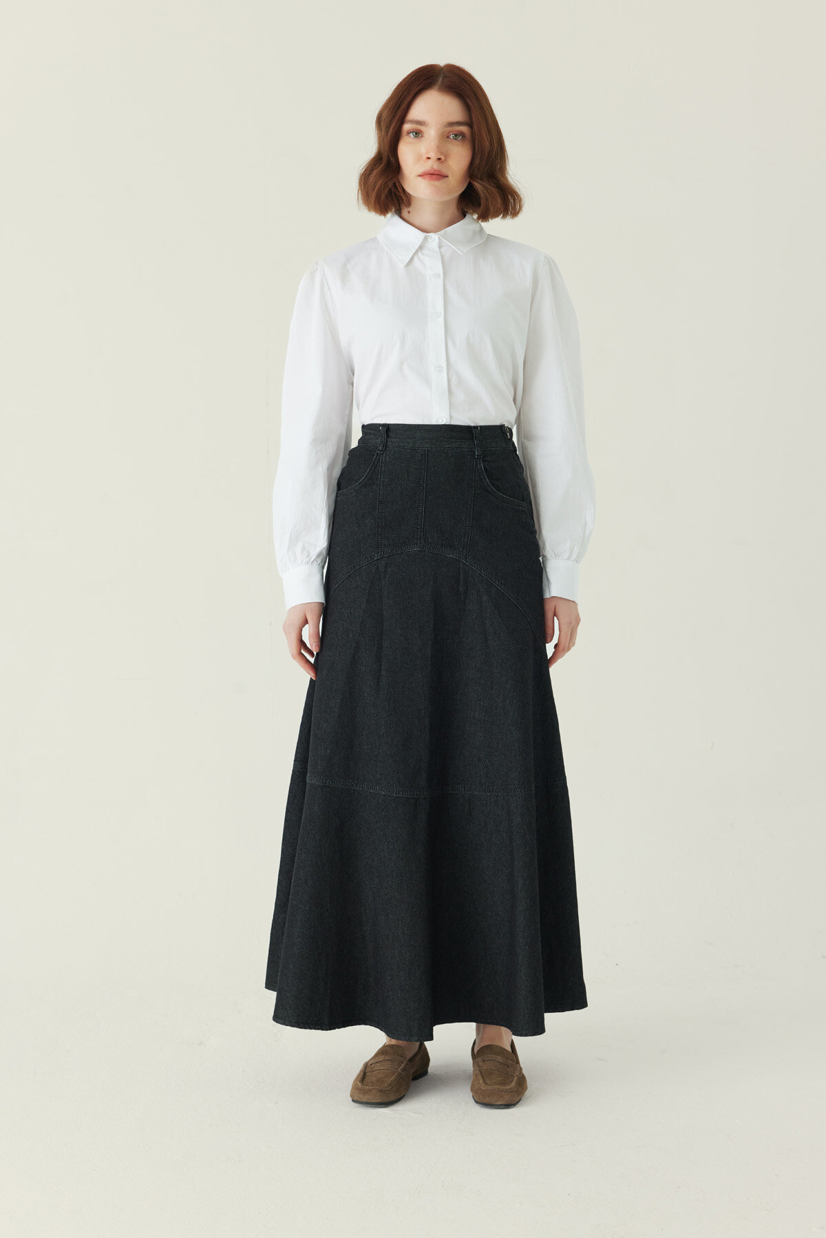 Seam Detail Denim Skirt Black offers a strong and defined silhouette with its clean lines and distinctive seam placement, adding character to the classic denim form. The panel seams used on the front and back support the skirt’s structure, while its softly flared, near A-line cut allows ease of movement. The high-waist design balances the silhouette, making it easy to pair with shirts, knitwear, and blouses. A timeless denim piece suitable for a wide range of looks, from everyday city style to more refined outfits.