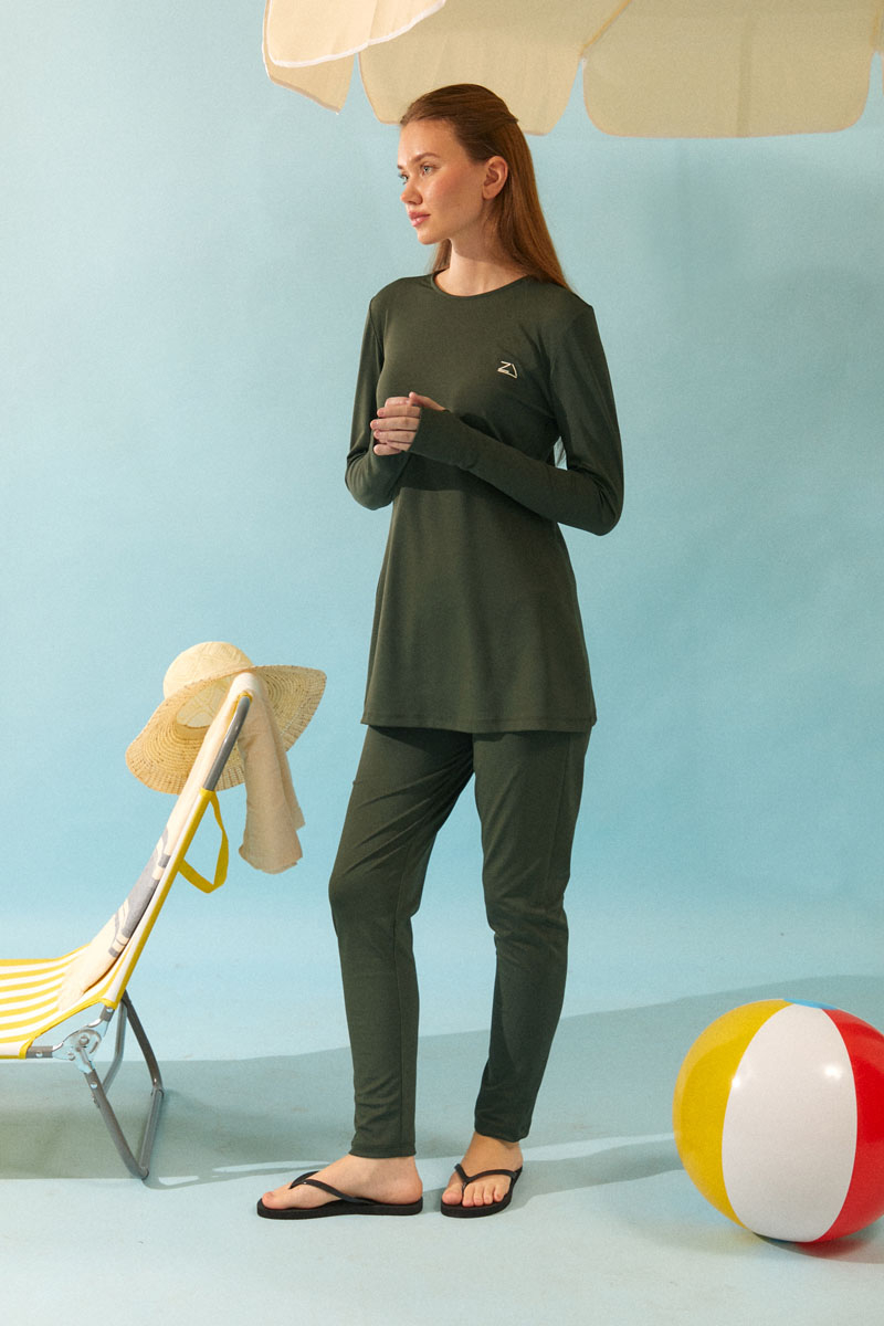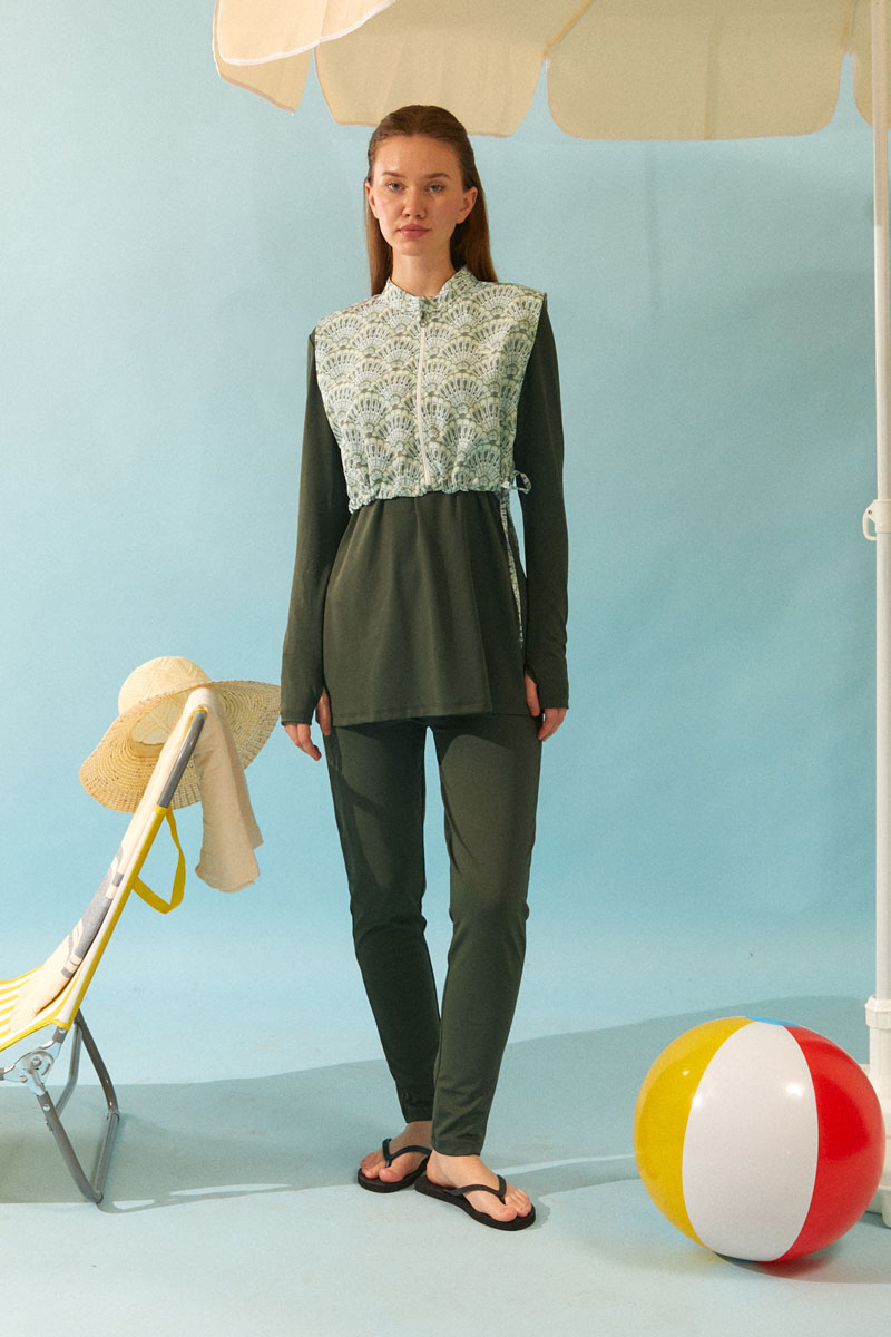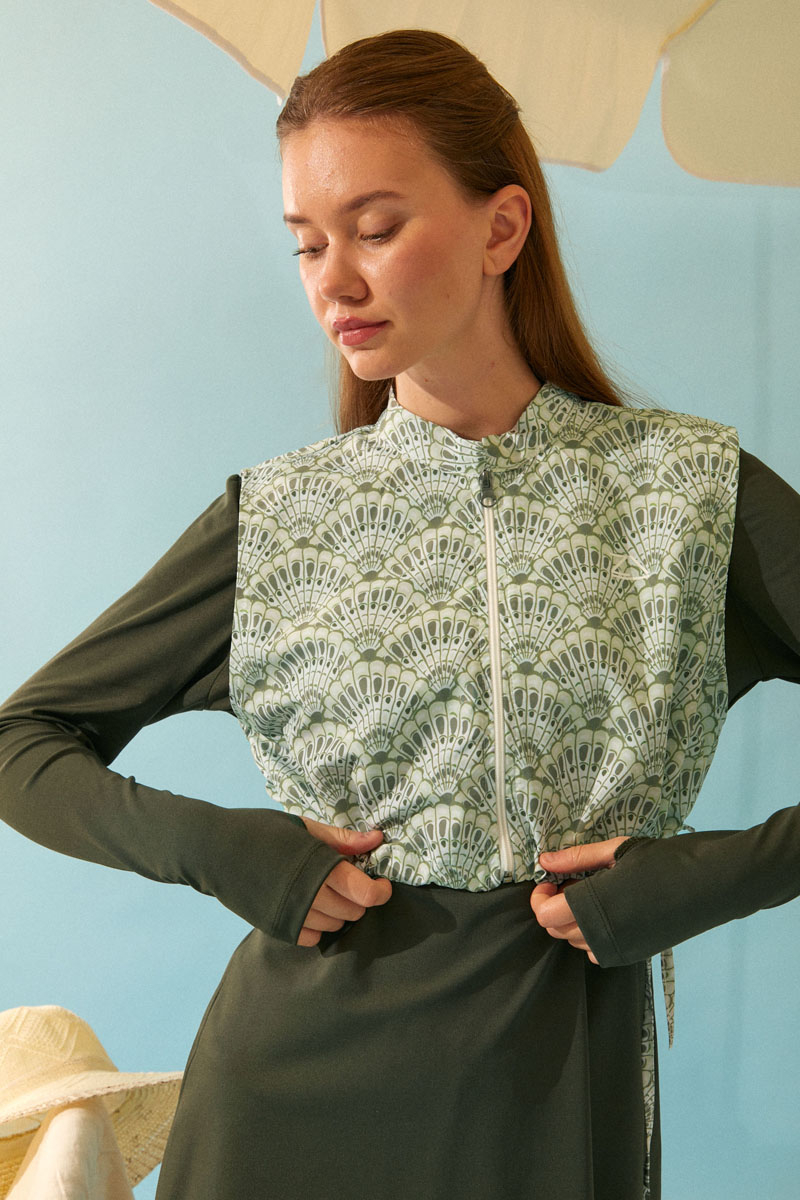 Featuring long sleeves, a crew neckline, and a basic cut, this swimsuit is complemented by a zippered, adjustable patterned vest with gathered detailing at the hem, creating a dynamic and stylish look. This elegant and coordinated set is an ideal choice for women seeking modesty and sophistication both at the beach and by the pool.