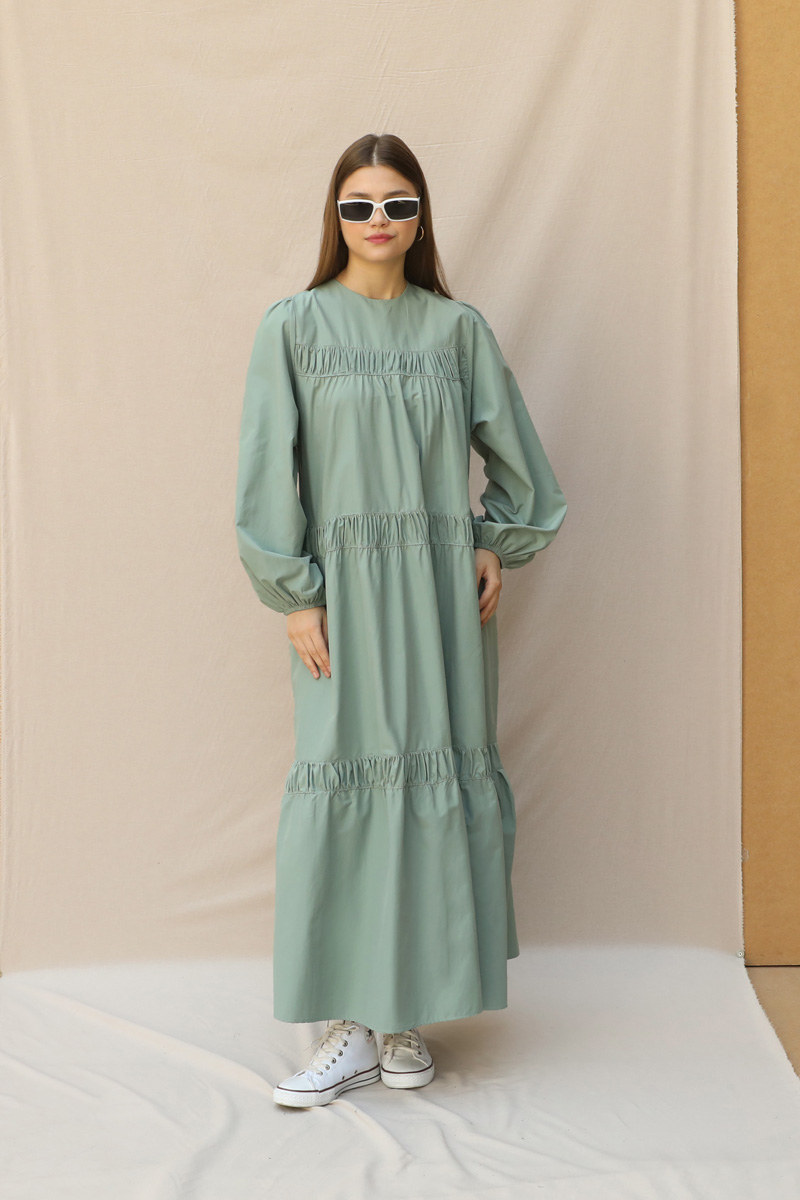 Şerit Büzgülü Elbise Mint. Bisiklet yakalıdır, Manşeti lastiklidir, Kat kat büzgü şeritlidir, Astarsızdır, Cepsizdir, Kuşaksızıdır, Hafif kloştur.