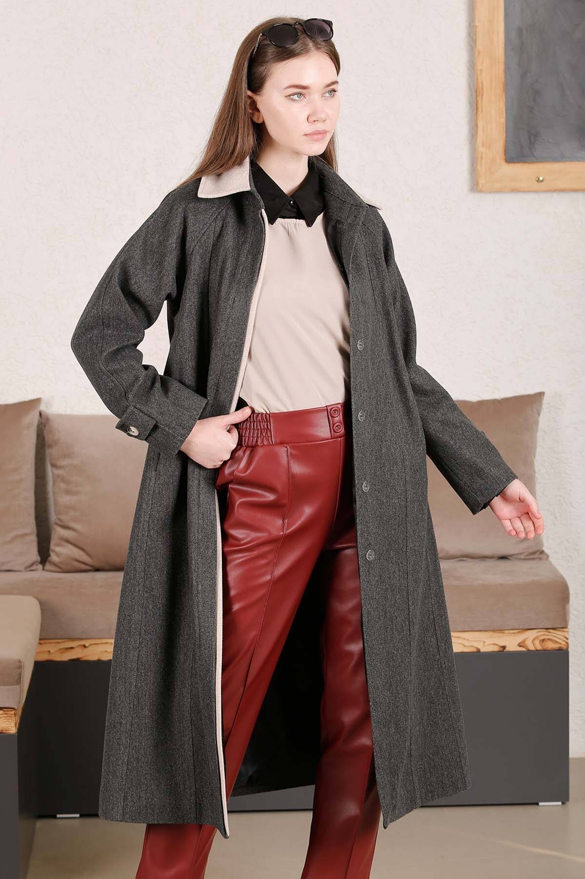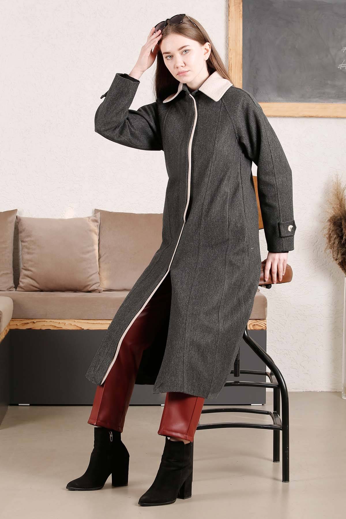 Shirt Cachet Coat Antacid. Shirt collar, concealed button fastening in the front. Stitching detail. Two-color. Low shoulder. Oversized mold. Lined. Two side pockets.