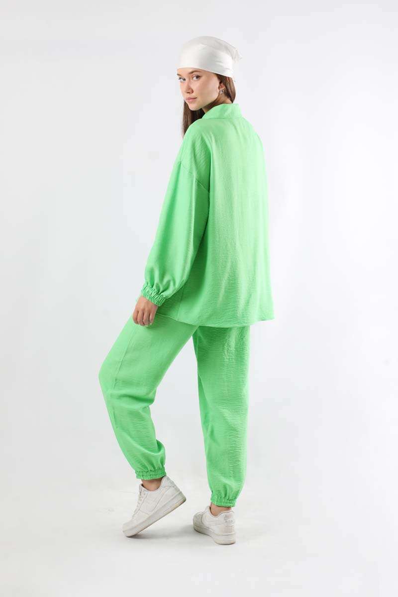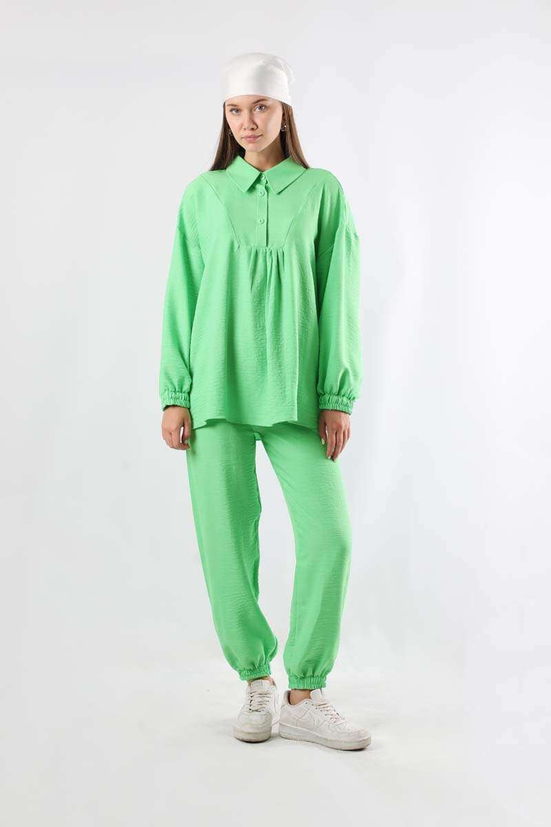 Shirt collar. Double button. With pockets. Sold as a set with trousers.