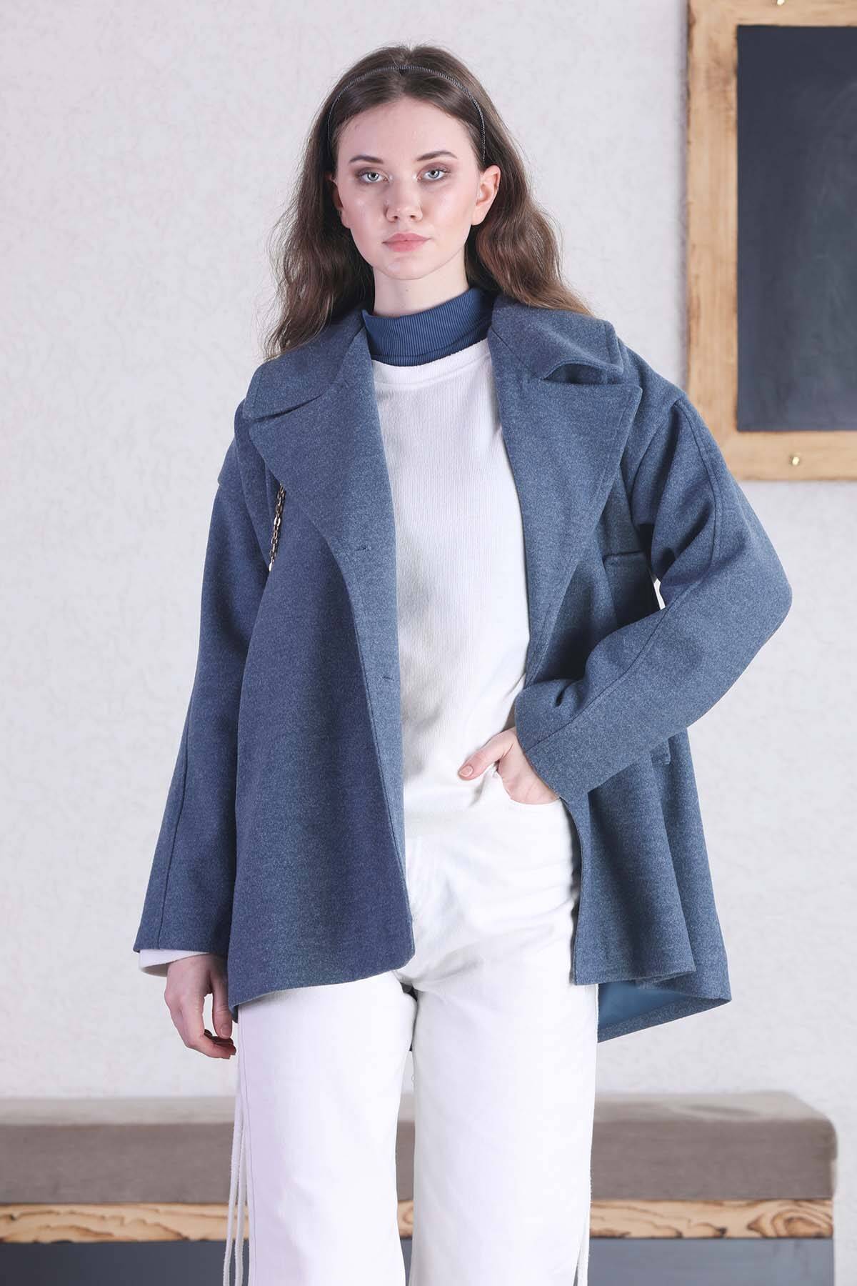 Short Cachet Coat İndigo. Wide English collar. It is lined. It has two side pockets. Double breasted metal color button.