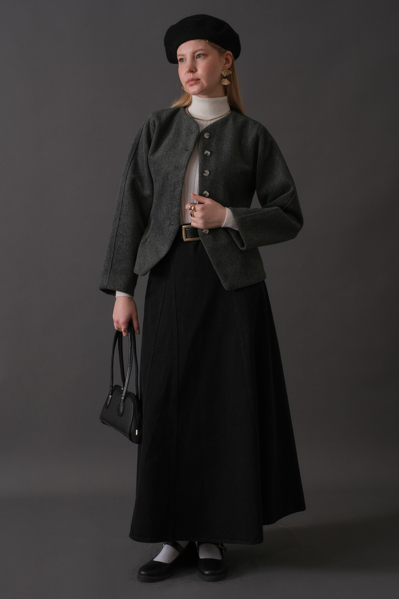 Short Jacket with Dart Detail Anthracite adds effortless sophistication to your daily style with its modern cut and minimal lines. The front dart seams shape the silhouette beautifully, while the faux wool cashmere-like fabric provides warmth and comfort. Thanks to its short length, it pairs easily with high-waisted skirts, trousers, and dresses. A refined choice for those who want a subtle yet distinctive touch in their city look.