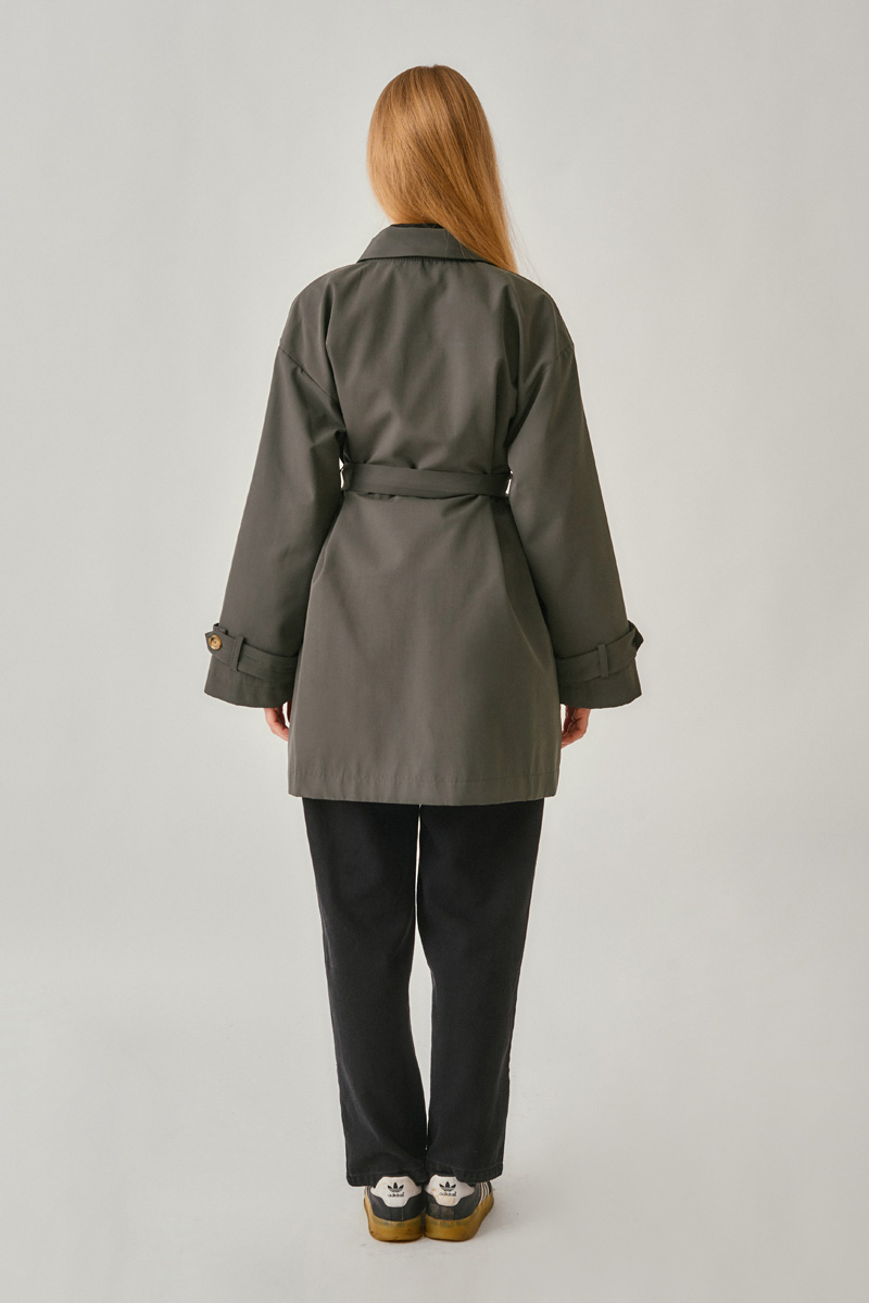 Short Trench Coat with Dropped Shoulders Anthracite reflects a modern take on urban elegance with its relaxed fit and clean lines. The dropped-shoulder design adds a graceful touch, while the waist belt allows you to personalize the silhouette. With its structured yet comfortable fabric, it offers a refined and versatile look suitable for all occasions—from casual daywear to office style.