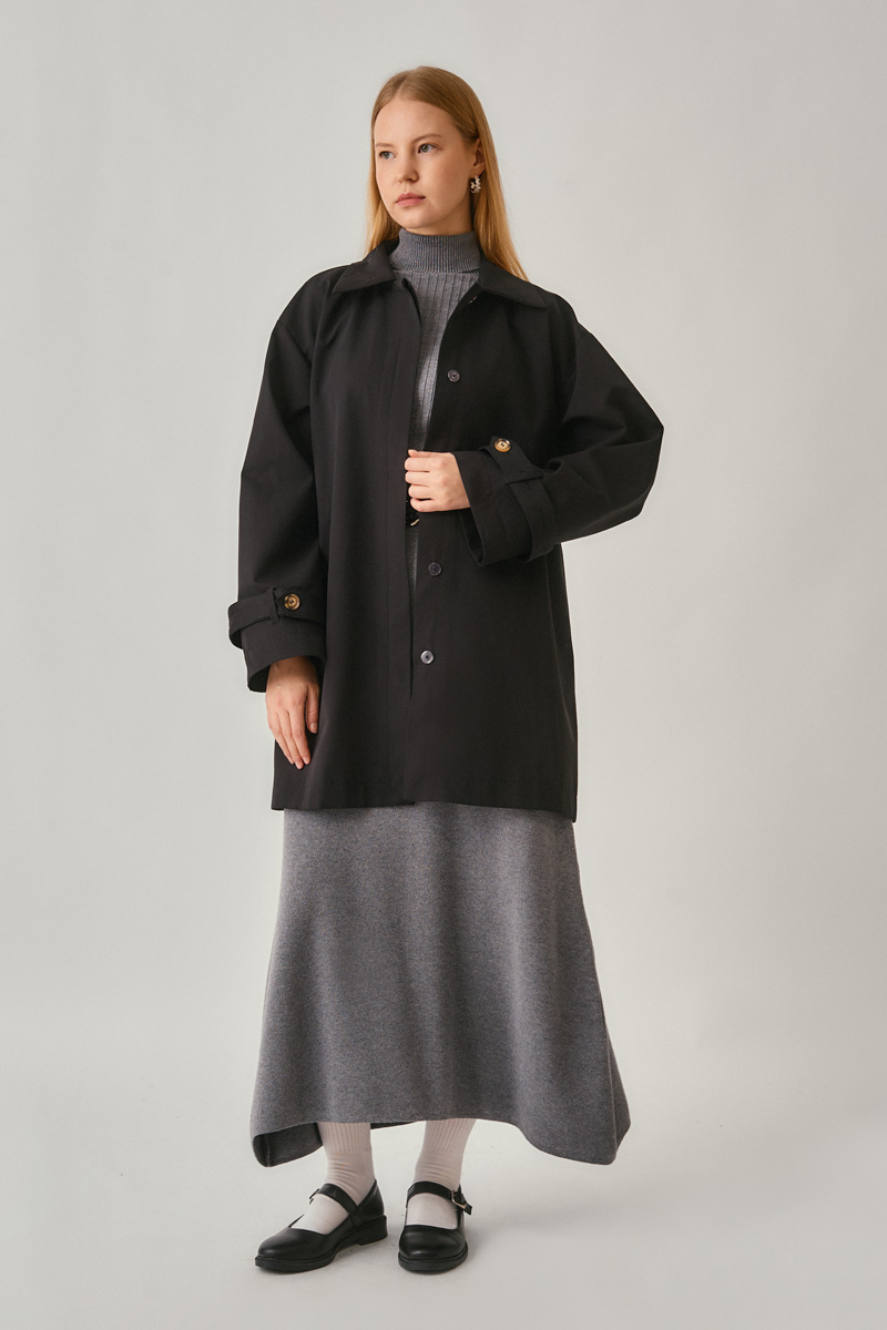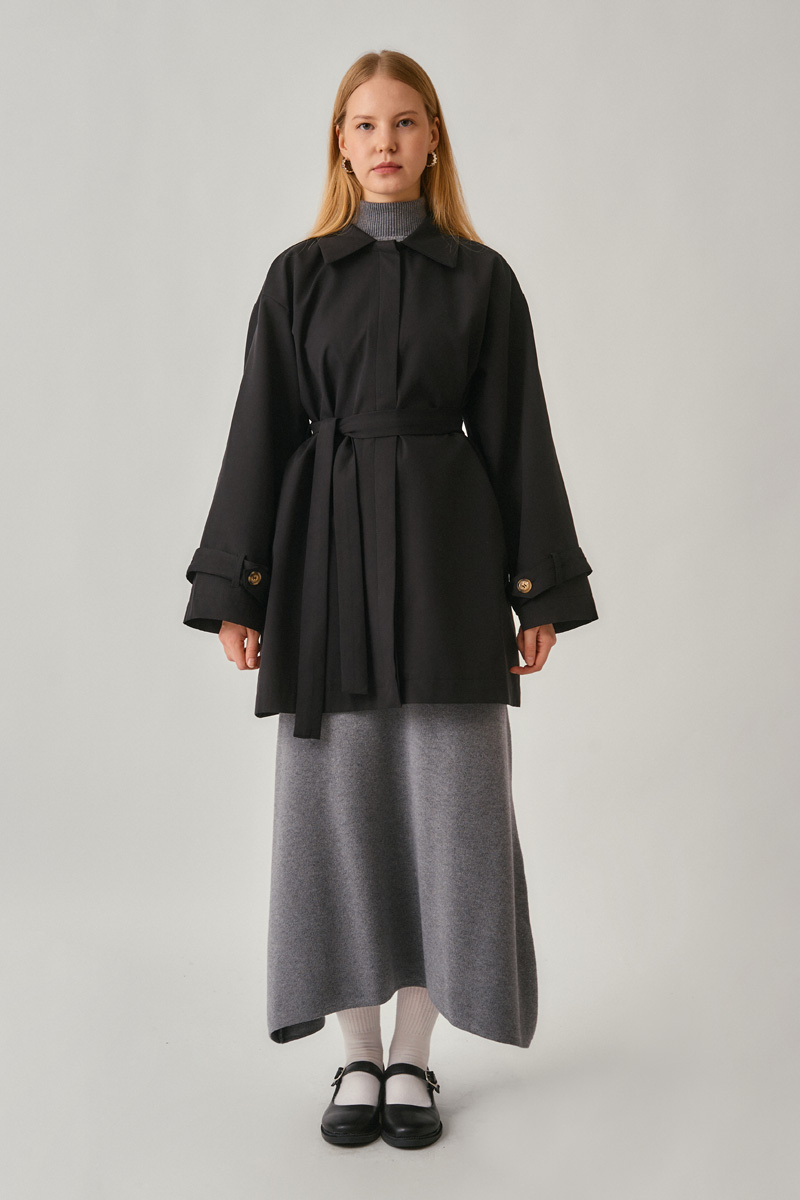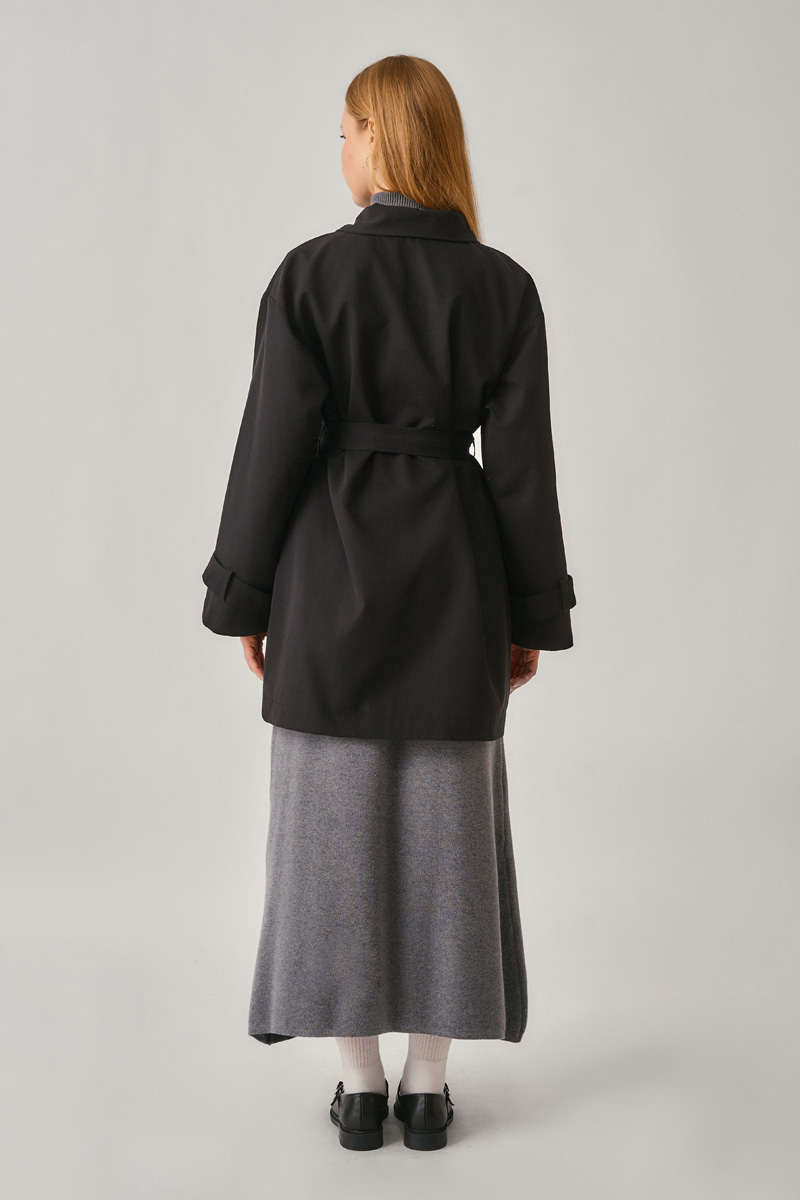 Short Trench Coat with Dropped Shoulders Black reflects a modern take on urban elegance with its relaxed fit and clean lines. The dropped-shoulder design adds a graceful touch, while the waist belt allows you to personalize the silhouette. With its structured yet comfortable fabric, it offers a refined and versatile look suitable for all occasions—from casual daywear to office style.