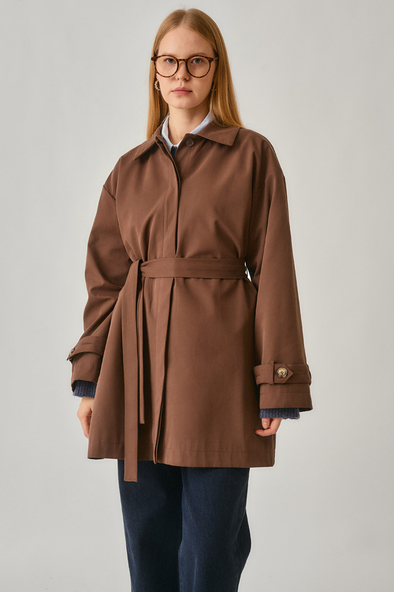 Short Trench Coat with Dropped Shoulders Brown reflects a modern take on urban elegance with its relaxed fit and clean lines. The dropped-shoulder design adds a graceful touch, while the waist belt allows you to personalize the silhouette. With its structured yet comfortable fabric, it offers a refined and versatile look suitable for all occasions—from casual daywear to office style.