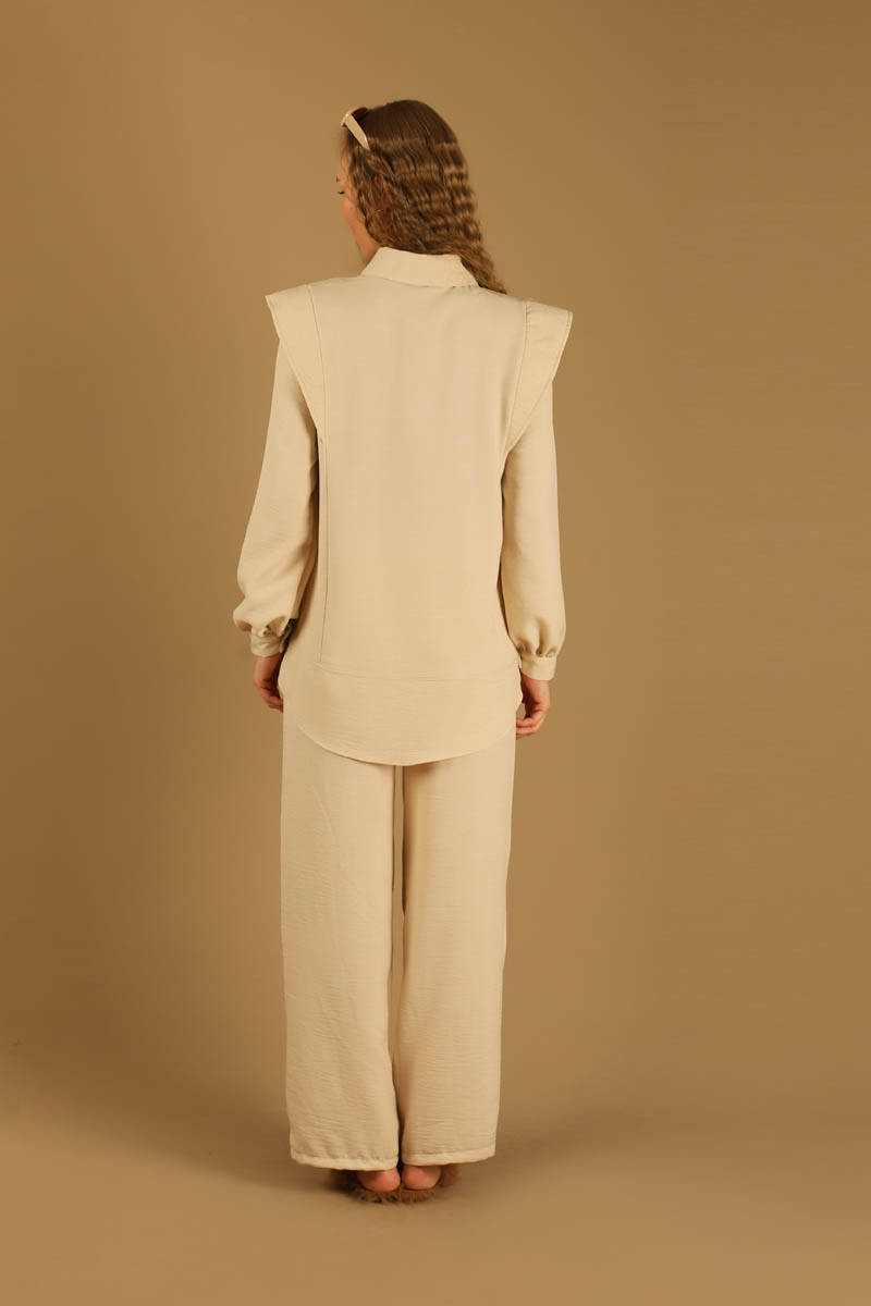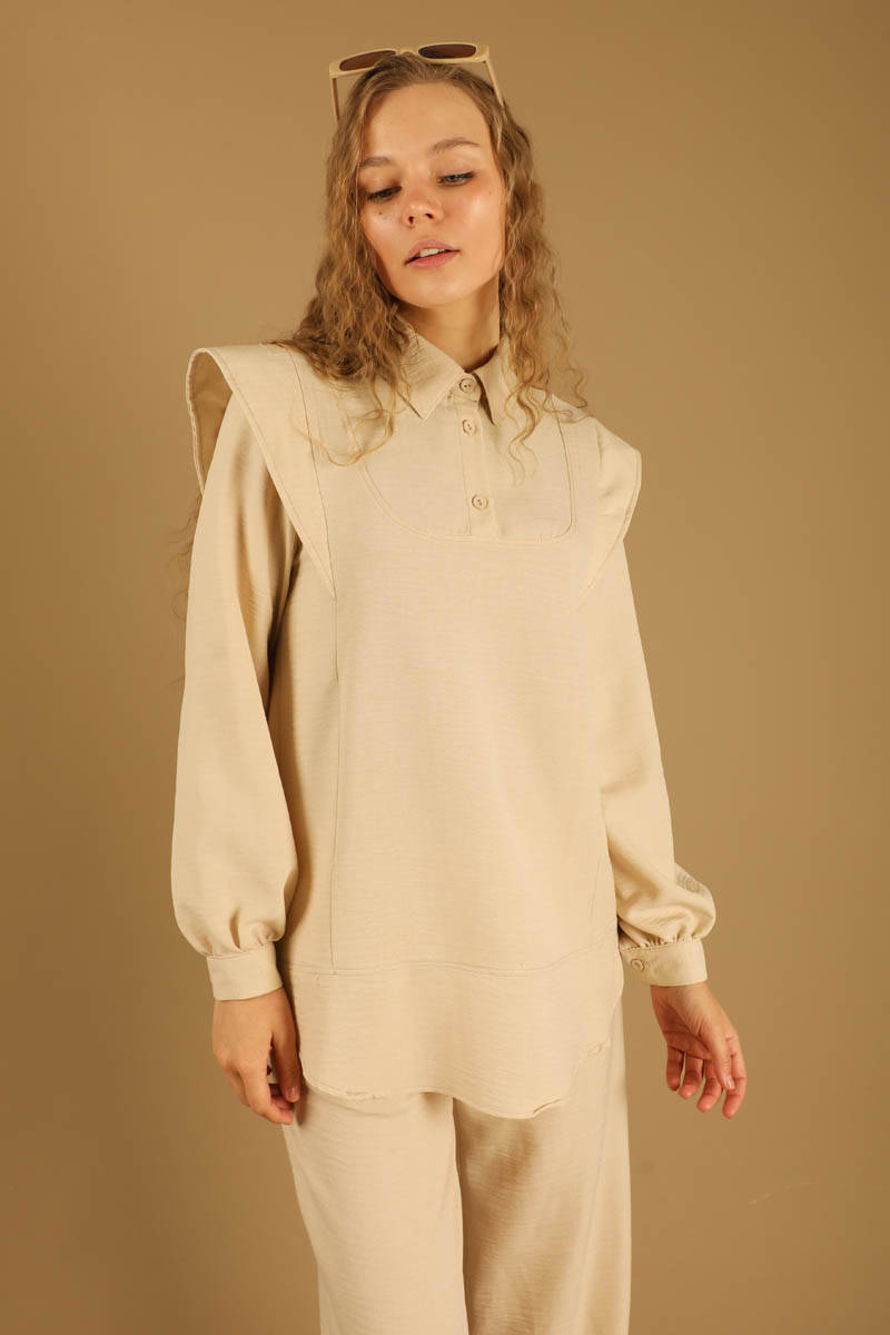 Shoulder Detailed Tunic Suit Cream. Our model, which has pockets and a very stylish and elegant appearance with its detail on the shoulder, is sold with trousers. It is a new season product.