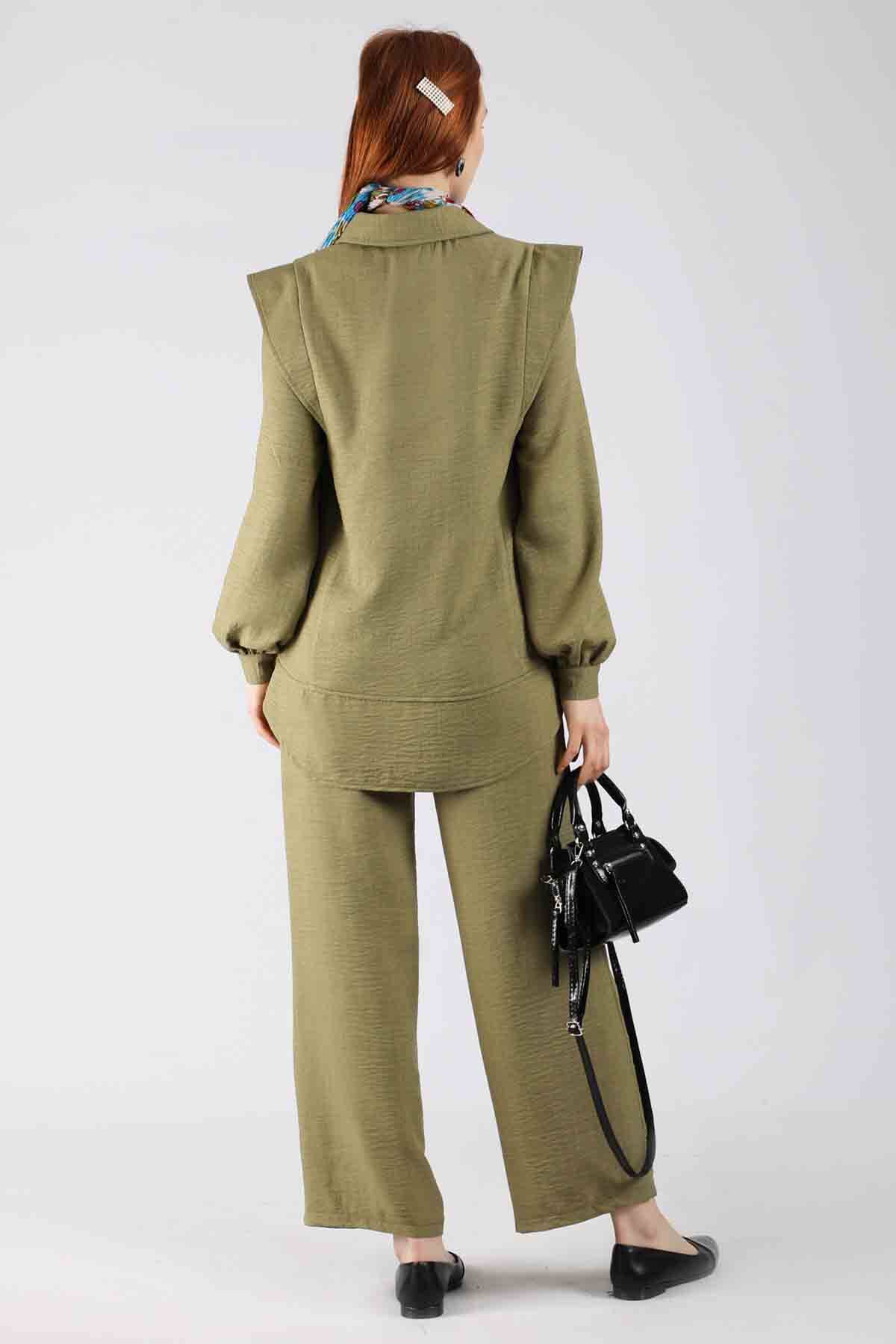 Shoulder Detailed Tunic Suit Khaki. Our model, which has pockets and a very stylish and elegant appearance with its detail on the shoulder, is sold with trousers. It is a new season product.