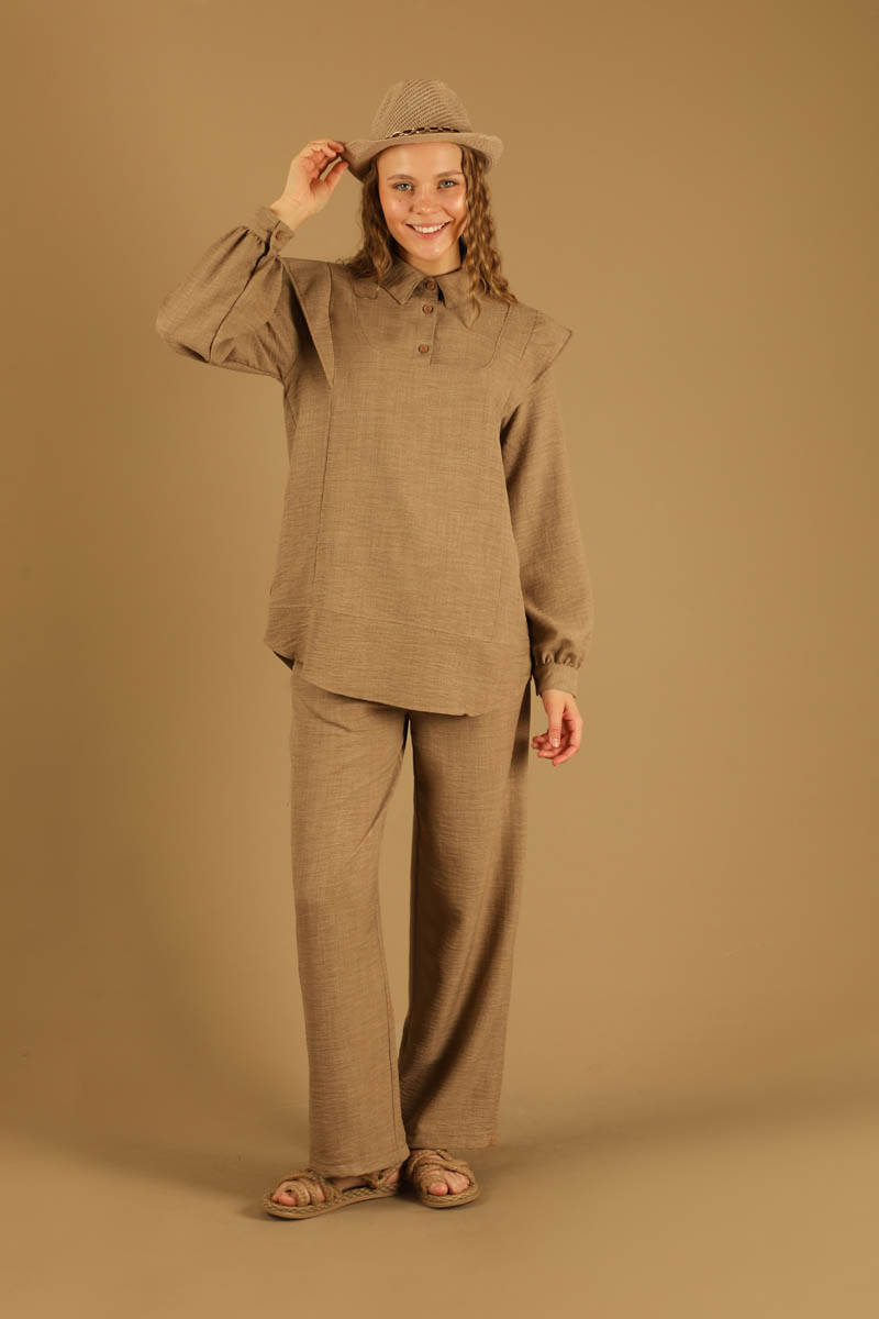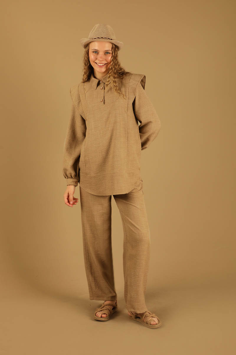 Shoulder Detailed Tunic Suit Tan. Our model, which has pockets and a very stylish and elegant appearance with its detail on the shoulder, is sold with trousers. It is a new season product.