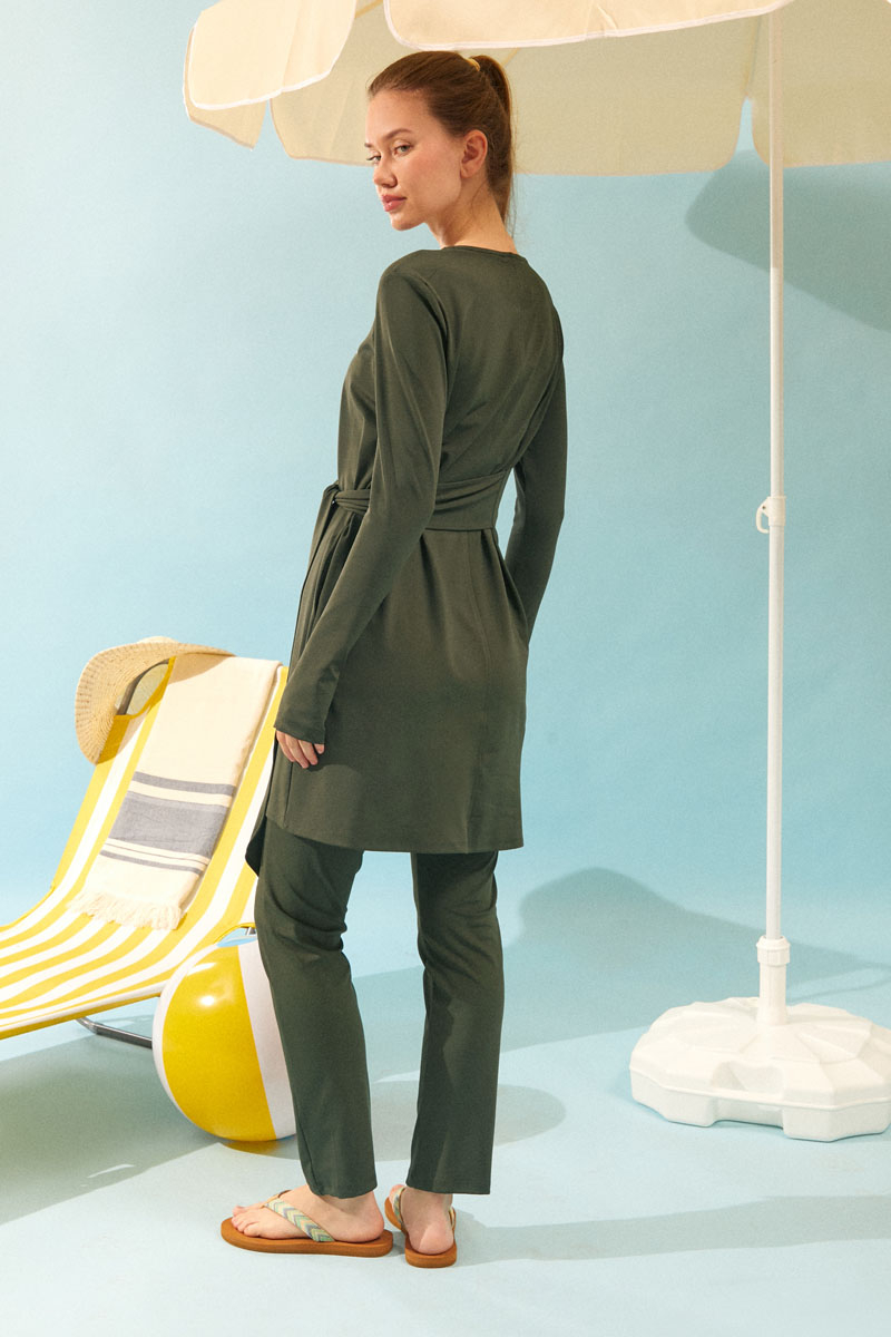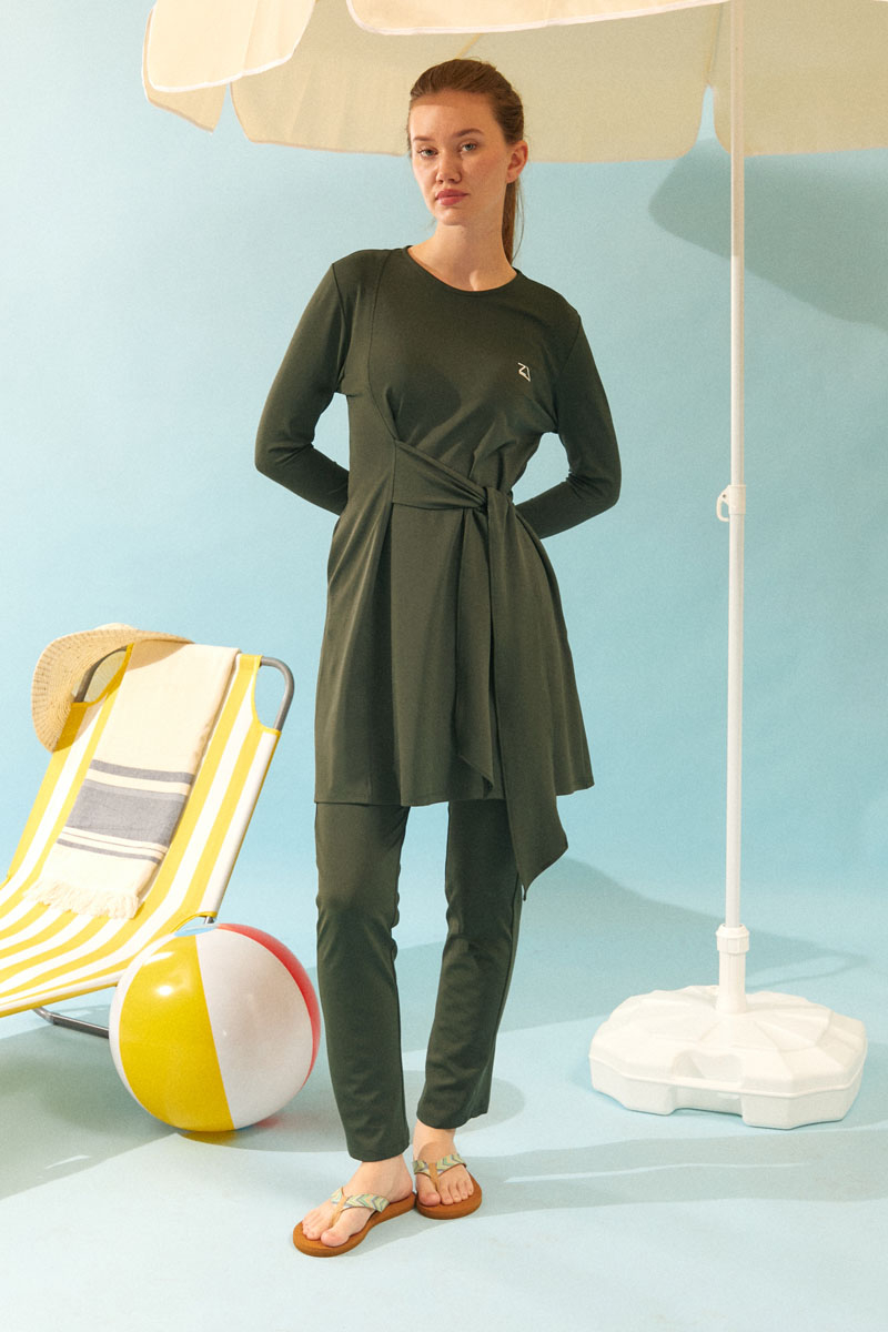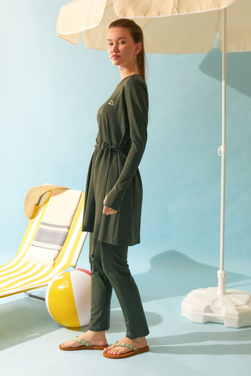 Featuring stitched fabric details on both the front and back, the tunic’s adjustable side tie offers a sporty yet elegant silhouette. Paired with straight-leg, stretch-fit pants, this set provides ease of movement and all-day comfort. Perfect for women seeking a modest and graceful look by the sea or poolside.