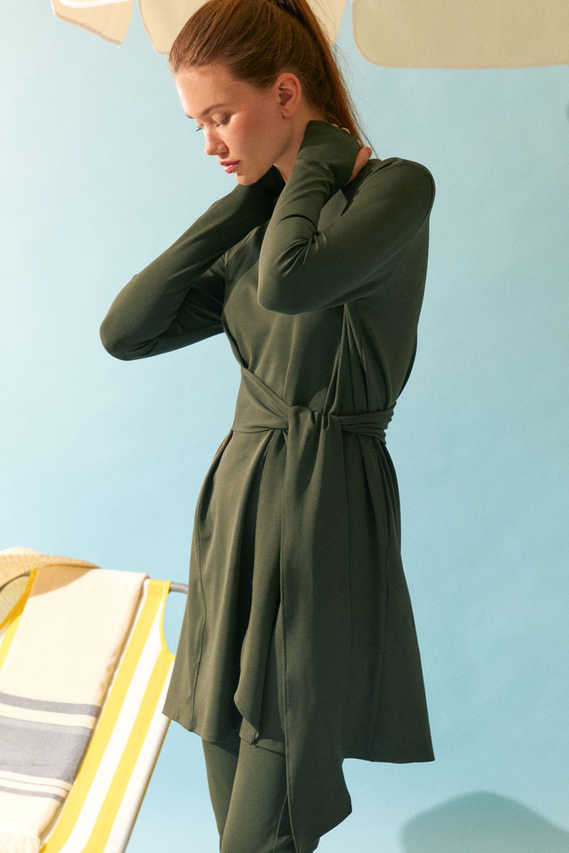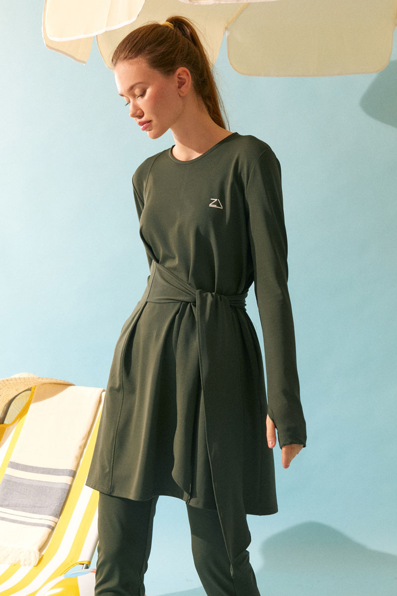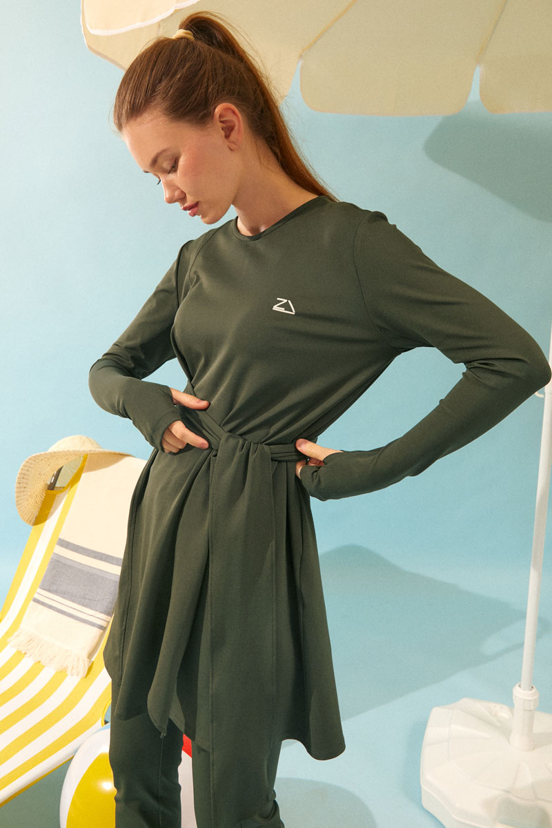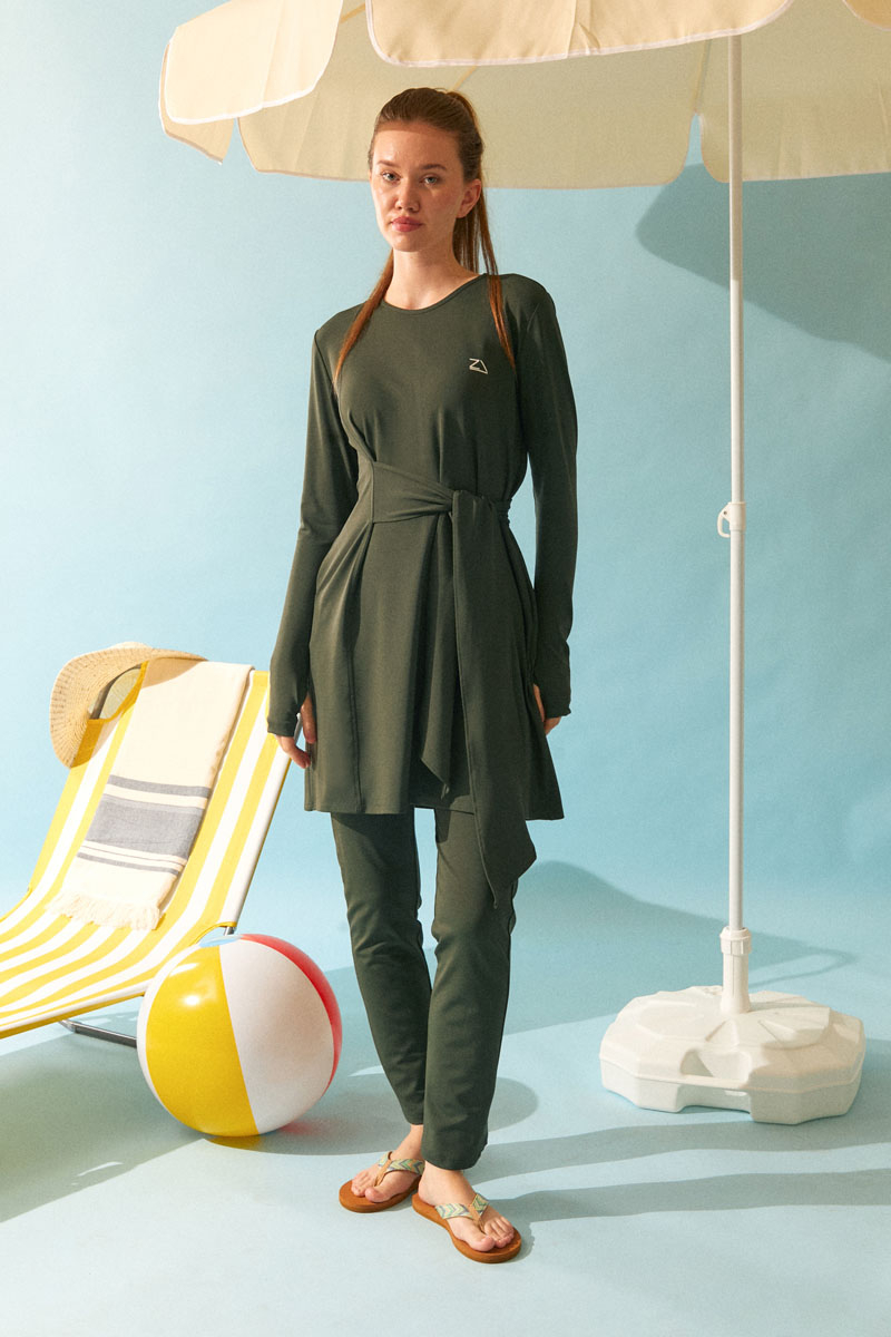 Featuring stitched fabric details on both the front and back, the tunic’s adjustable side tie offers a sporty yet elegant silhouette. Paired with straight-leg, stretch-fit pants, this set provides ease of movement and all-day comfort. Perfect for women seeking a modest and graceful look by the sea or poolside.