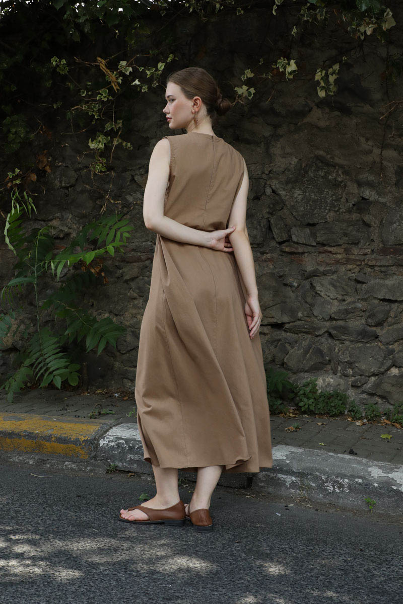 Sıfır Kol Keten Elbise Camel. Bisiklet yaka, sıfır kol, cepsiz, arkadan fermuarlı, astarsızdır. Elbise veya abaya modellerimizin içine kombin olarak tercih edebilirsiniz.