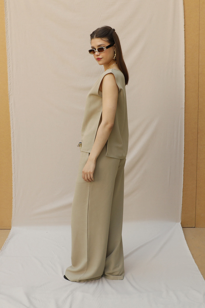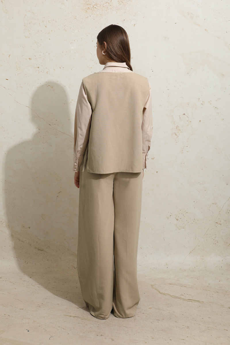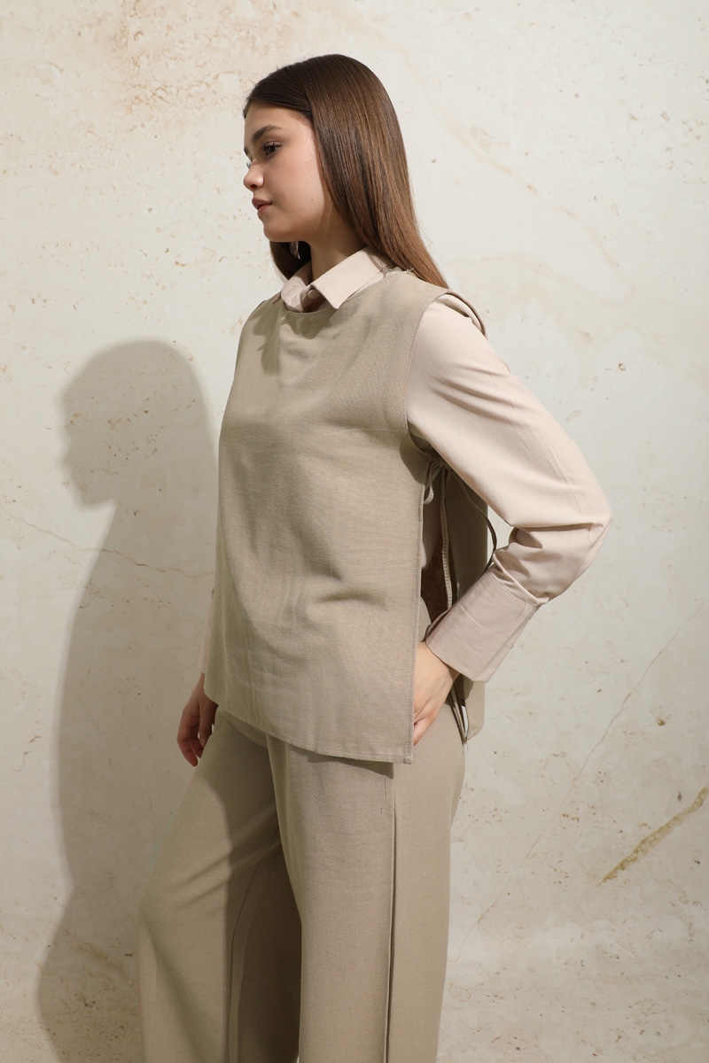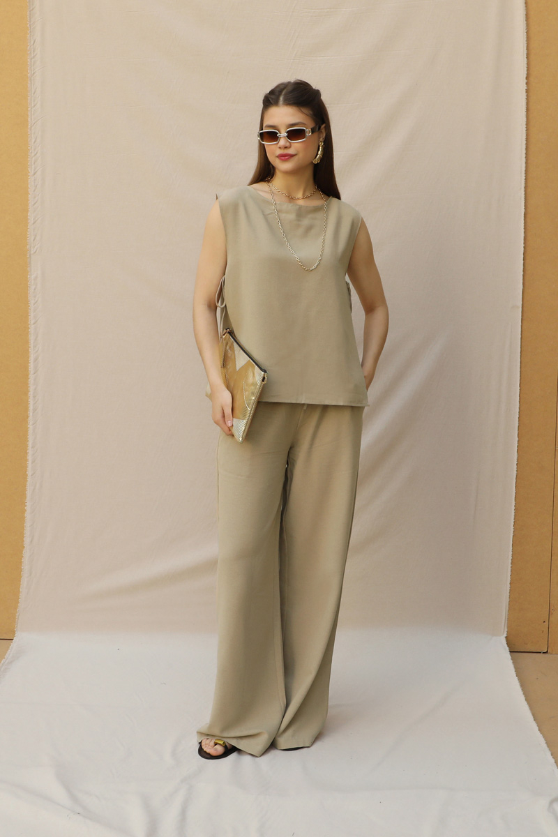 Sıfır Kol İkili Takım Camel. Bluz sıfır kolludur, yandan ince bağlamalıdır. Pantolon beli lastiklidir, yandan ceplidir. Astarsızdır. Günlük ve özel günlerde kullanıma uygundur.