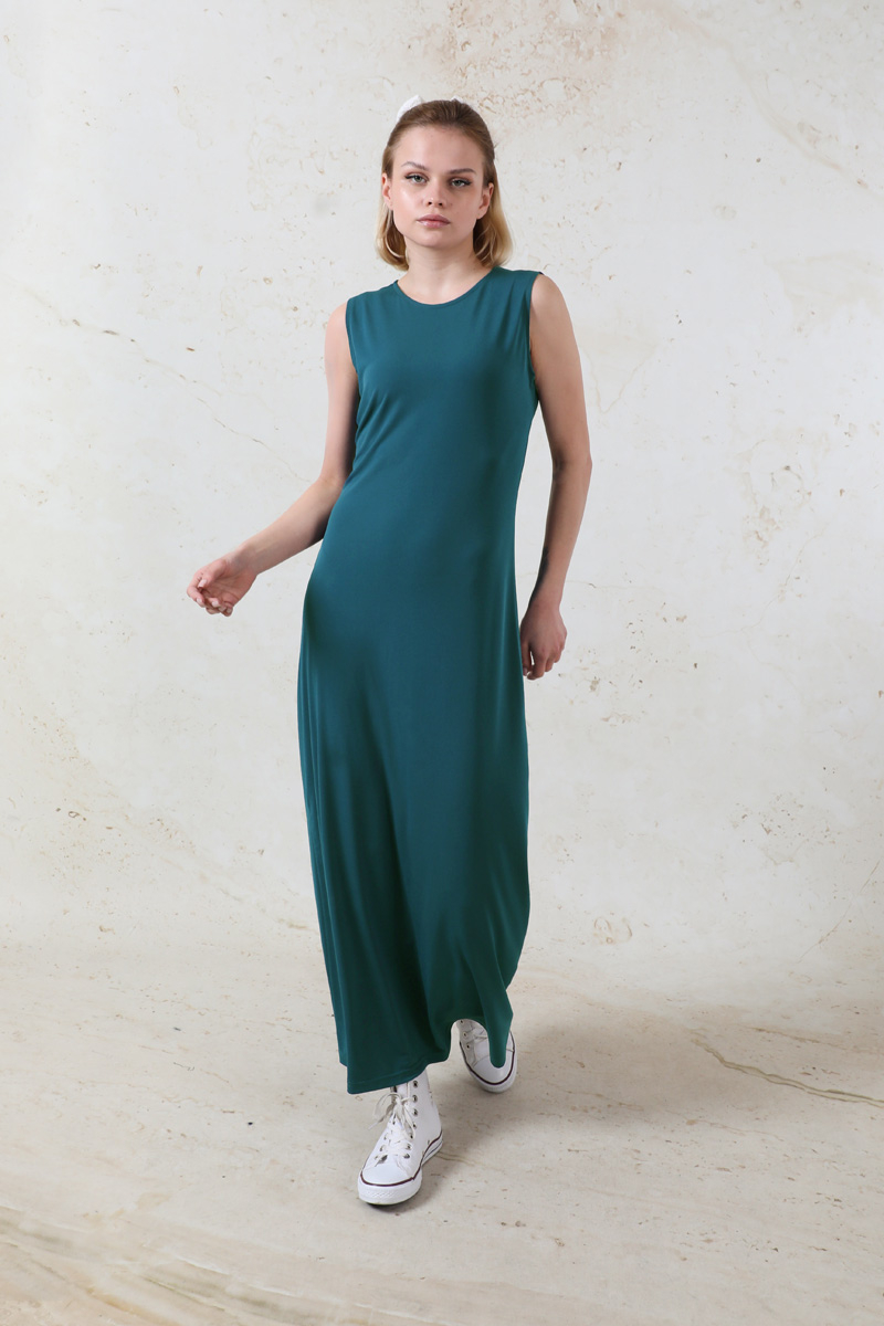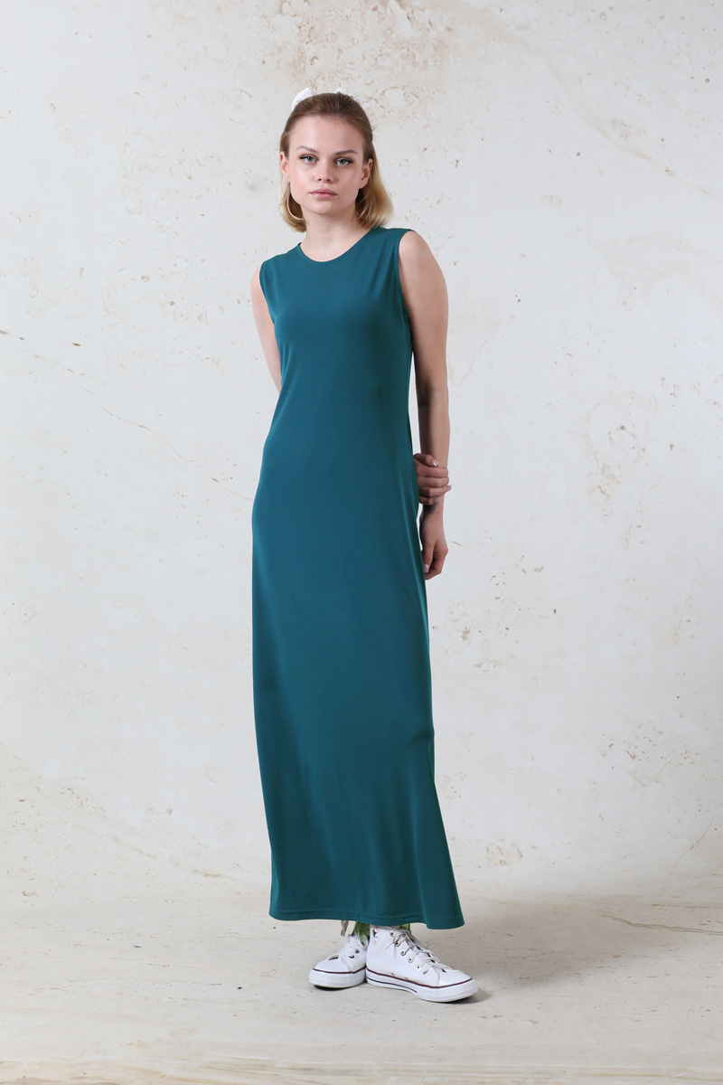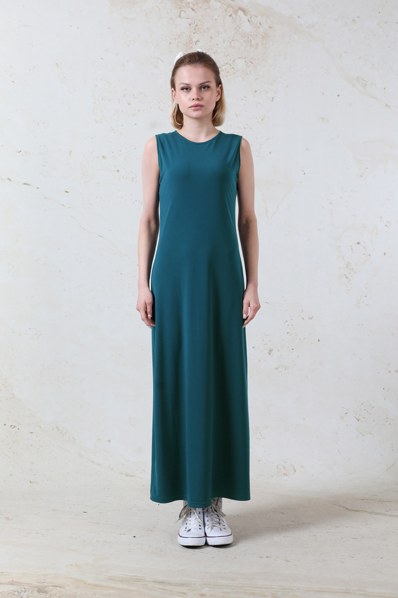 Likralı İç Elbise Petrol Mavisi. Bisiklet yaka, sıfır kol. Kumaşı sandy likralı esnek bir kumaştır. Tok bir duruşu vardır. Ürün renkleri canlıdır.