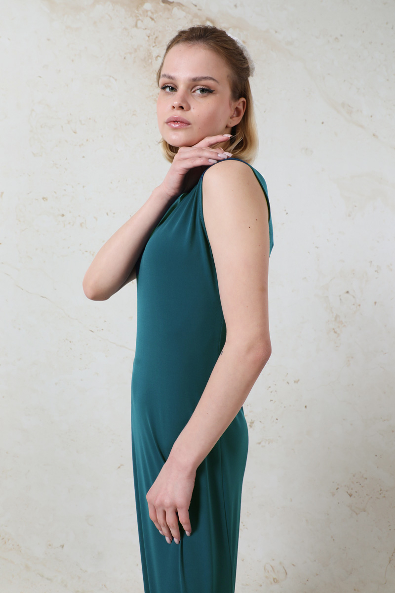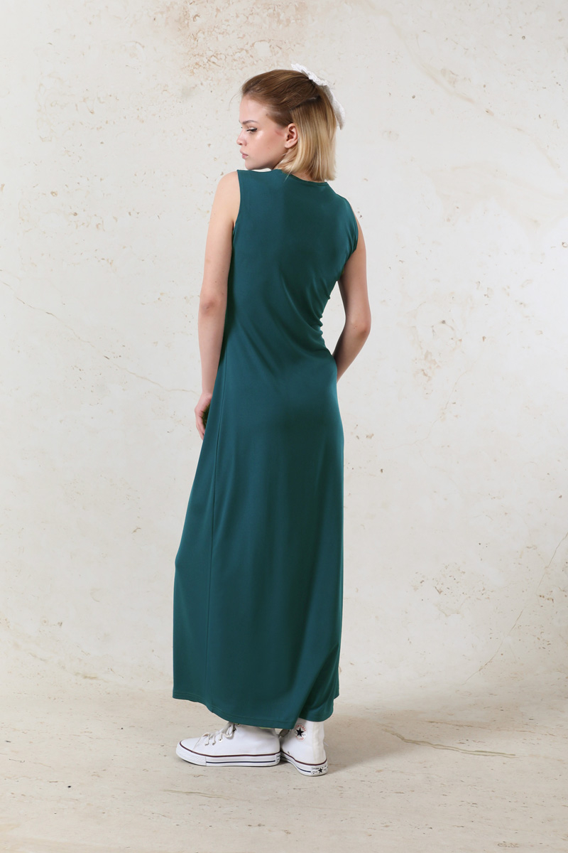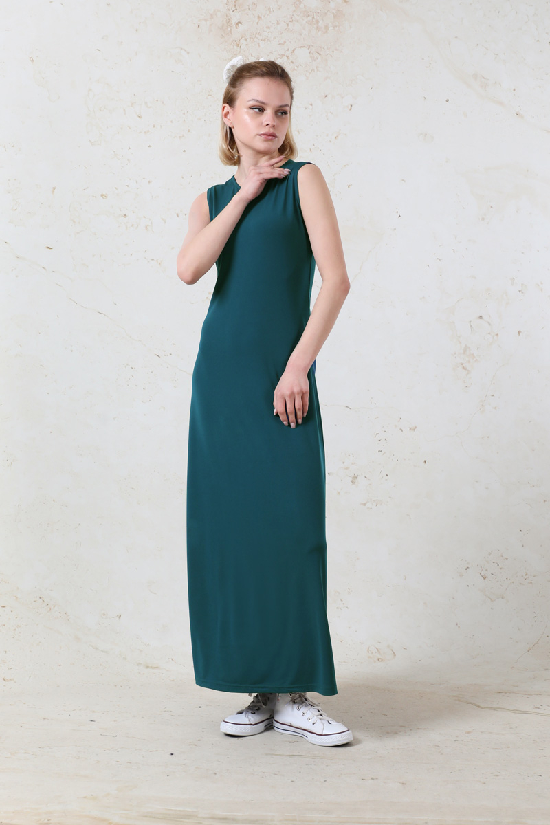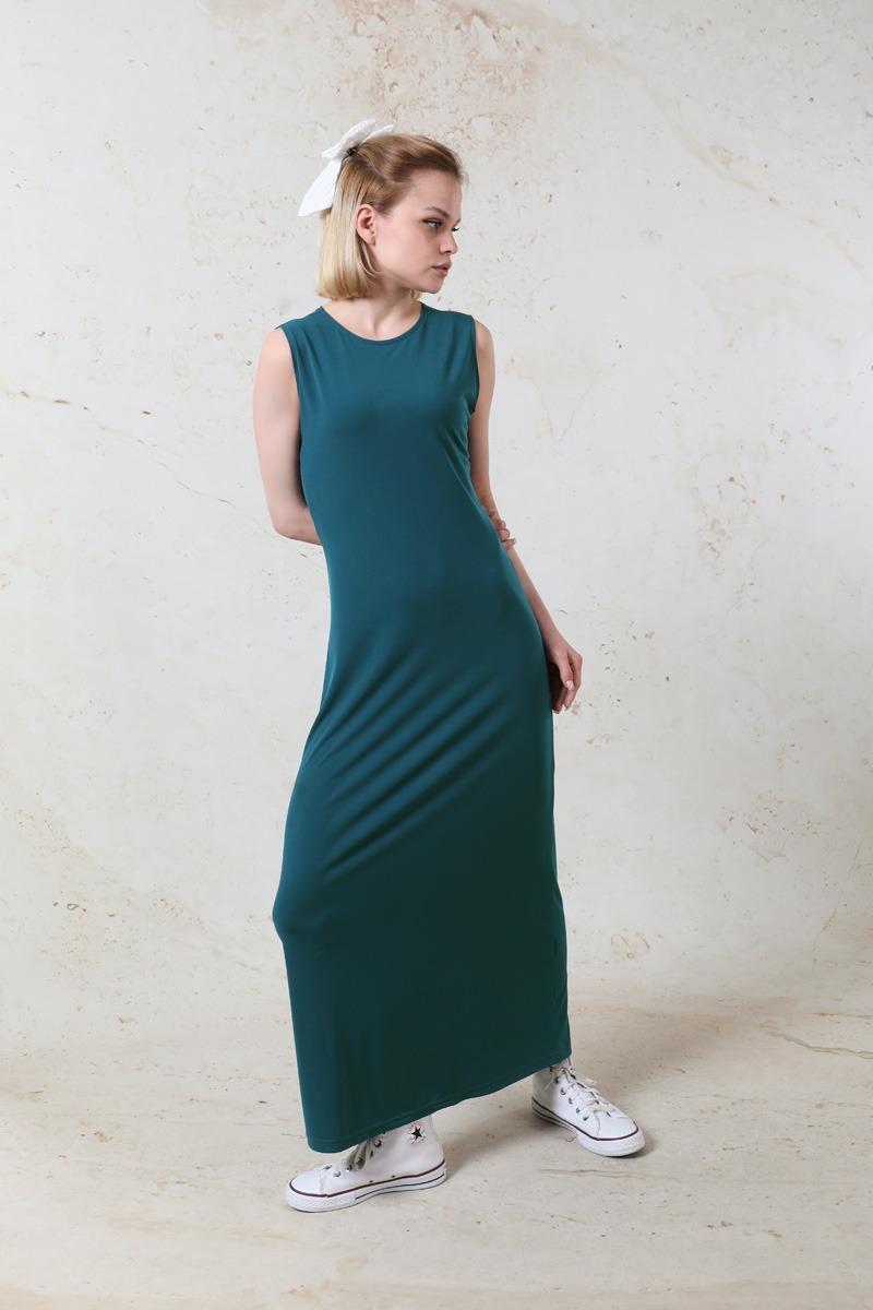 Likralı İç Elbise Petrol Mavisi. Bisiklet yaka, sıfır kol. Kumaşı sandy likralı esnek bir kumaştır. Tok bir duruşu vardır. Ürün renkleri canlıdır.