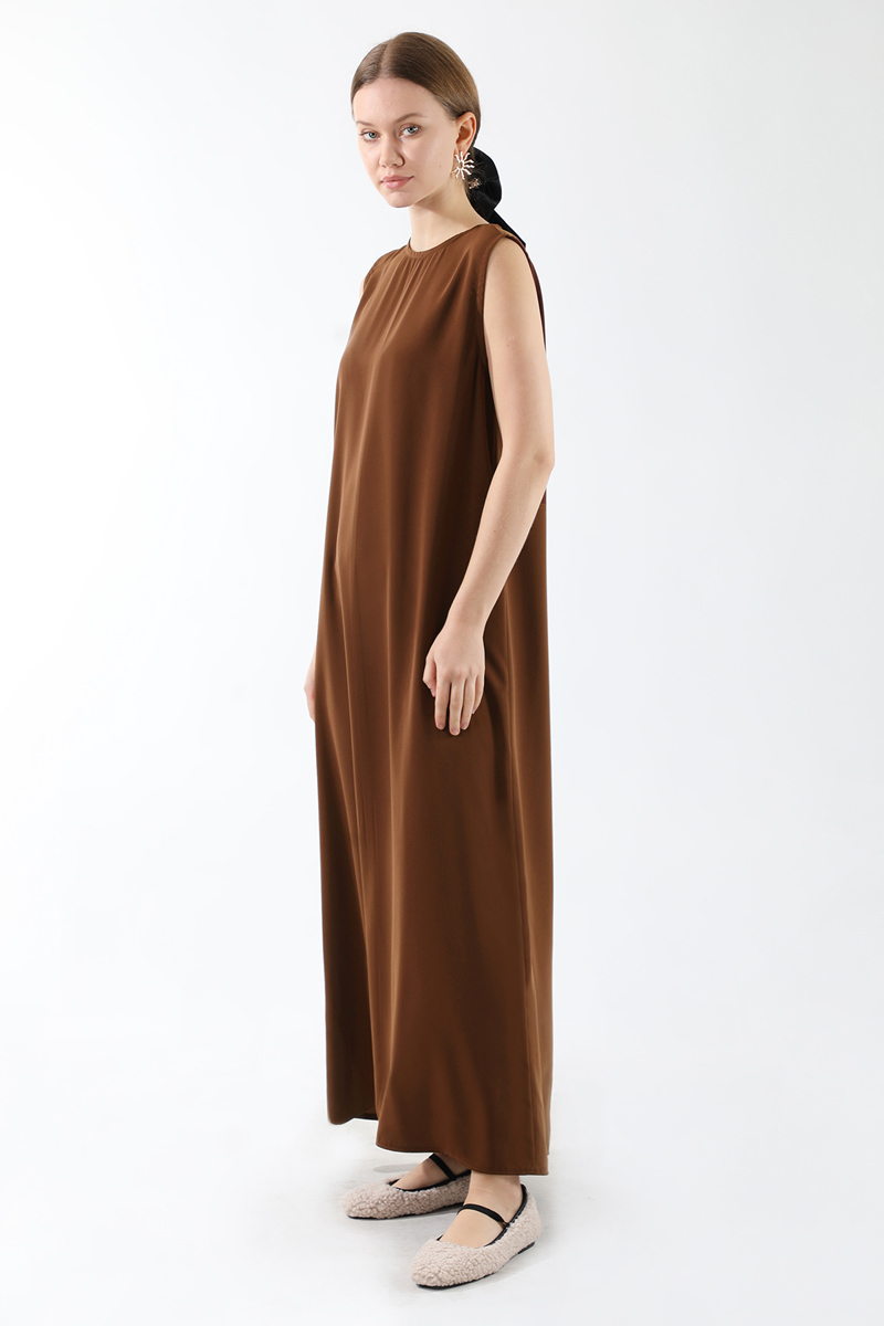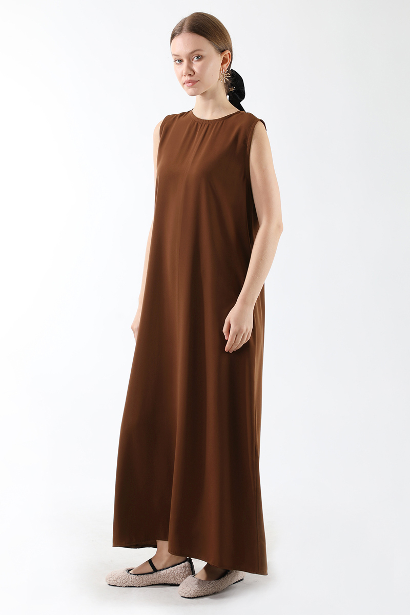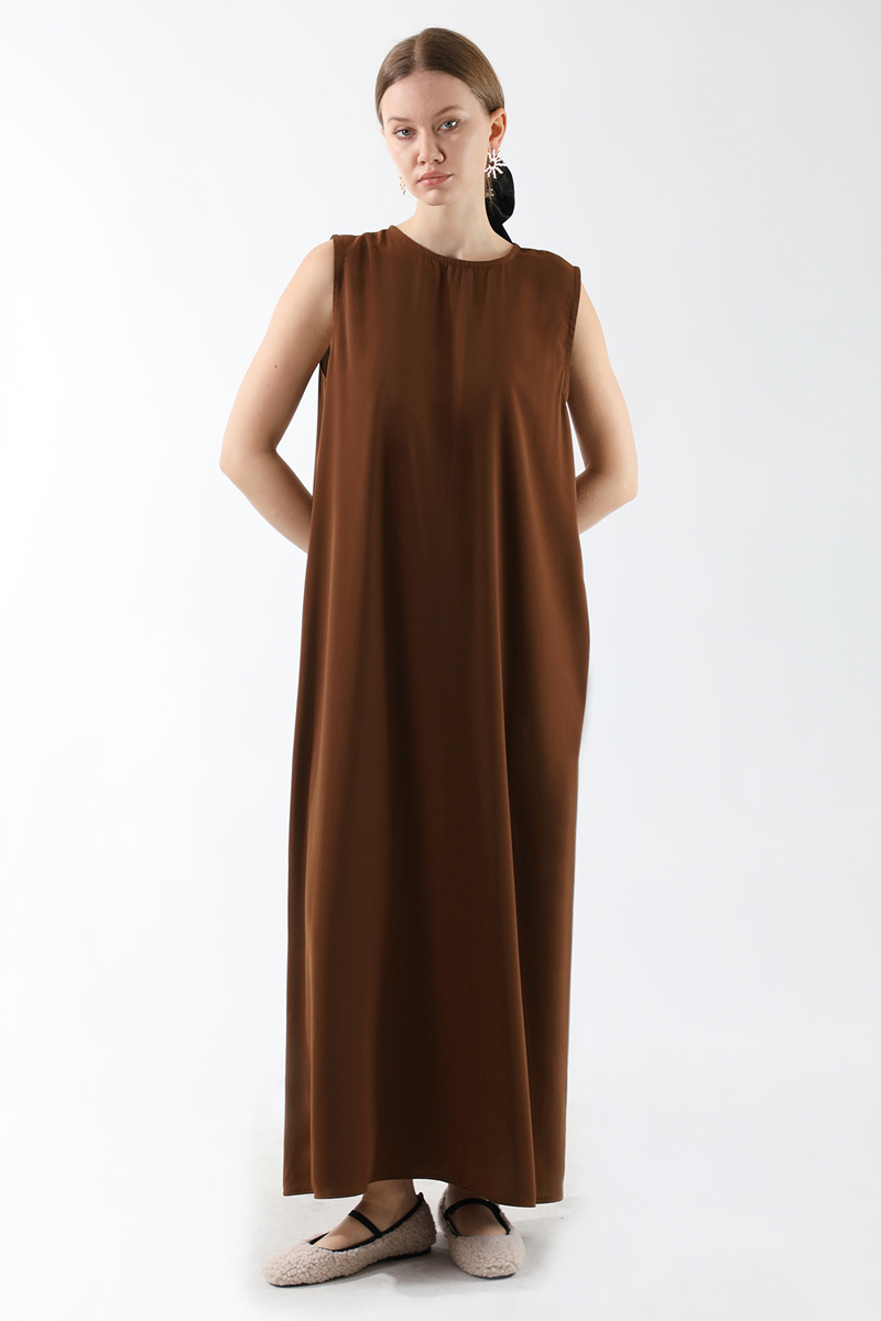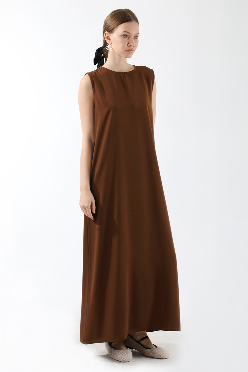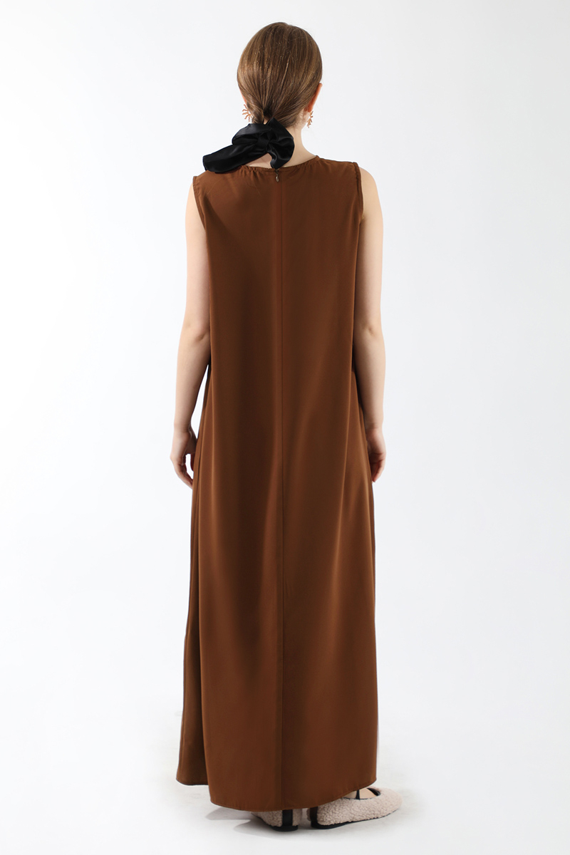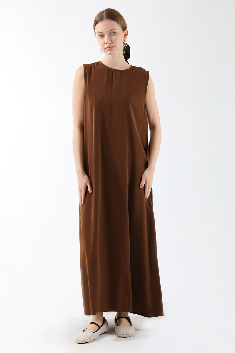 Sıfır Kol Uzun İçlik Elbise Acı Kahve. Sıfır kol elbise içlik/astar arkadan gizli fermuarlıdır.. Sıfır yaka detayı ile kolay kullanıma sahiptir. Kumaşı medine ipeği olup dört mevsim kullanabilirsiniz.