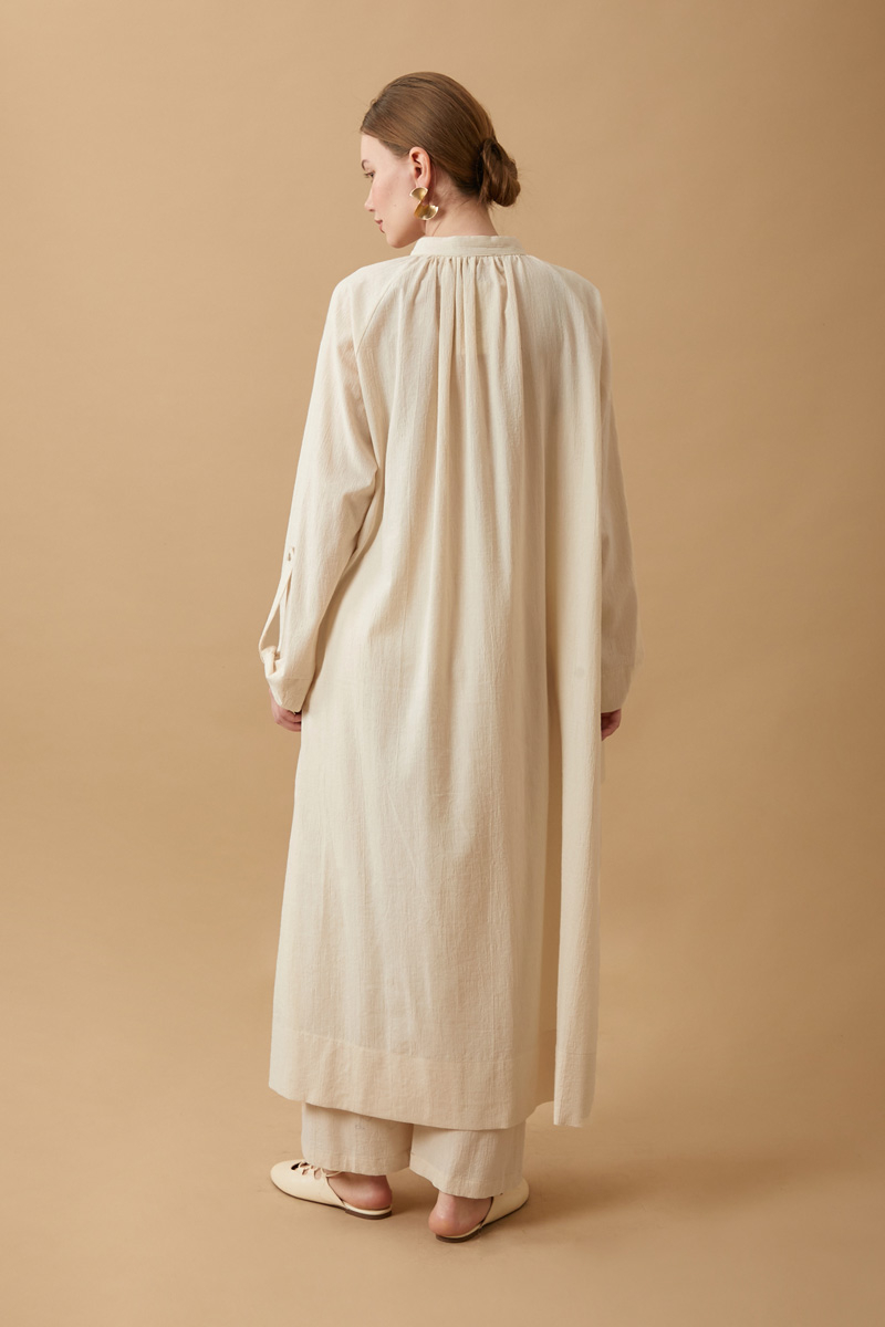 The loose fit of the tunic allows freedom of movement, while the straight-cut pants complete the elegant look. Perfect for both seaside and city wear, this set is the key to a simple yet striking style.