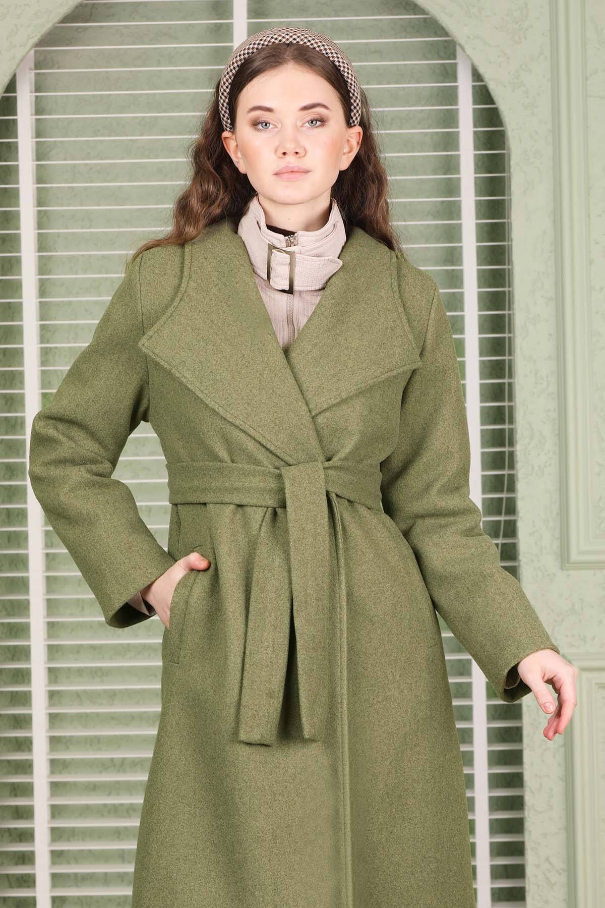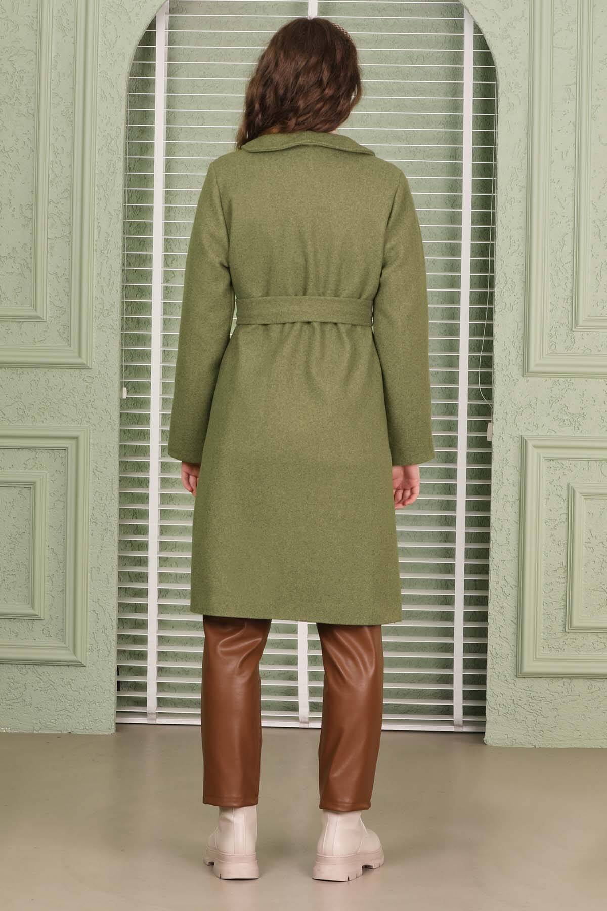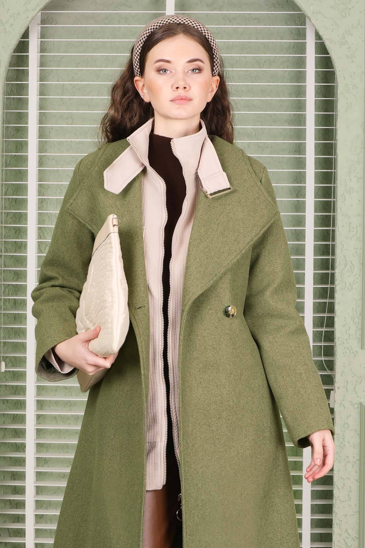 Single Button Cachet Coat Green. It has an oval English wide collar and a one-button double-breasted closure. The trench coat is belted at the waist and has pocket details. The product is lined.