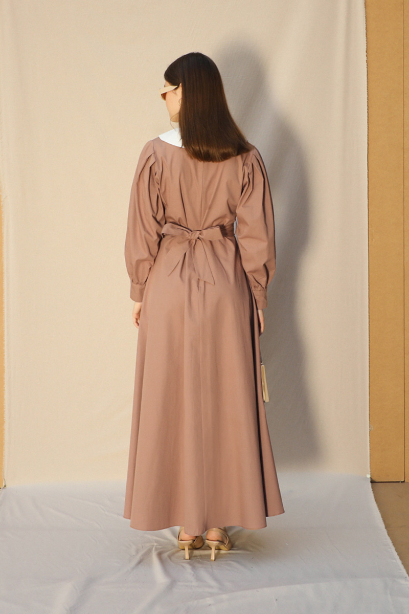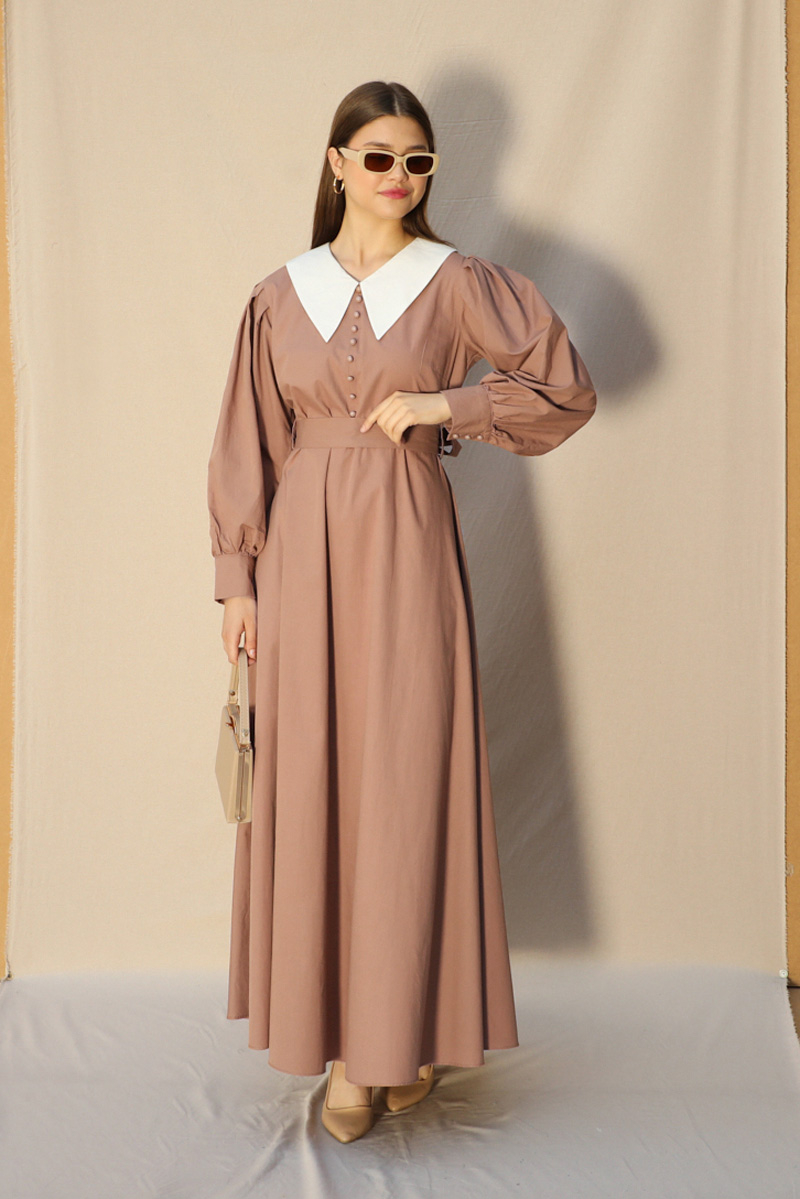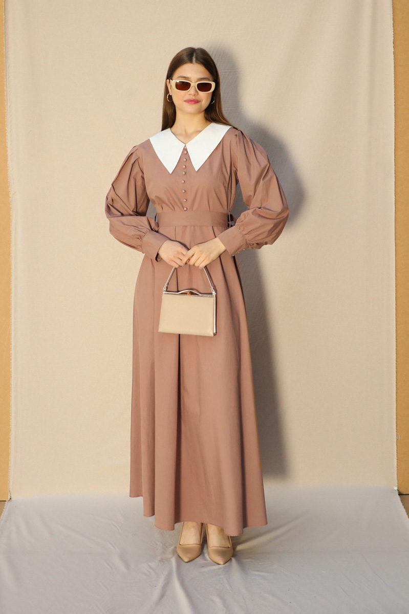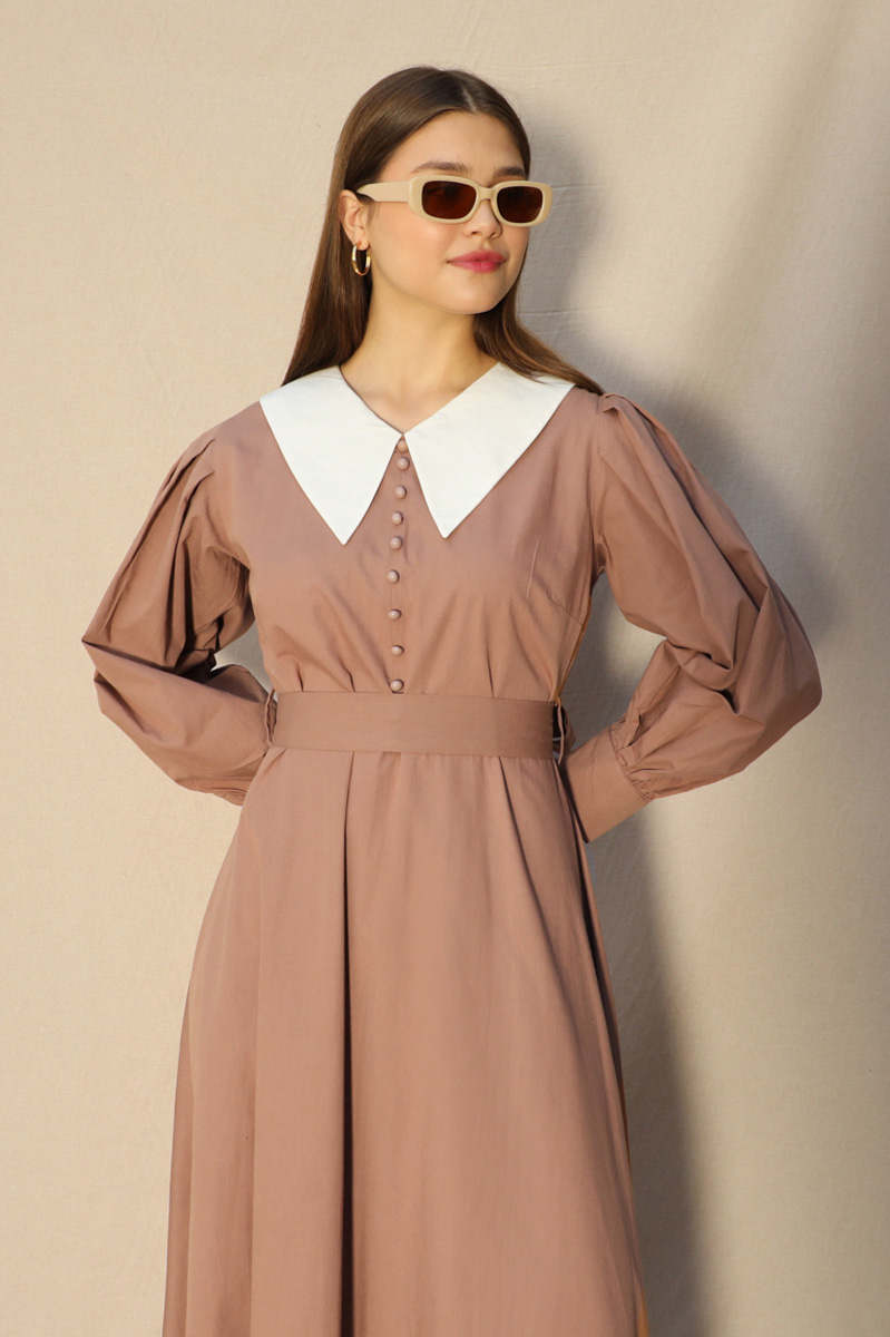 Sivri Bebe Yaka Elbise Koyu Somon.Yaka bele kadar süs düğmelidir, kolu balon koldur, arkadan fermuarlıdır, belden kuşaklıdır, astarsızdır.