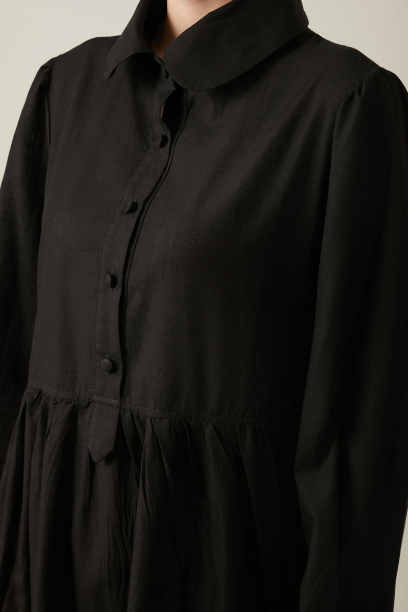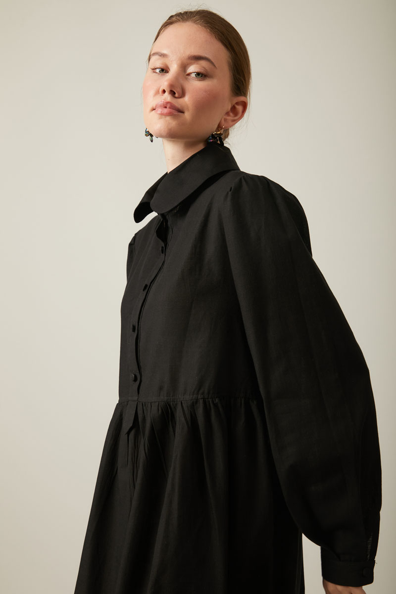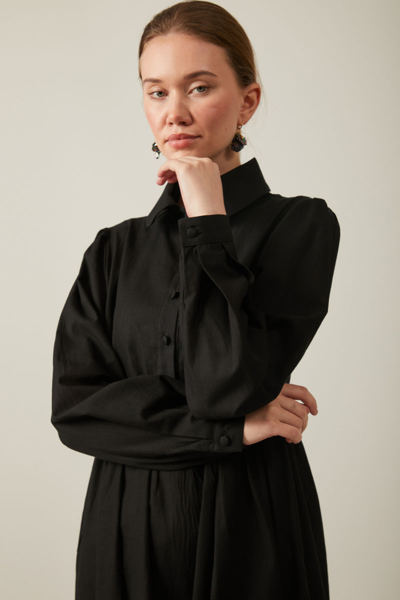 Reflecting the harmony of classic and modern lines, the Slub Cotton Dress in Navy Blue offers both elegance and everyday comfort. The shirt collar adds a refined, formal touch, while the full-length button closure ensures ease of wear and a stylish appearance. The gathered waistband accentuates the relaxed drape of the dress, creating a feminine silhouette that flatters every body type.