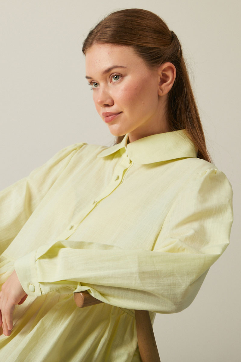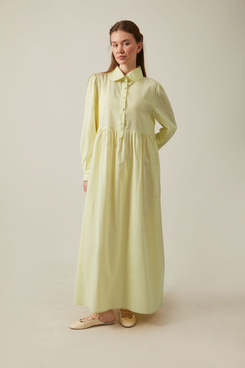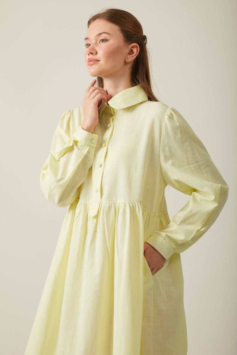Reflecting the harmony of classic and modern lines, the Slub Cotton Dress in Navy Blue offers both elegance and everyday comfort. The shirt collar adds a refined, formal touch, while the full-length button closure ensures ease of wear and a stylish appearance. The gathered waistband accentuates the relaxed drape of the dress, creating a feminine silhouette that flatters every body type.