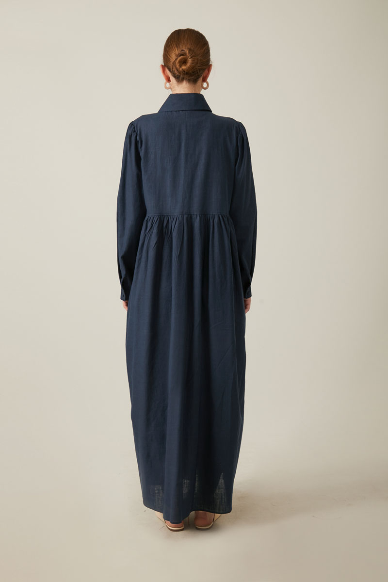Reflecting the harmony of classic and modern lines, the Slub Cotton Dress in Navy Blue offers both elegance and everyday comfort. The shirt collar adds a refined, formal touch, while the full-length button closure ensures ease of wear and a stylish appearance. The gathered waistband accentuates the relaxed drape of the dress, creating a feminine silhouette that flatters every body type.