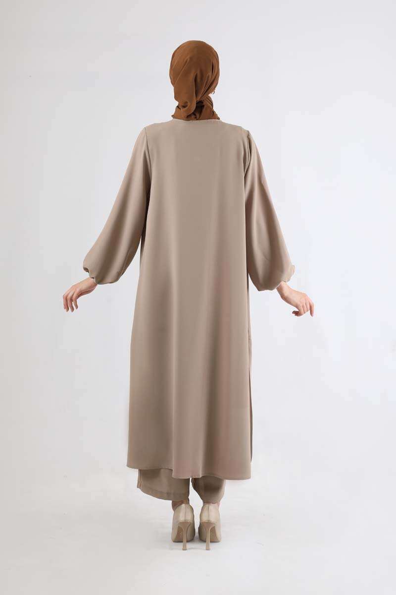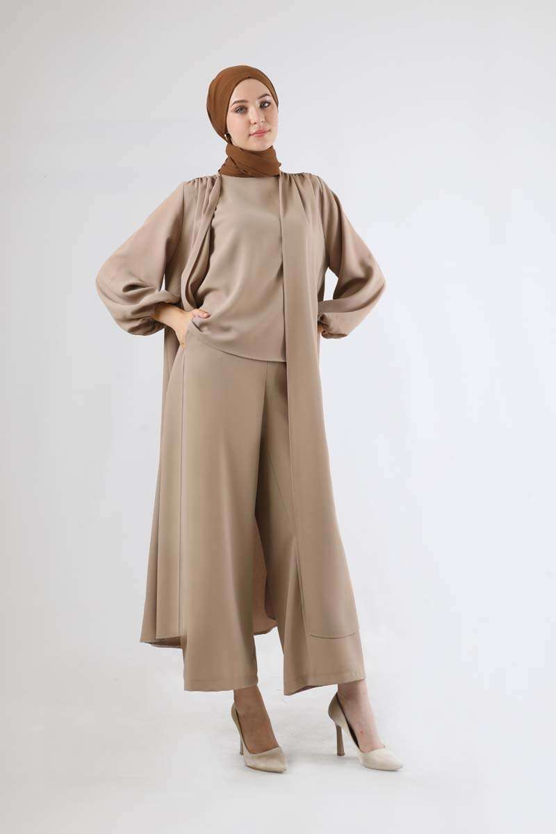 Soft Kimono Takım Bej. İç bluz, geniş paça pantolon ve abaya olmak üzere üç parçadan oluşur. Bluz bisiklet yakalıdır. abaya manşetleri lastiklidir. pantolon bol paçadır. Şık olan ürüne özel günlerinizde tercih edebilirsiniz.