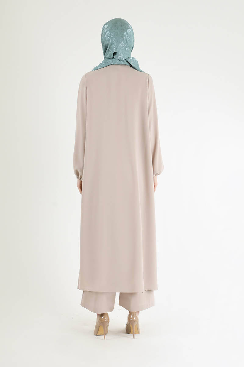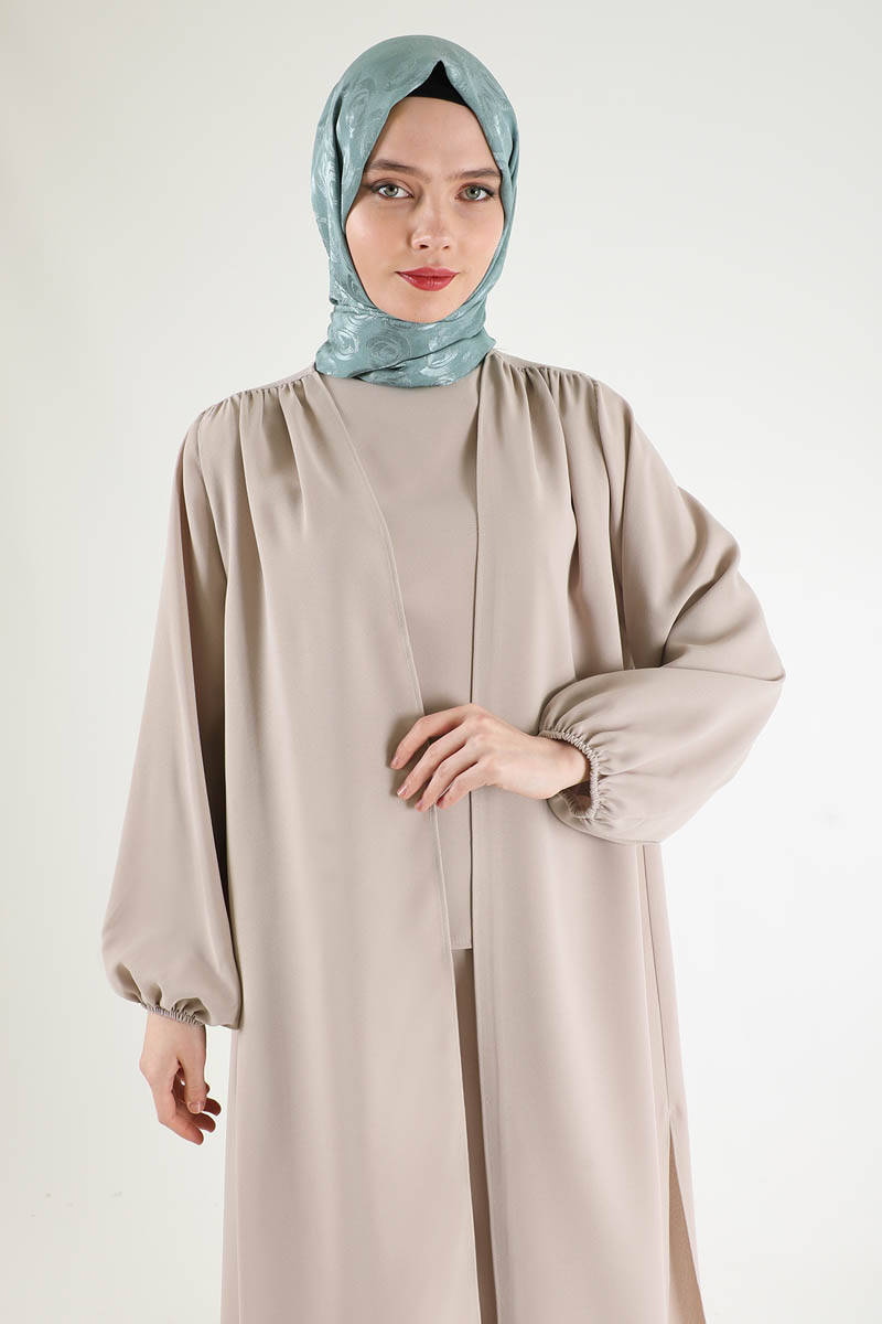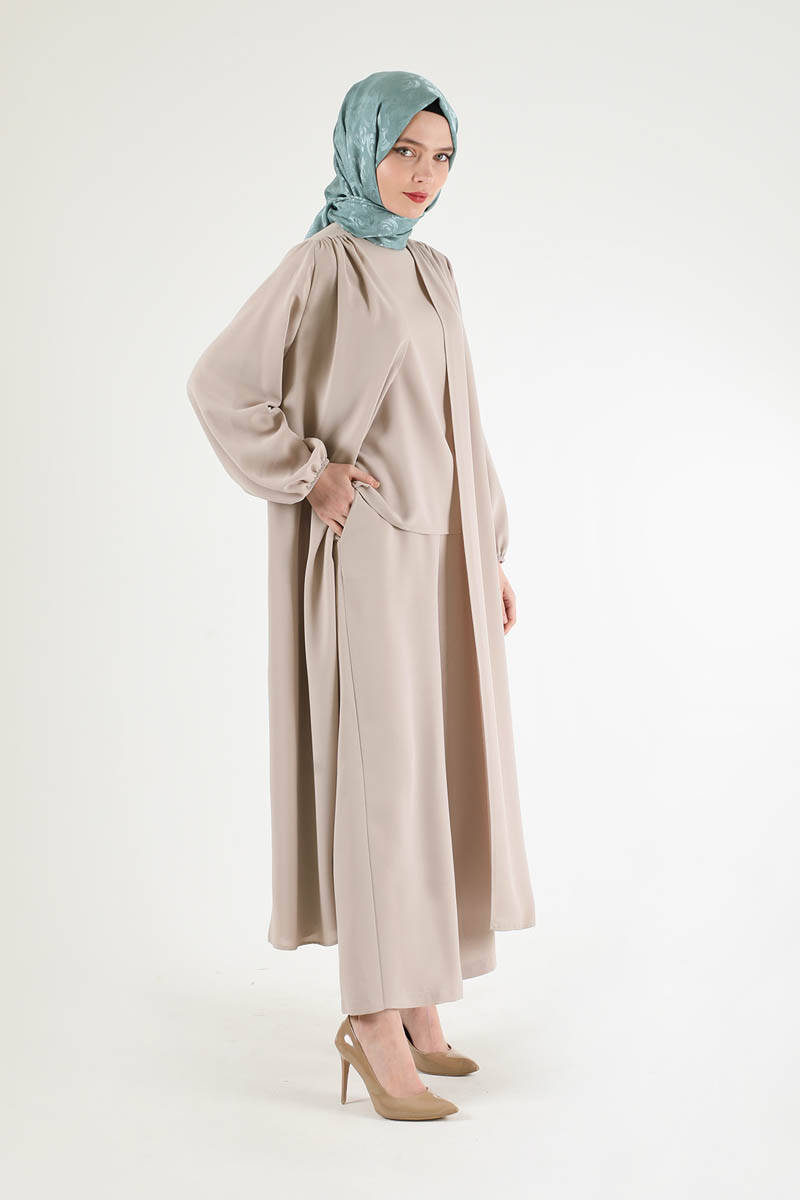 Soft Kimono Takım Krem. İç bluz, geniş paça pantolon ve abaya olmak üzere üç parçadan oluşur. Bluz bisiklet yakalıdır. abaya manşetleri lastiklidir. pantolon bol paçadır. Şık olan ürüne özel günlerinizde tercih edebilirsiniz.