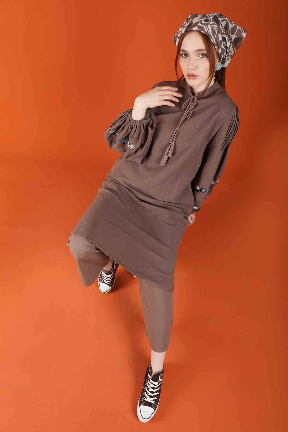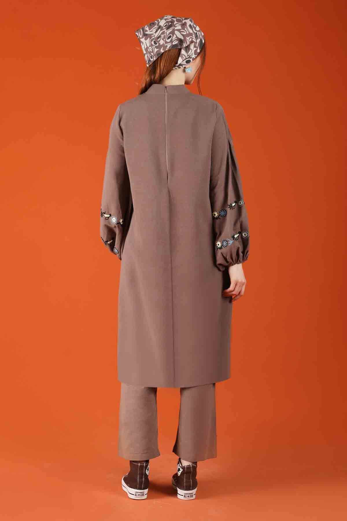 Lace-up collar, elastic cuffs. The sleeves are embroidered. Sold as a set with trousers.
