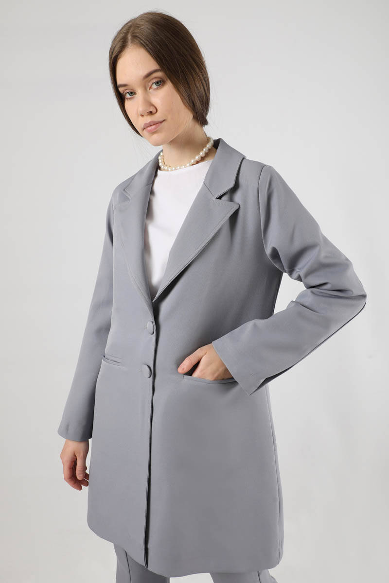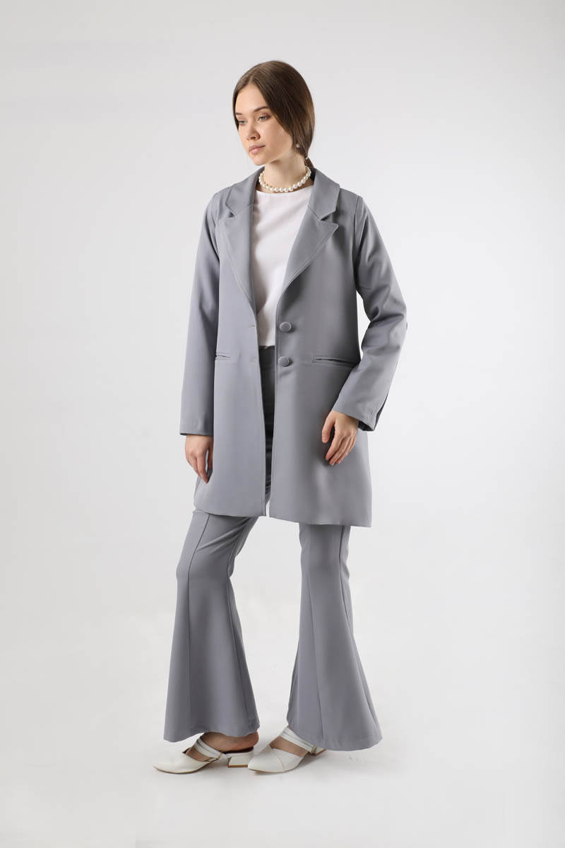 Flared Trousers Jacket & Trousers Gray. The jacket is lined. Shoulder pads. It has pockets. The cover must be buttoned. The jacket has slit detail. The trousers are flared. The waist is elastic. You can choose it for your daily use and special occasions.